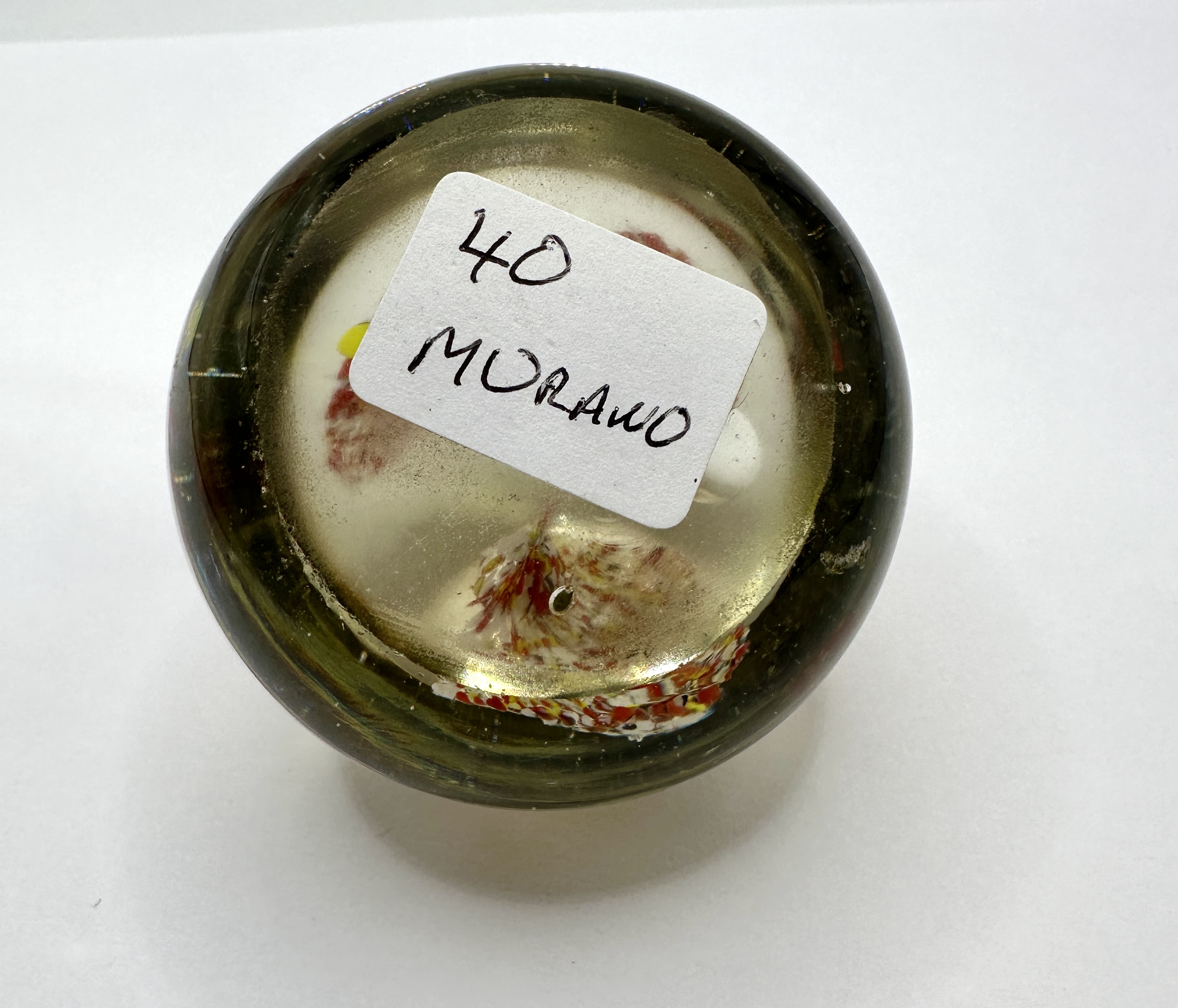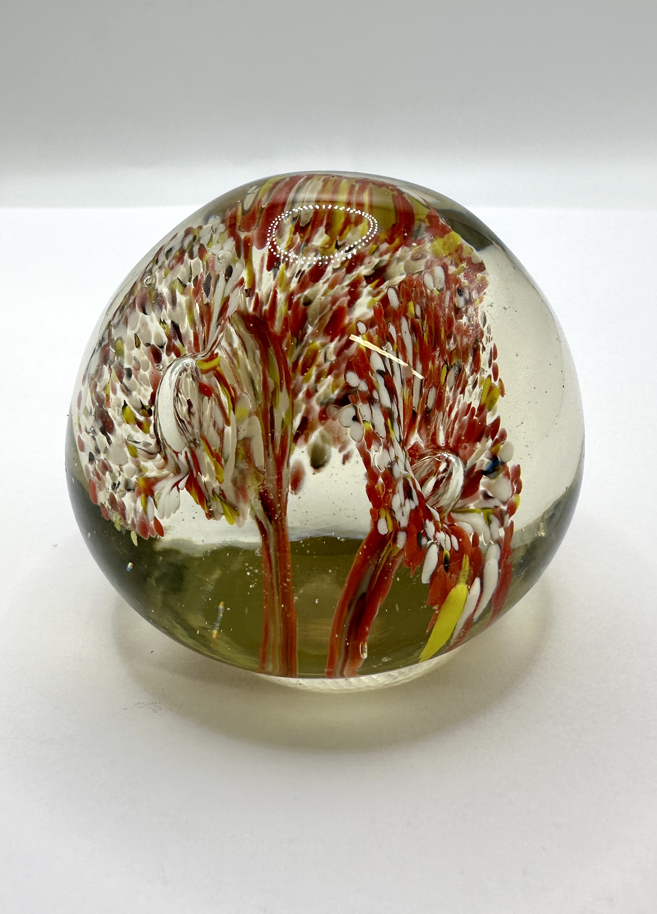 A spherical art glass paperweight featuring internal, stylised tree or floral motifs composed of red, white, and yellow frit and cane work set above a green-tinted base. The design is encased in a thick clear glass sphere and accented by a circular ring of controlled air bubbles near the crown. The piece is constructed from hand-blown glass and features a ground and polished base. The underside retains a white adhesive label handwritten with 40 MURANO.