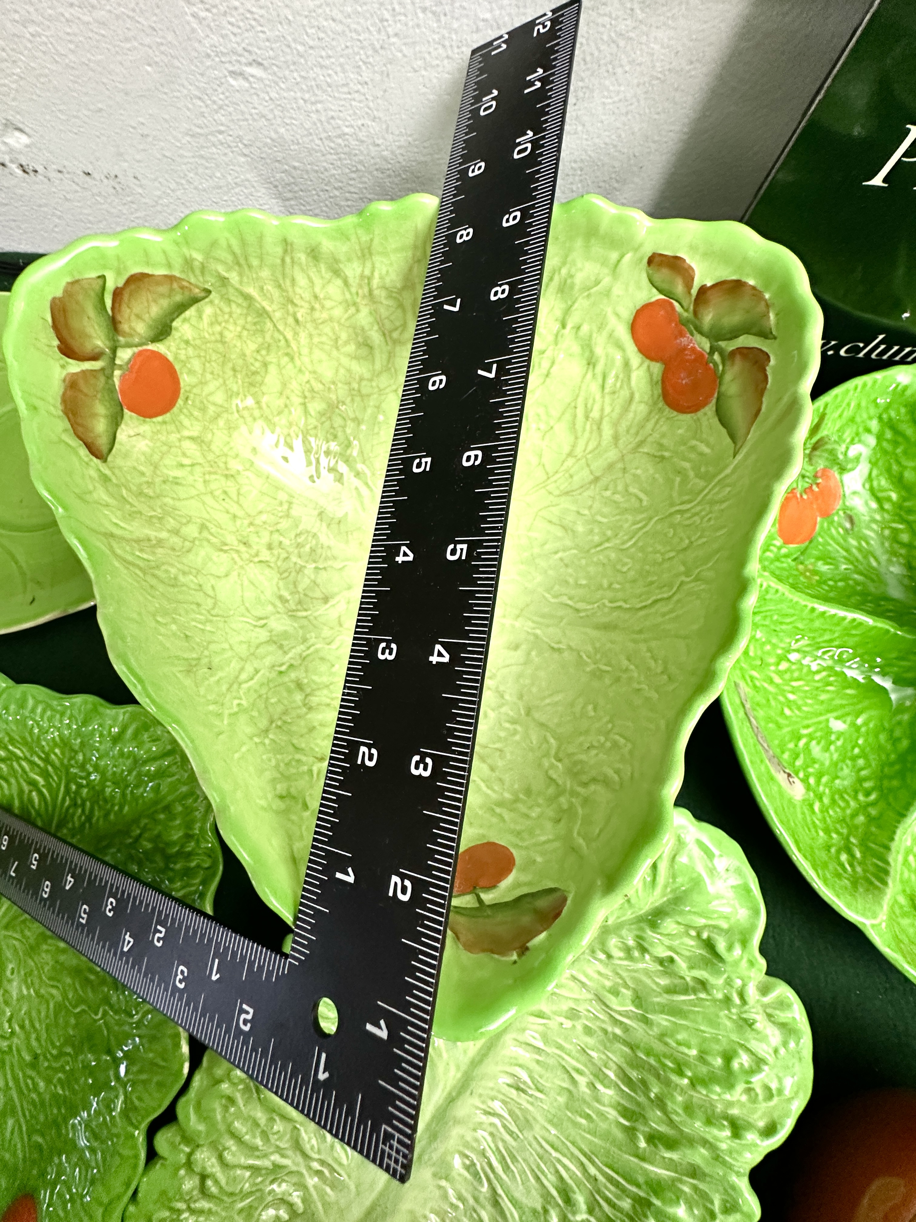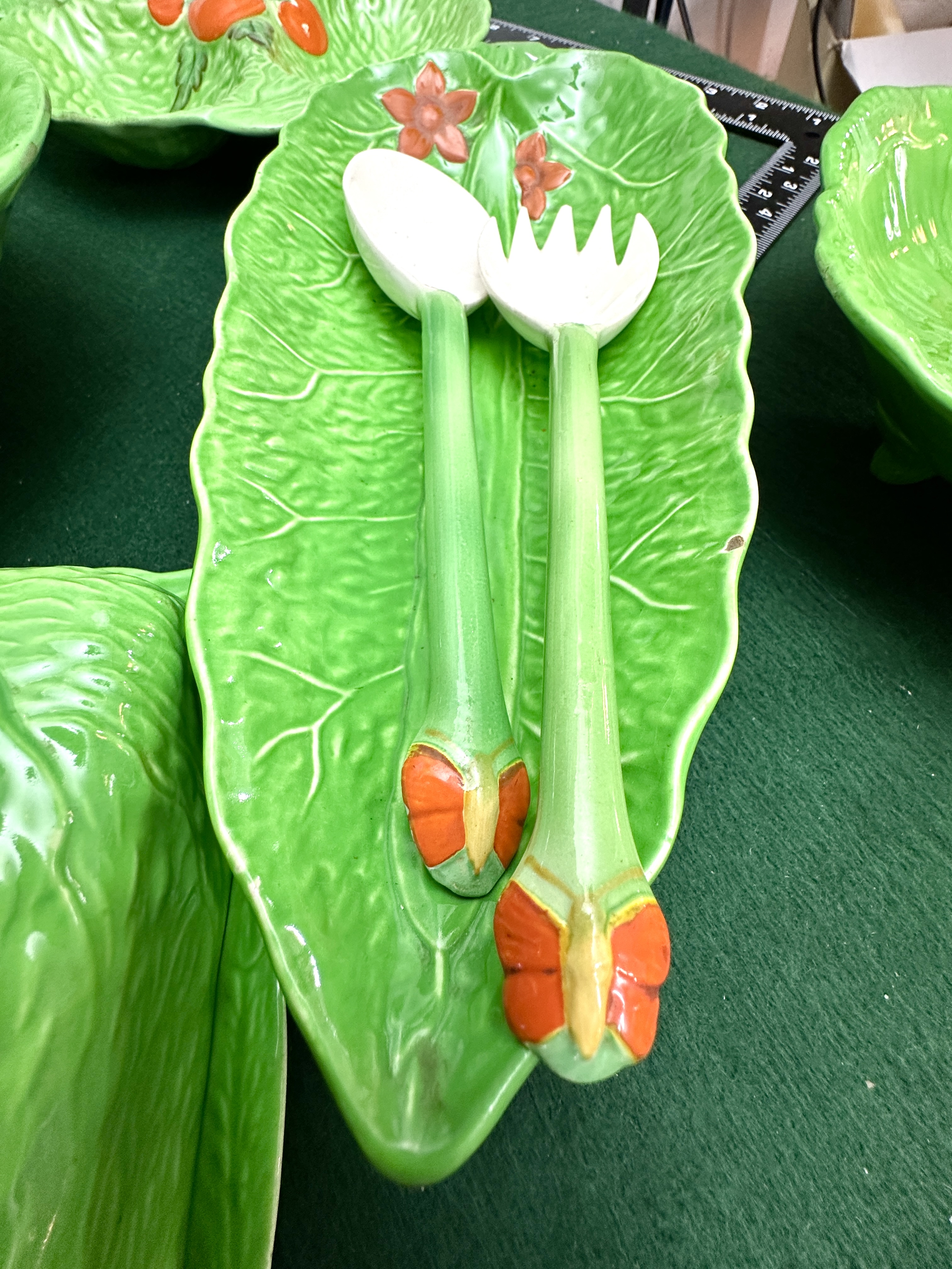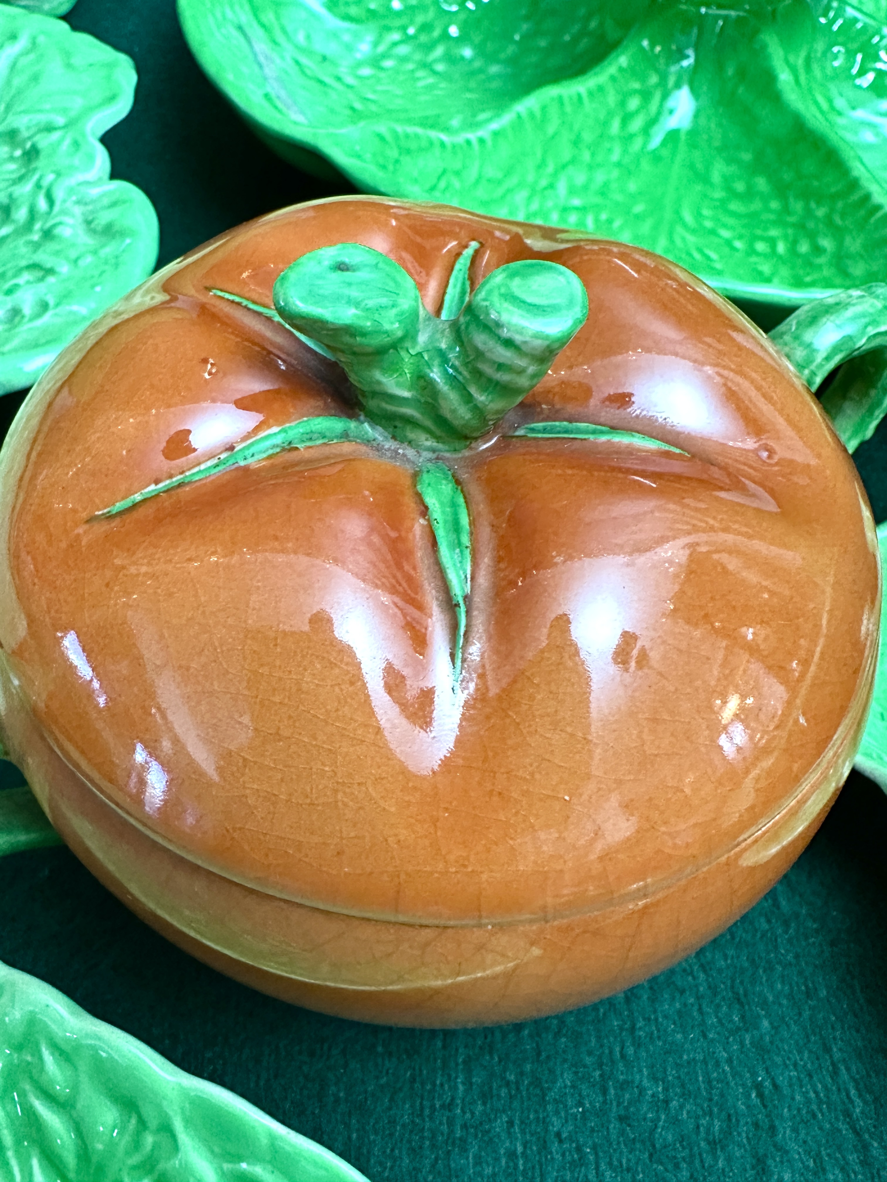 A collection of vintage naturalistic glazed ceramic tableware and serveware, designed with a cabbage leaf and tomato motif. The assortment includes various serving bowls, platters of diverse shapes and sizes, a lidded vessel shaped as a tomato, a butter dish with cover, a sauce boat with stand, and a pair of leaf-themed salad servers. The pieces are finished in vibrant green glazes with moulded textures replicating leaf veins. Several items feature moulded red tomato or orange fruit accents, while one platter displays an off-white textured ground. No manufacturer’s marks are visible.