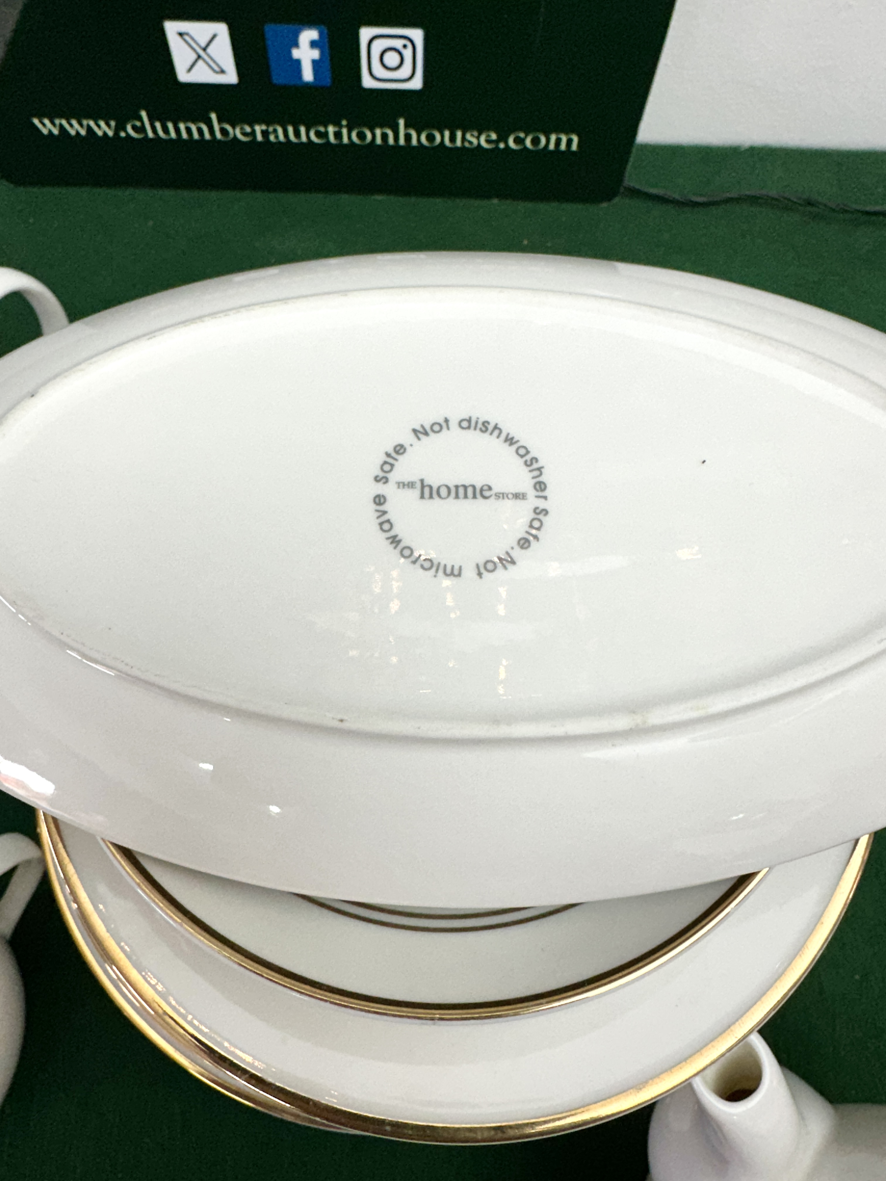A collection of white porcelain dinner and tea ware by The Home Store. The items feature a minimalist design with triple gold-toned banded decoration to the rims and bodies. The set comprises dinner plates, side plates, saucers, and teacups, accompanied by a coffee pot with lid, a covered sugar bowl, and a cream jug. An additional teapot of lobed form with floral decoration and gilt highlights is also present. The primary pieces bear a circular backstamp for The Home Store specifying that the items are not dishwasher or microwave safe.