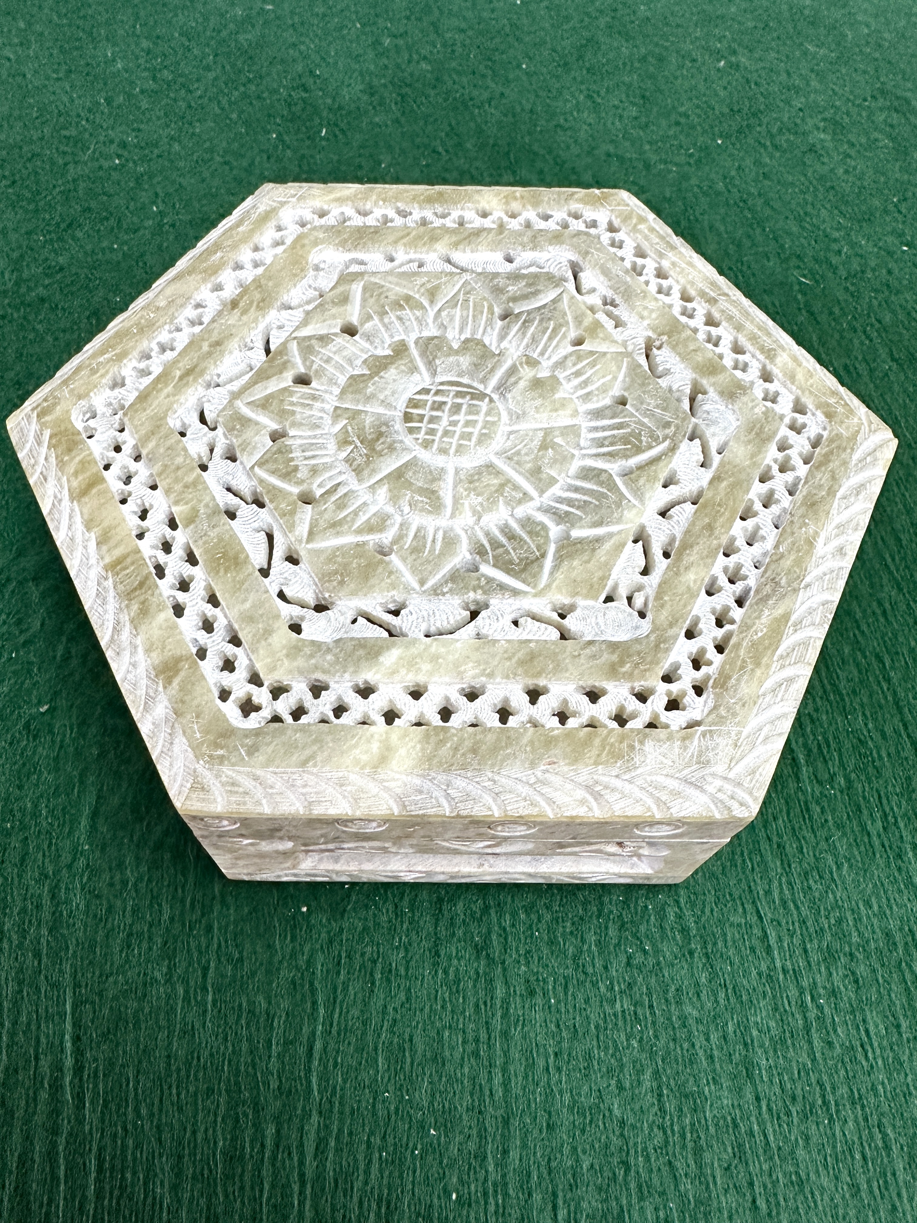 A Novica artisan handmade soapstone jewellery box in the Wings pattern, crafted in India. The hexagonal hinged box is made from variegated light-coloured soapstone and features traditional jali openwork. The lid is decorated with a central hand-carved lotus floral motif, bordered by concentric hexagonal bands of geometric piercings and foliate scrollwork. The sides of the box are similarly embellished with carved decorative patterns. The interior shows the natural texture of the stone with visible tooling marks from the carving process.