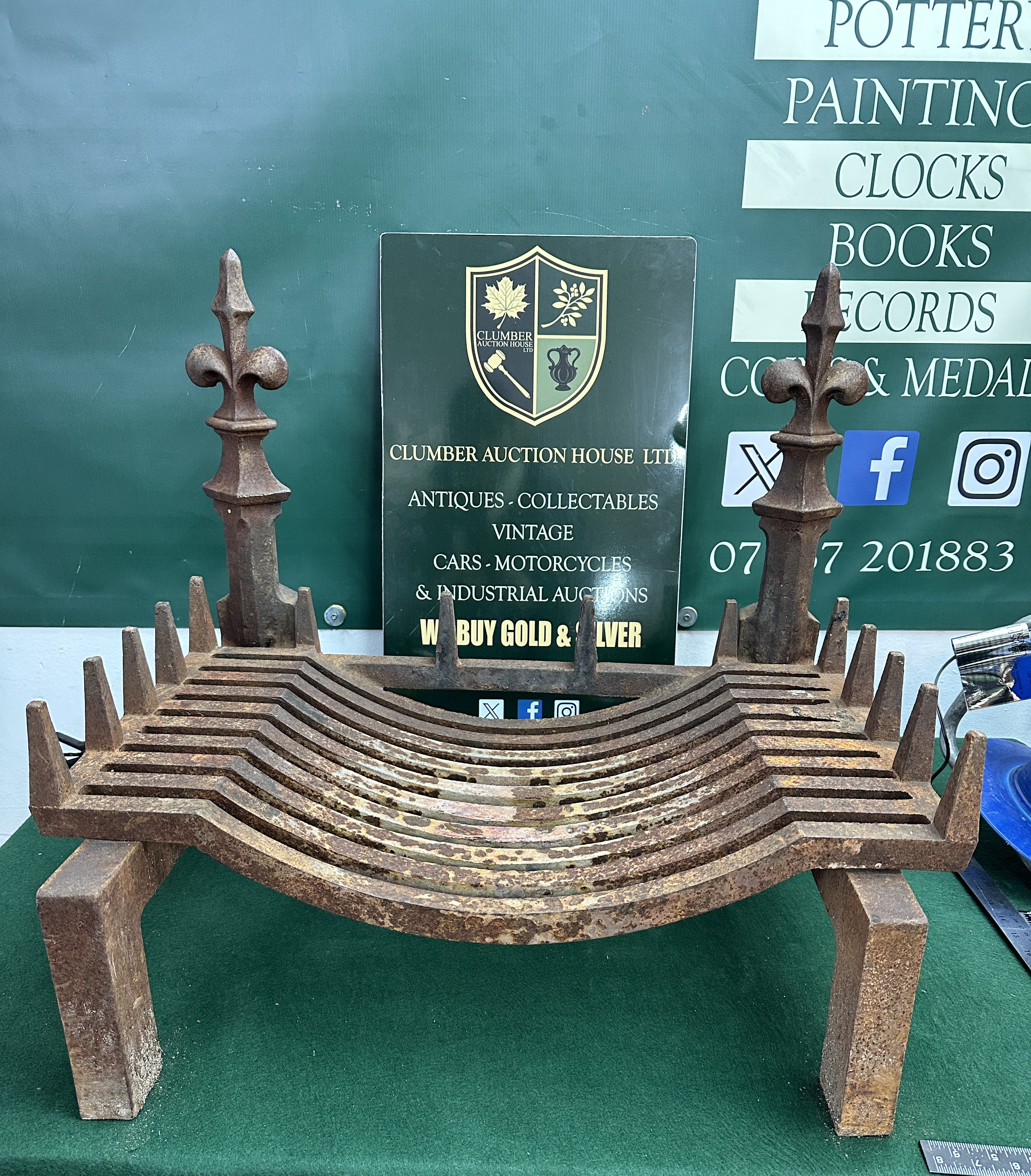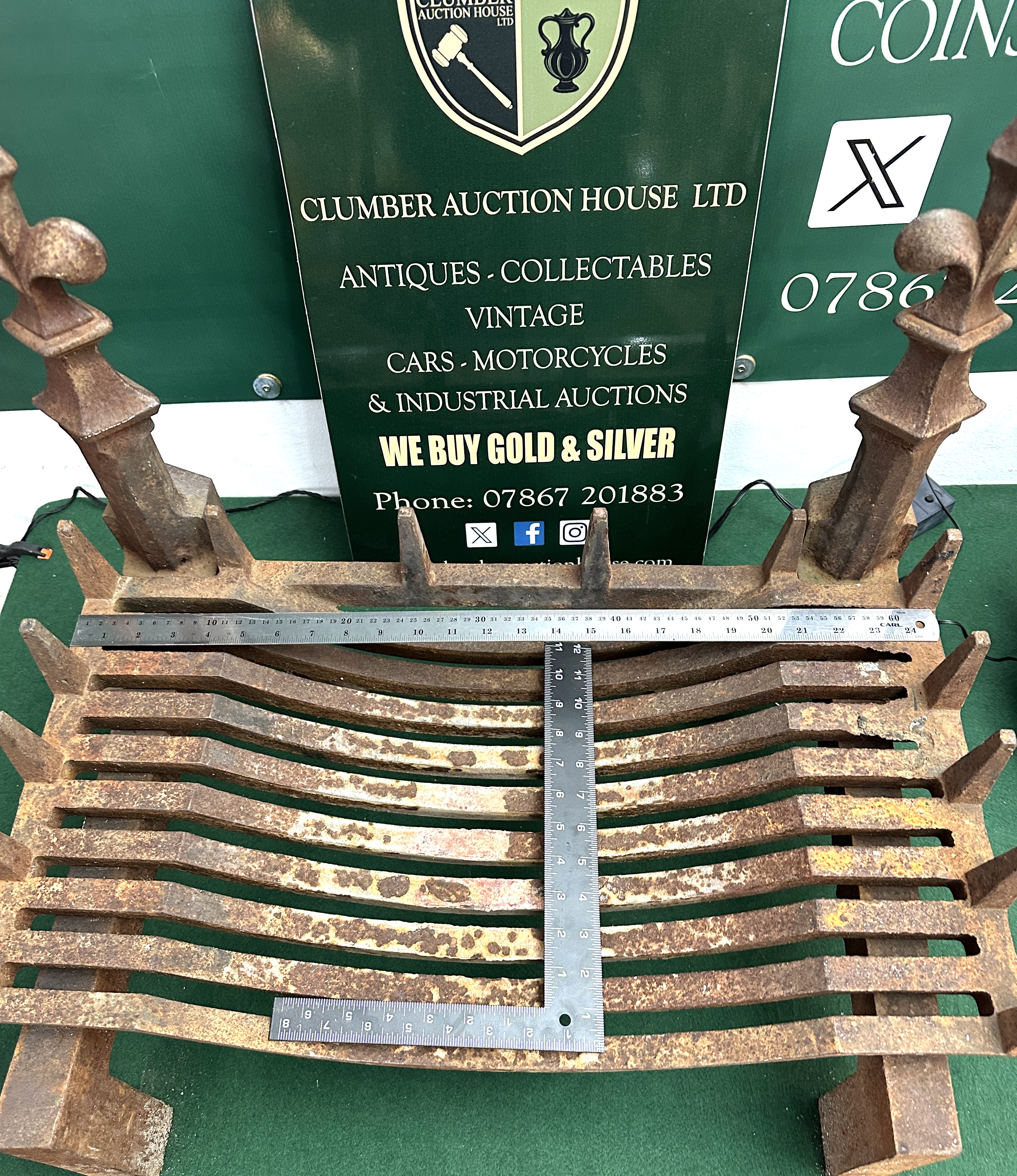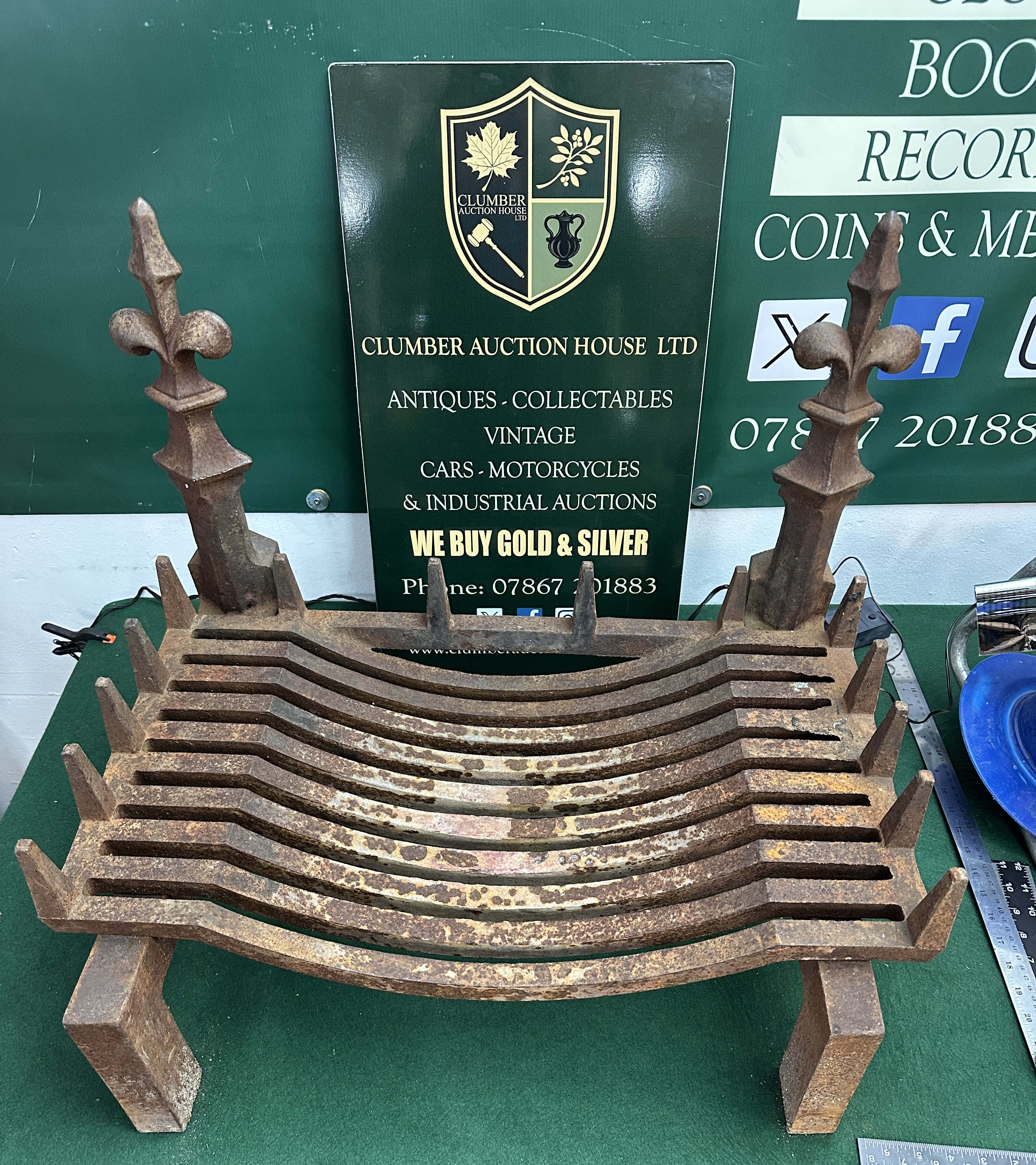 Two items comprising an English Art Nouveau cast iron fire basket and a 2003 United Kingdom silver proof one-pound coin. The fire grate is of cast iron construction featuring a bowed-basket design with integrated andirons. The andirons are surmounted by decorative fleur-de-lis finials. The accompanying coin is a 2003 United Kingdom silver proof one-pound coin struck in 925 silver. The coin is housed in a clear protective capsule and presented in its original blue hardshell display case with a black velvet-lined interior. The lot includes the official Certificate of Authenticity.