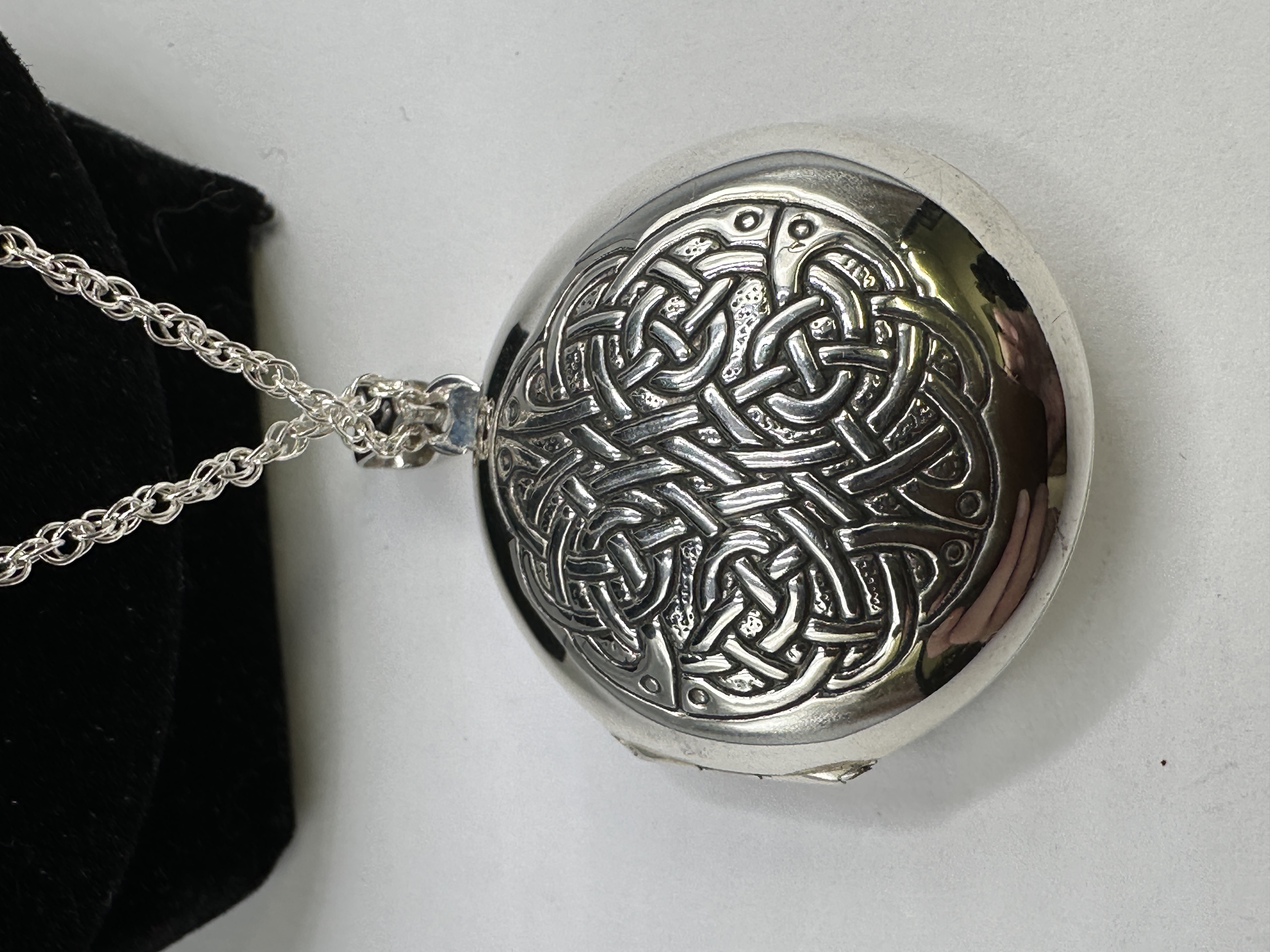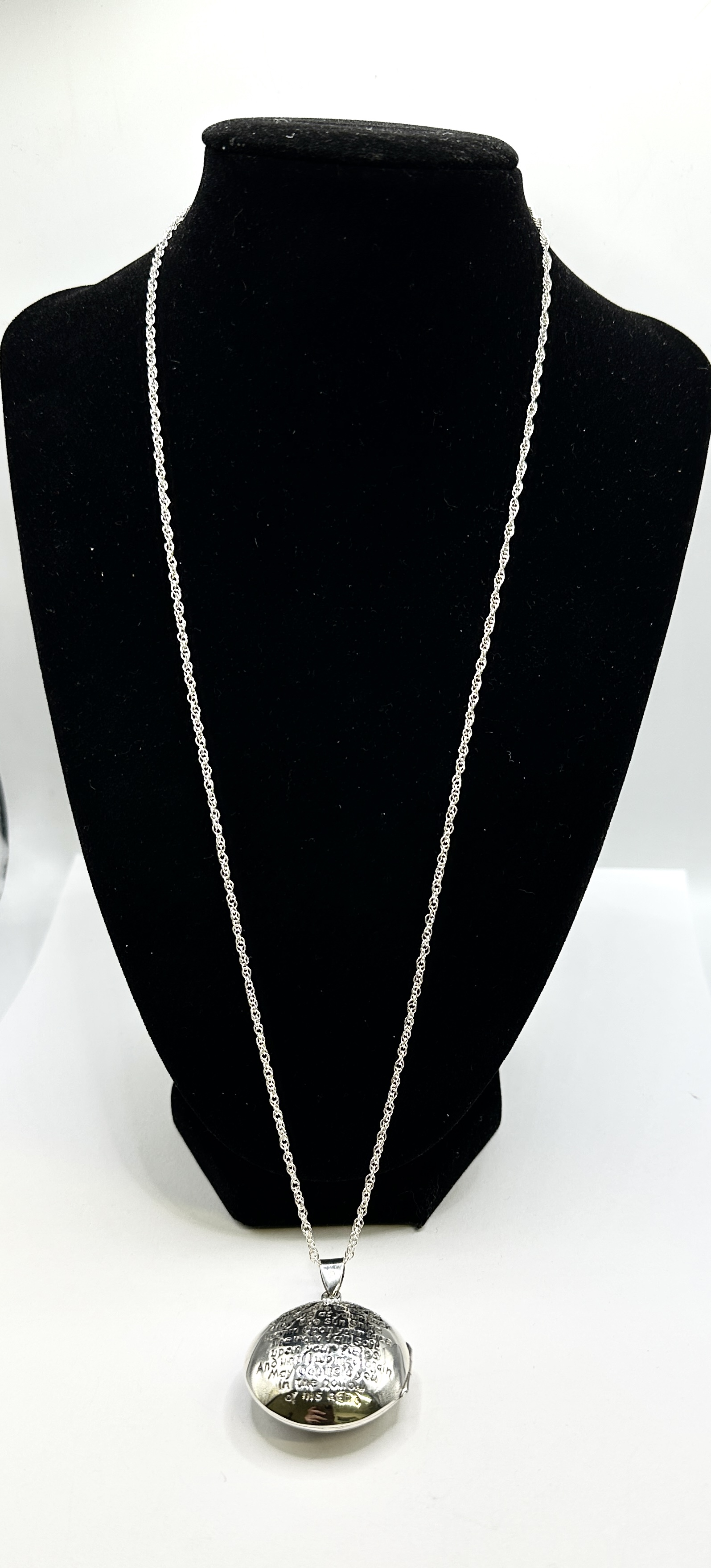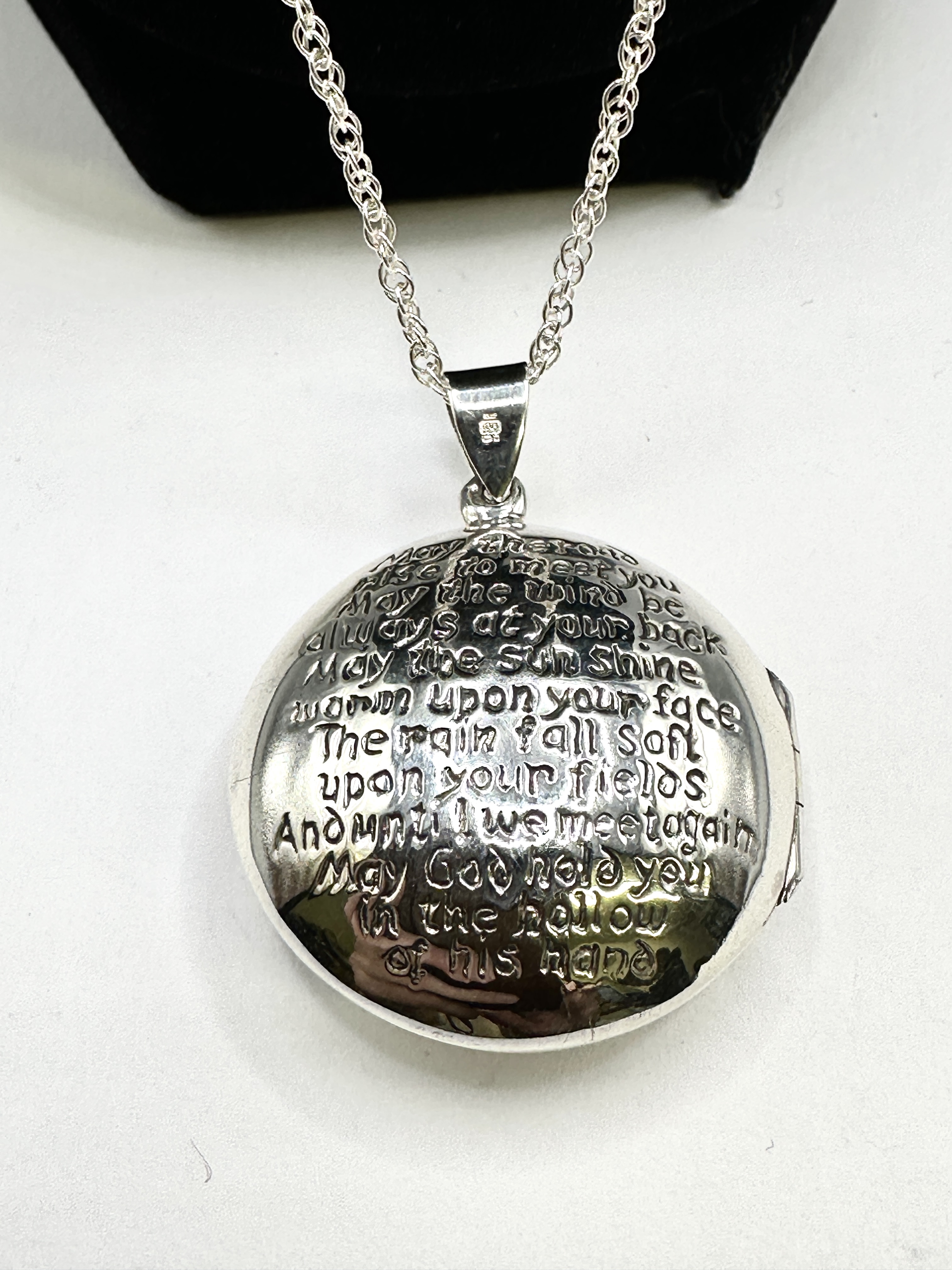 A 925 silver locket of circular form suspended from a long rope chain. The obverse face is embossed with the text of a traditional Irish blessing. The reverse displays an intricate Celtic knotwork design in relief. The locket features a hinged side and a tapered bail. The bail is stamped with a 925 hallmark.