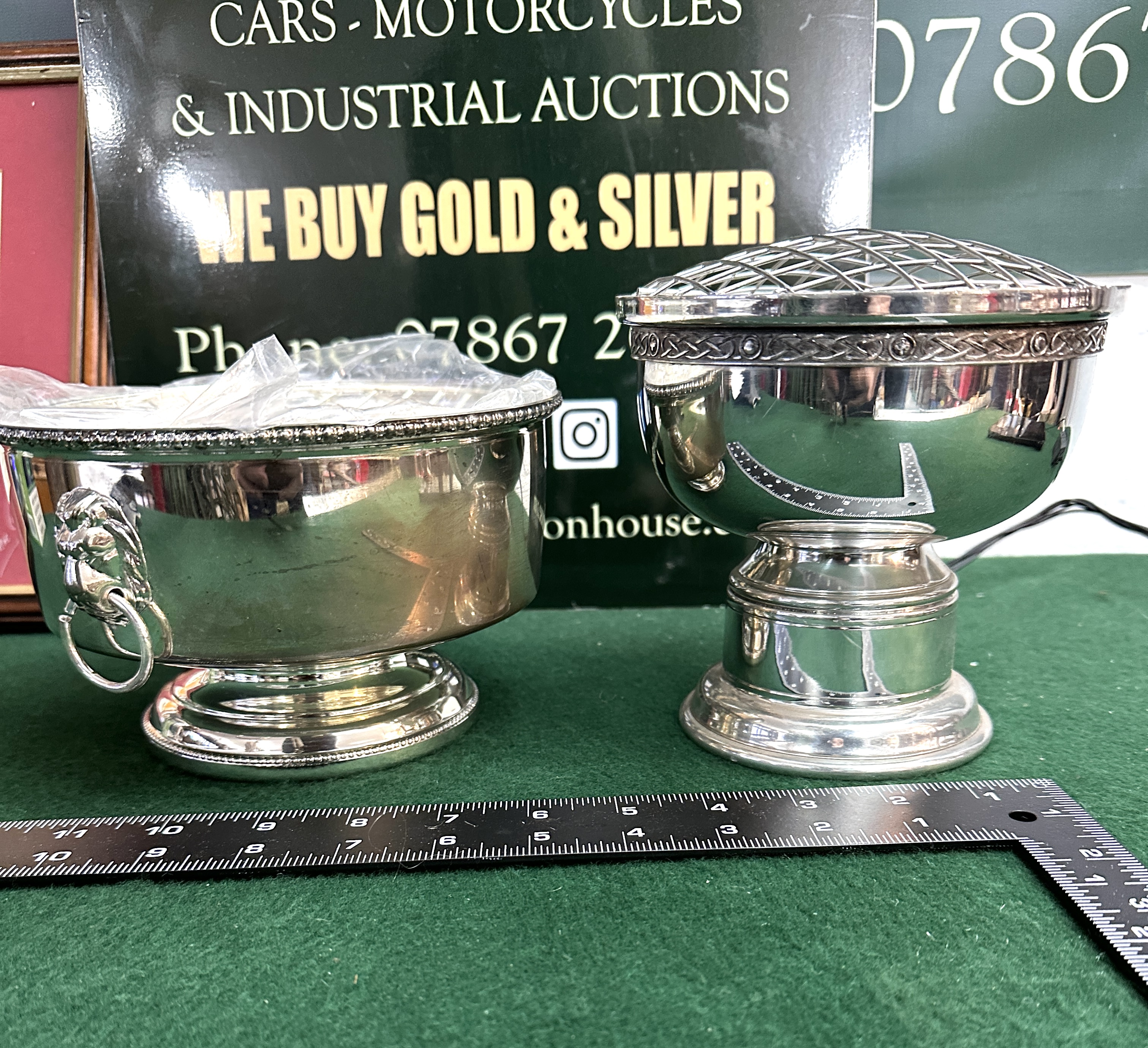 A group of two silver-toned metal decorative vessels comprising a monteith-style bowl and a rose bowl. The monteith-style bowl is of footed form featuring twin lion-mask drop ring handles and beaded decoration to the rim and base. The rose bowl is set upon a pedestal base and is fitted with a removable wire mesh flower frog, featuring an embossed Celtic knotwork band below the rim. Both items exhibit a highly polished finish. No hallmarks are visible.