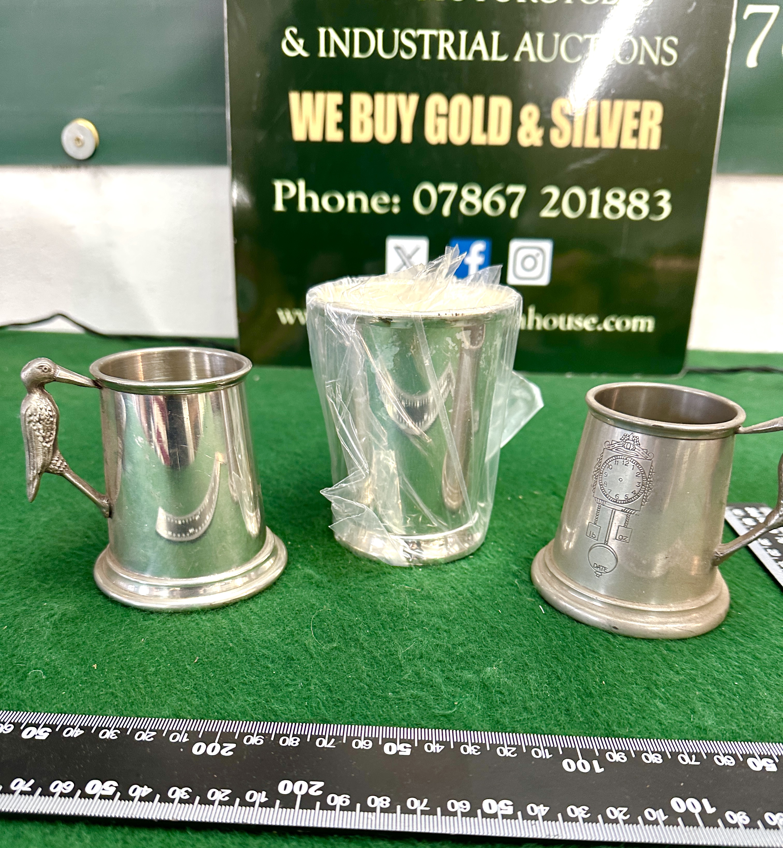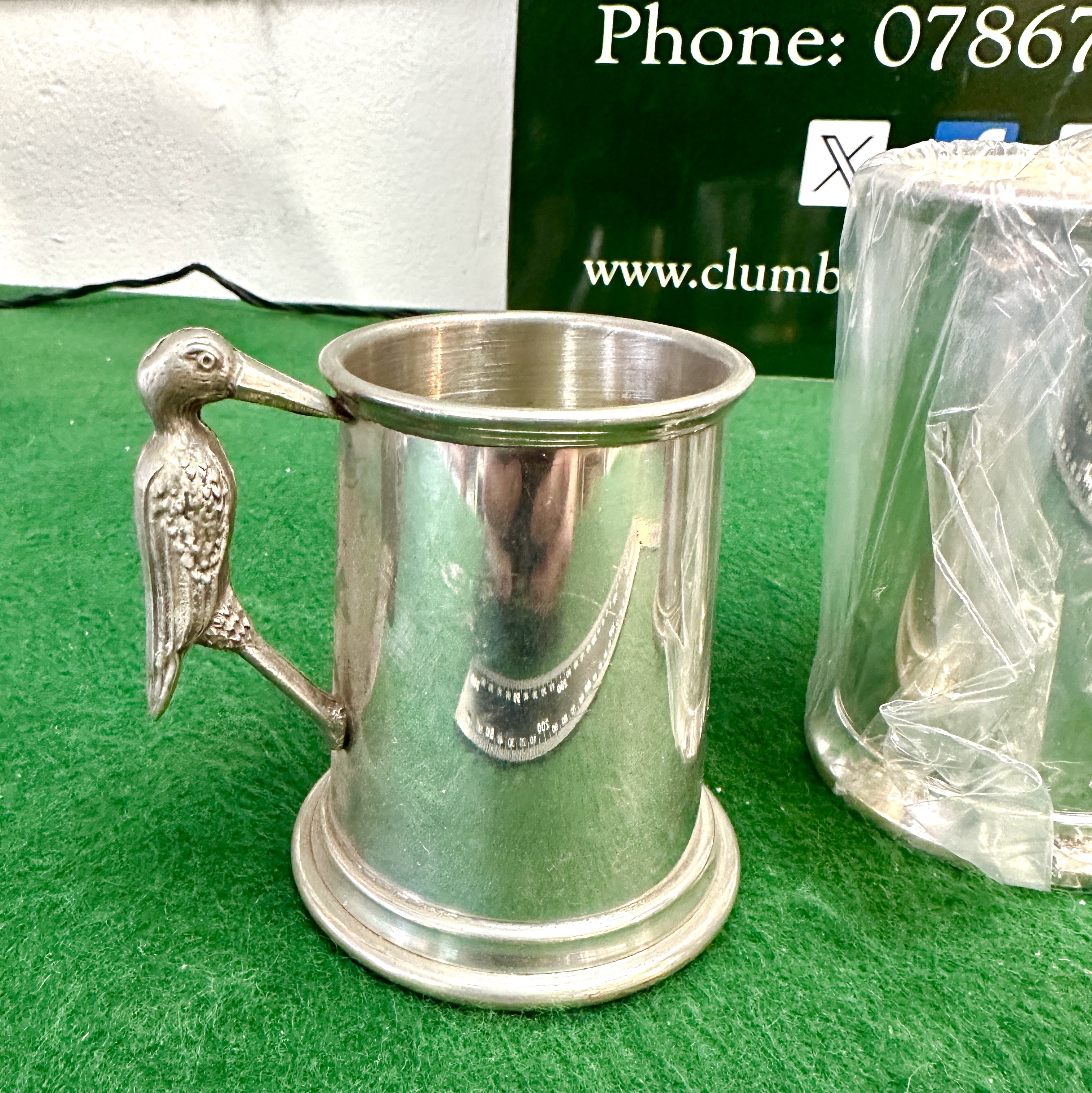 A trio of silver-plated vessels comprising a mint julep cup and two small mugs. One mug features a decorative handle cast in the form of a bird. A second mug is engraved with a commemorative birth record design depicting a grandfather clock with designated spaces for weight in pounds and ounces and a date. The third item is a tapered mint julep cup with a flared rim, partially enclosed in protective plastic wrap. All items exhibit a polished finish. No hallmarks or maker’s marks are visible.