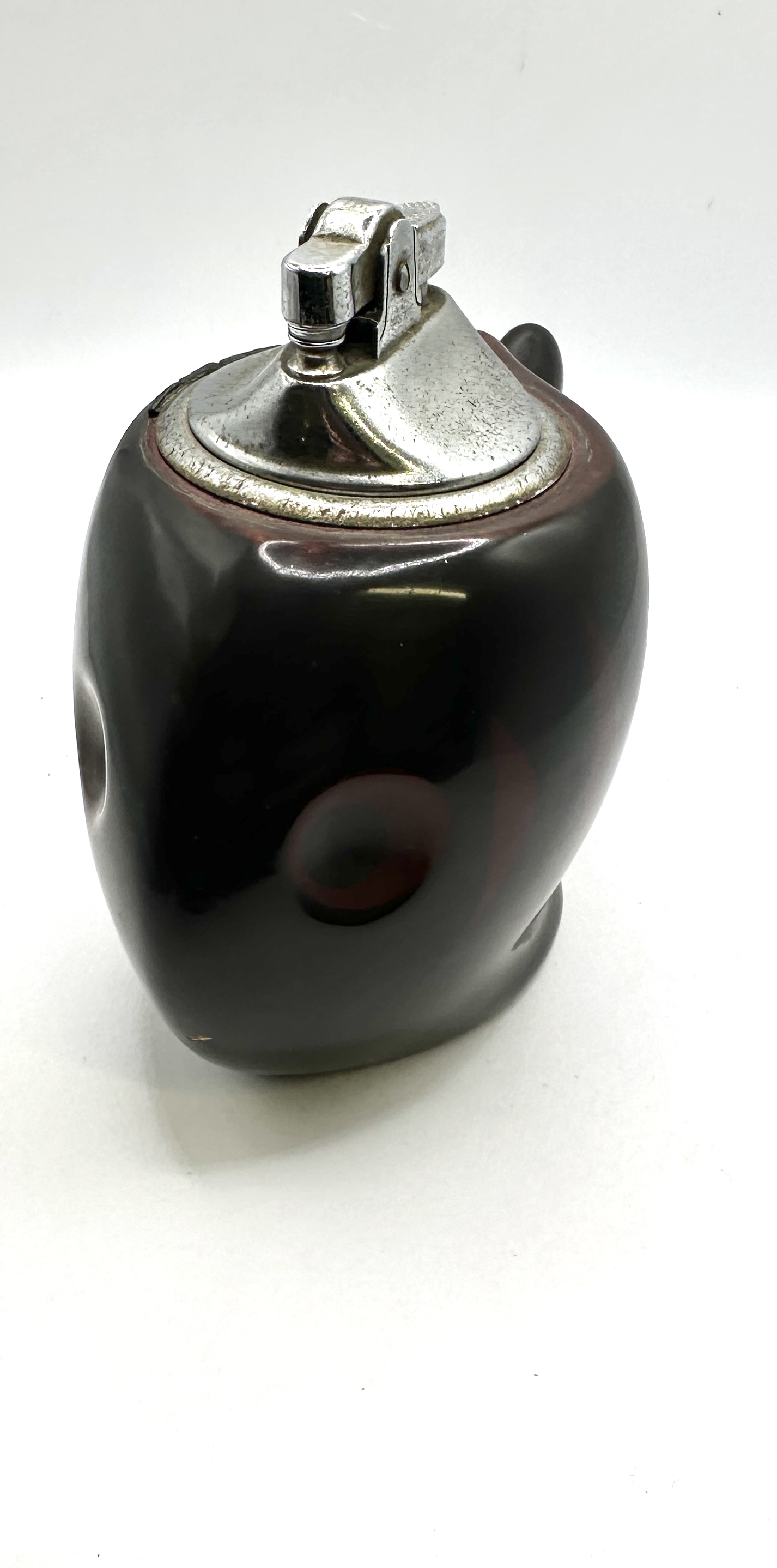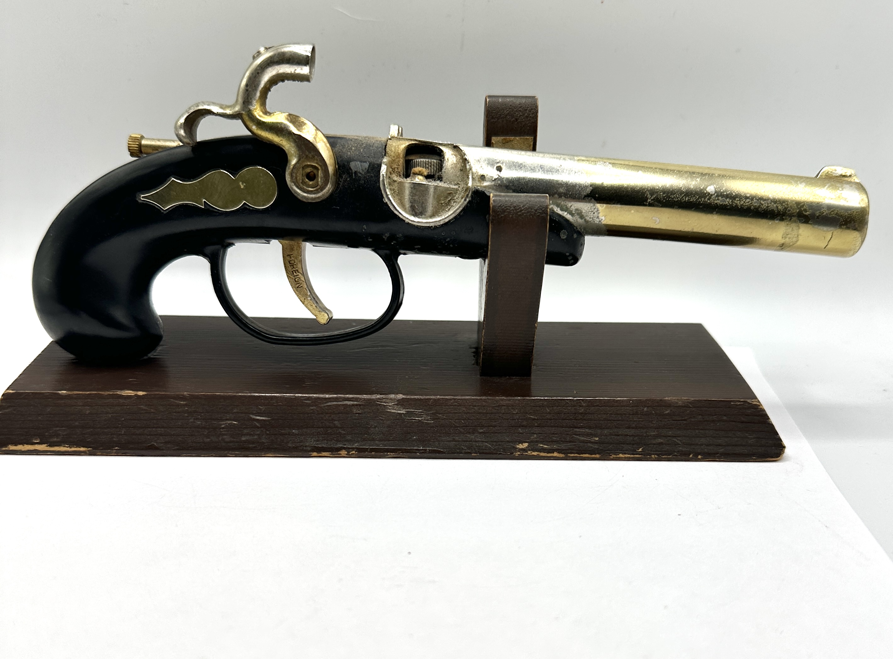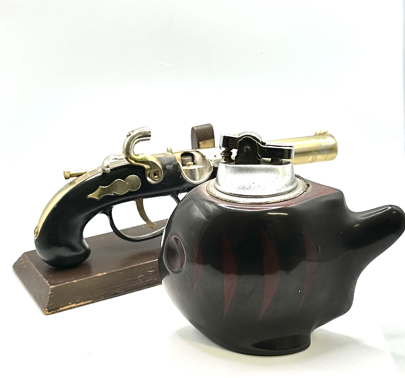 Two vintage novelty table lighters. The first is a flintlock or derringer style pistol lighter featuring a black body with a brass-toned barrel and accents. It is equipped with a silver-toned firing mechanism and is stamped with the word FOREIGN on the trigger. The lighter is mounted on a rectangular wooden display stand. The second item is a stylised fish-shaped lighter constructed from a dark, reddish-brown glazed ceramic or resin, featuring a silver-toned metal lighter insert at the top.