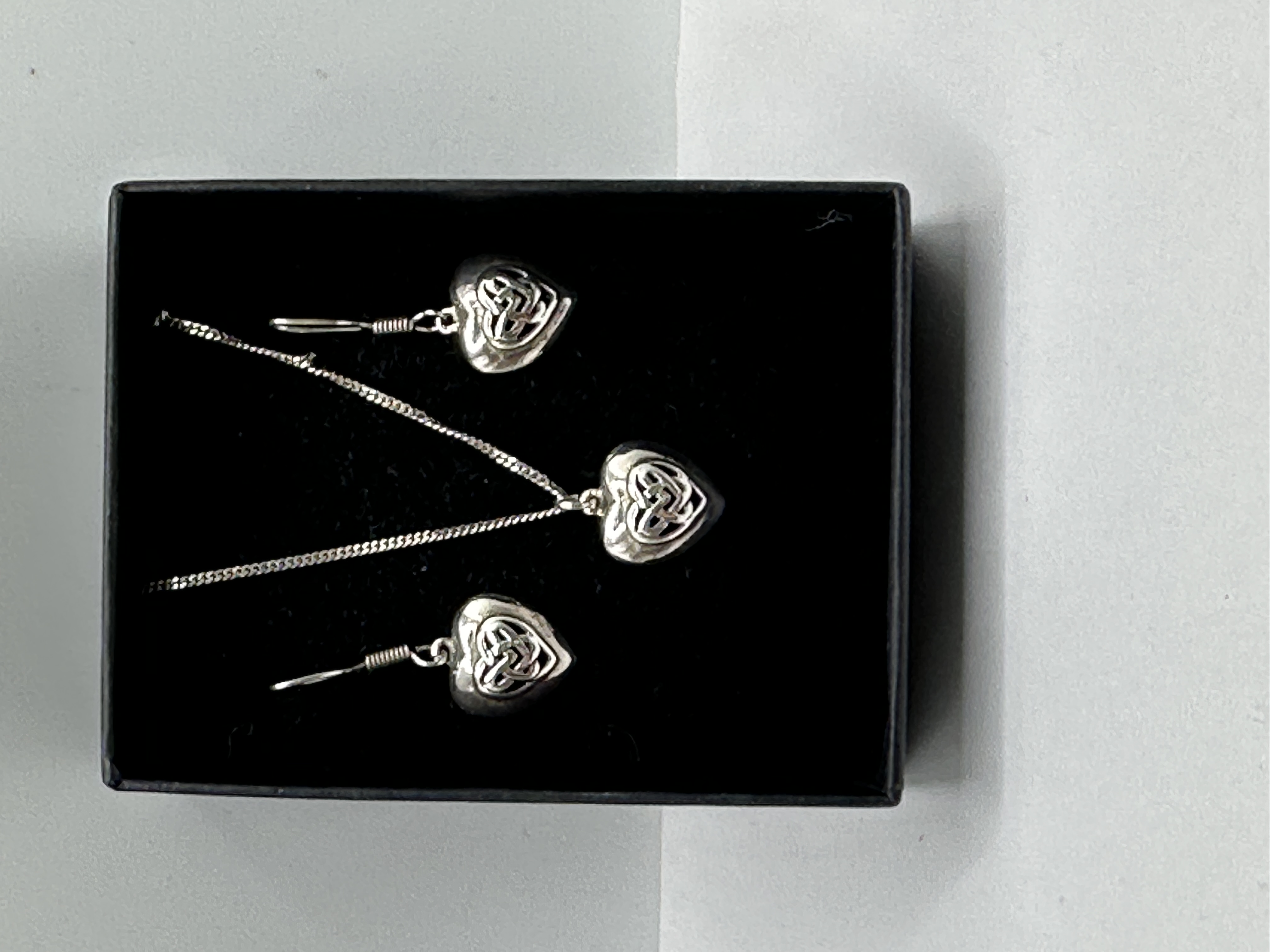 A collection of four pieces of 925 silver jewellery, executed in the Celtic Revival or Modern style. The set comprises a necklace chain, a pendant, and a pair of drop earrings. The three primary decorative elements—the pendant and the two earring drops—are heart-shaped and slightly puffed, featuring a recessed openwork motif of a continuous Celtic knot, likely a triquetra. The necklace chain is a thin curb link style. The earrings are drop-style, suspended by simple French wire (shepherd’s hook) fittings. The items are presented in a rectangular black presentation box lined with dark velvet.