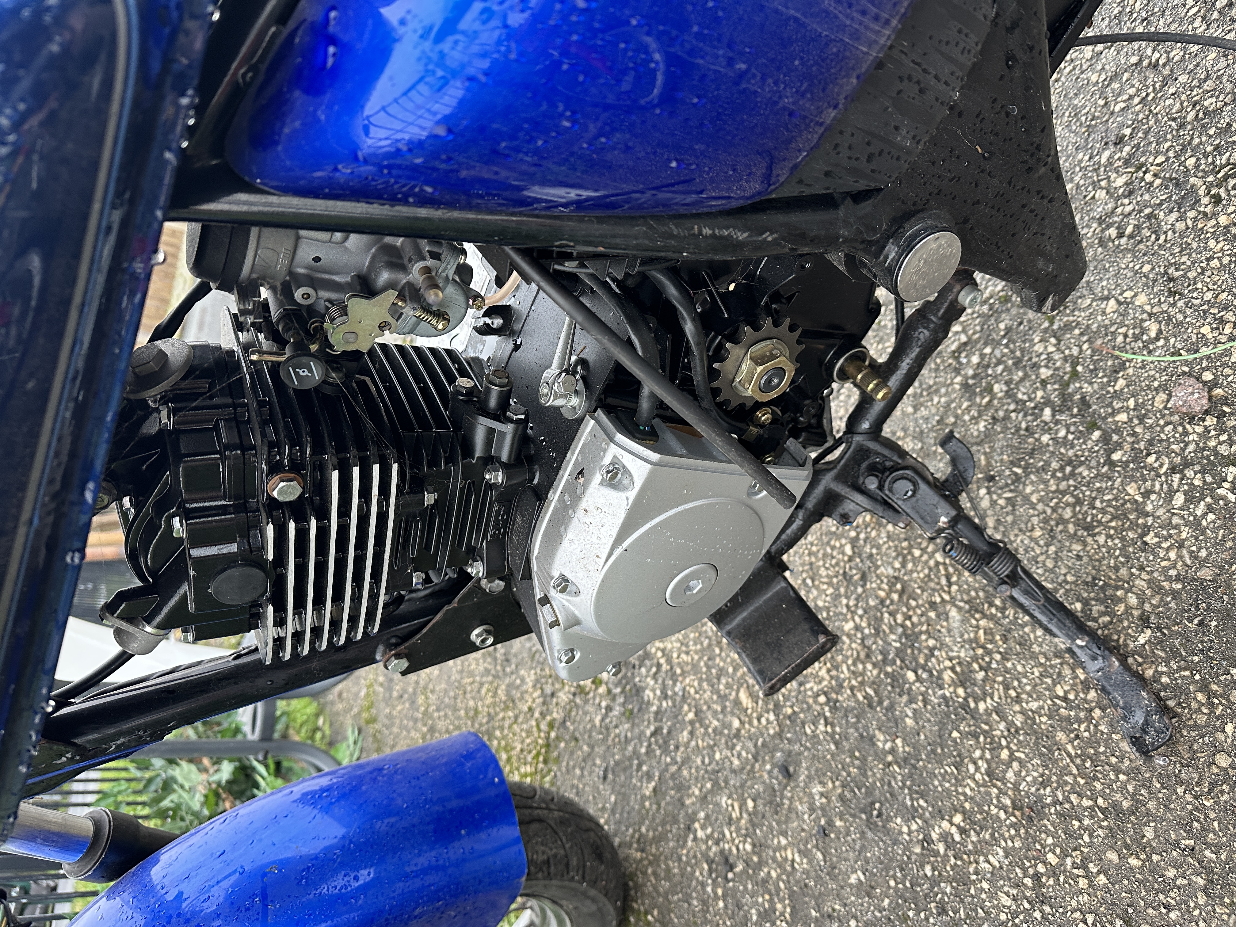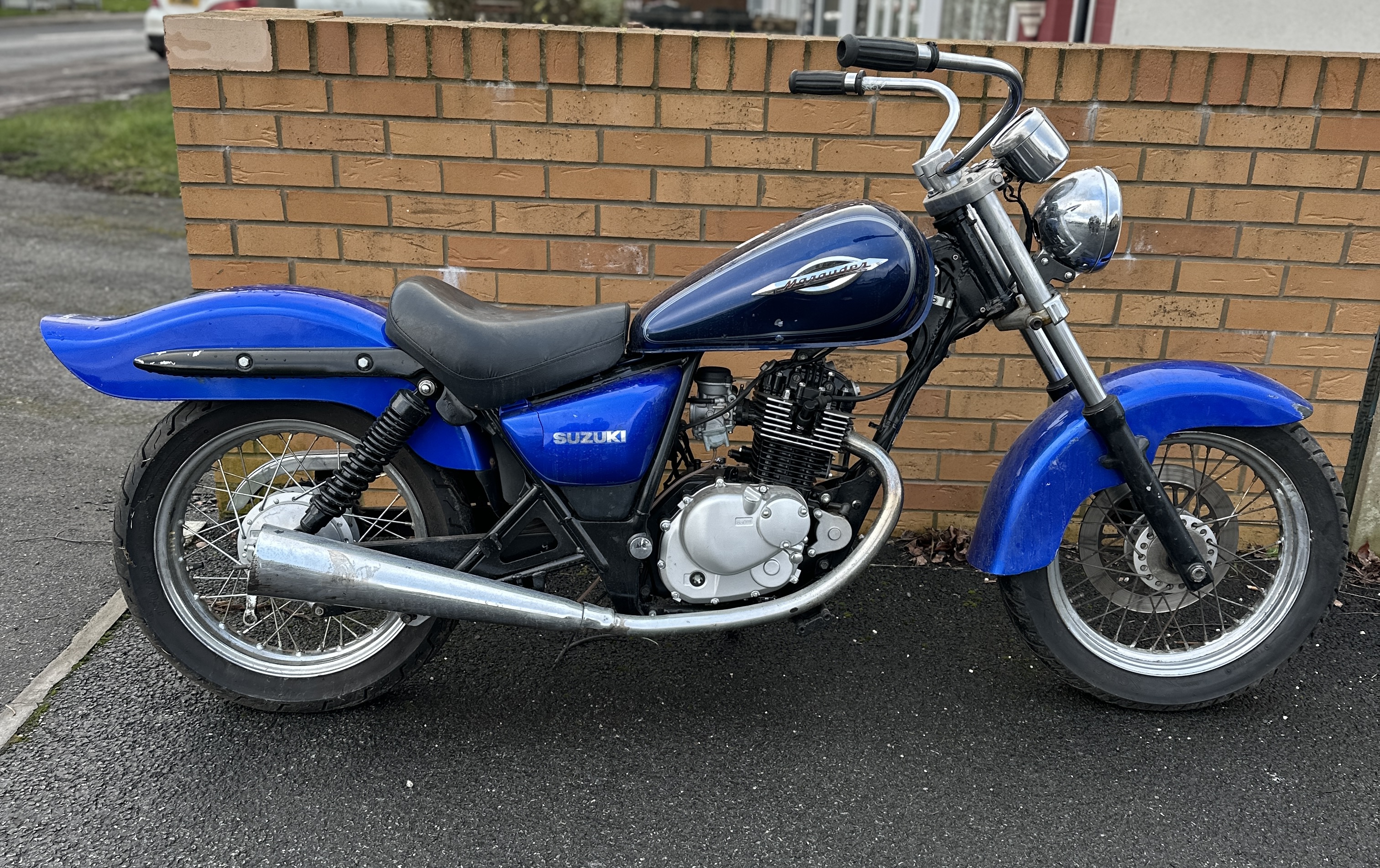 This lot features a Suzuki Marauder cruiser motorcycle, visually identified as a GZ250 model, though the specific year is unverified due to lack of documentation. The motorcycle is finished in a deep blue colour and features several customisations, including high-rise chrome handlebars (ape hangers), a single black saddle, and a modified or bobbed rear fender. The engine is an estimated 250cc single-cylinder, air-cooled unit utilising a carburettor and chain final drive. No VIN information is visible or provided. The odometer currently displays 16,726 miles. This motorcycle is offered without a title, registration, service records, or any other supporting documentation. Ownership history is unknown.