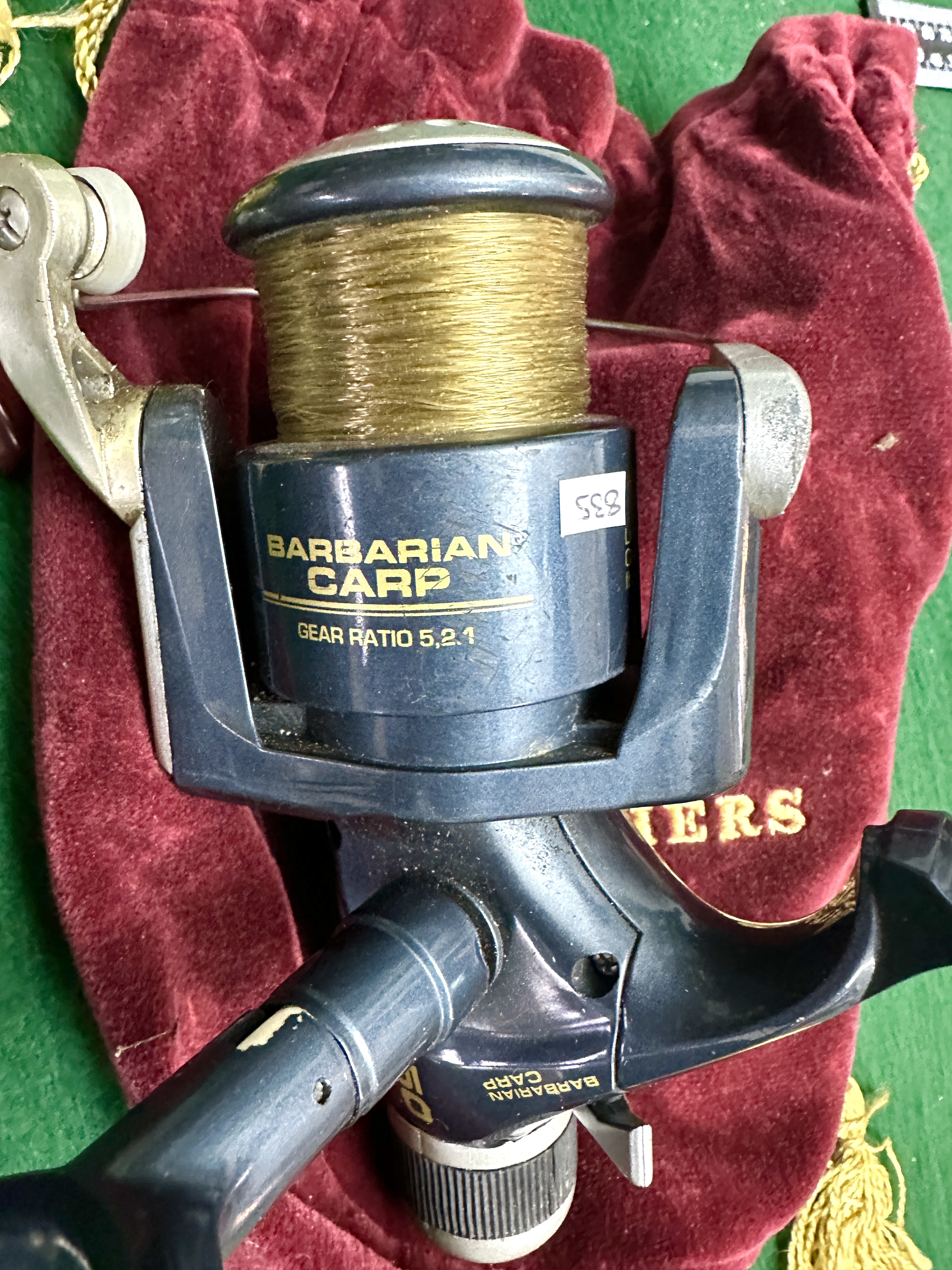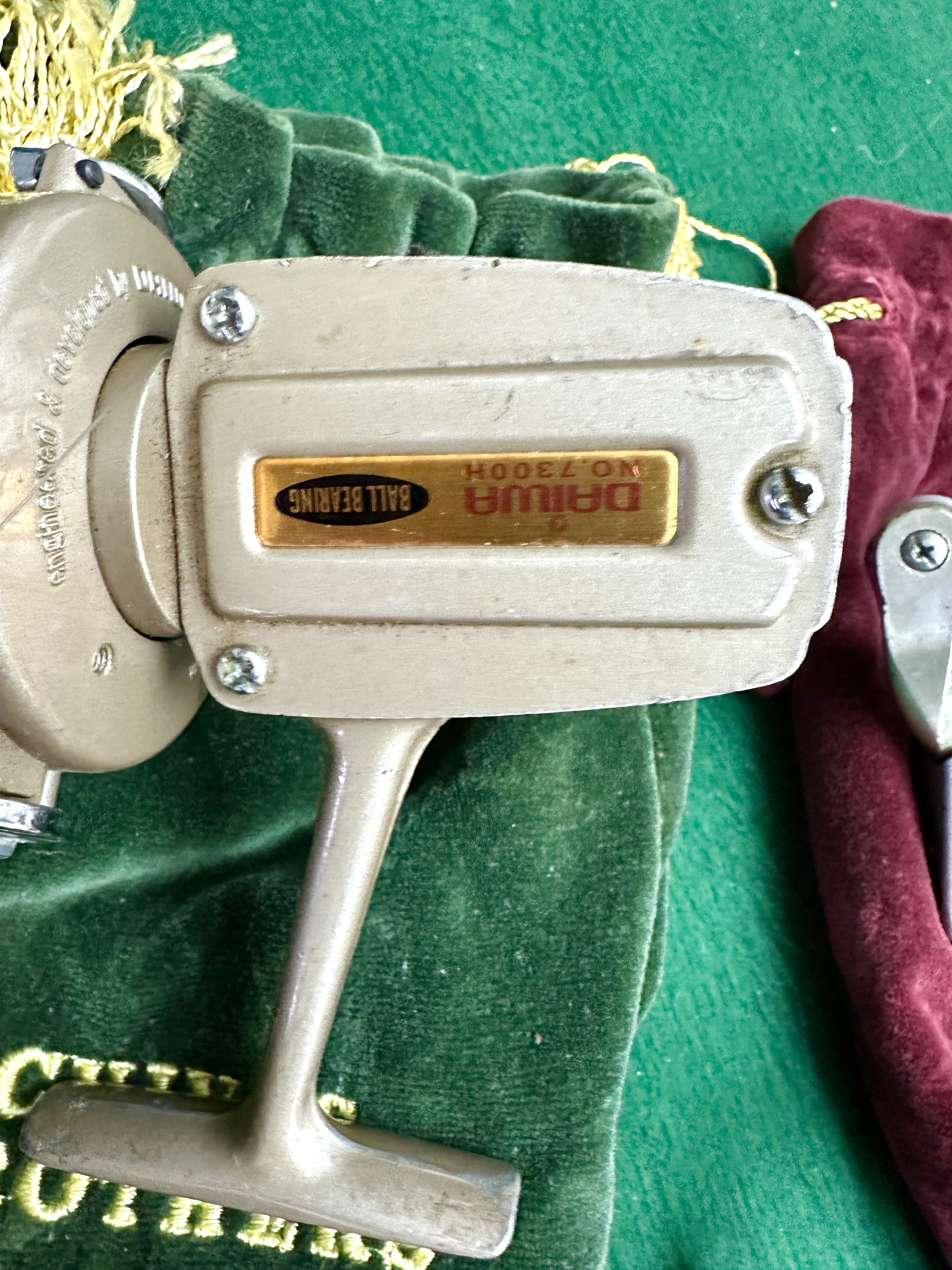 This lot comprises a collection of vintage fishing equipment and philatelic materials. The fishing gear includes a gold-toned Daiwa No. 7300H ball bearing spinning reel and a navy blue Barbarian Carp spinning reel featuring a 5.2:1 gear ratio. These are accompanied by velvet drawstring storage bags in green and burgundy with gold tassel details.