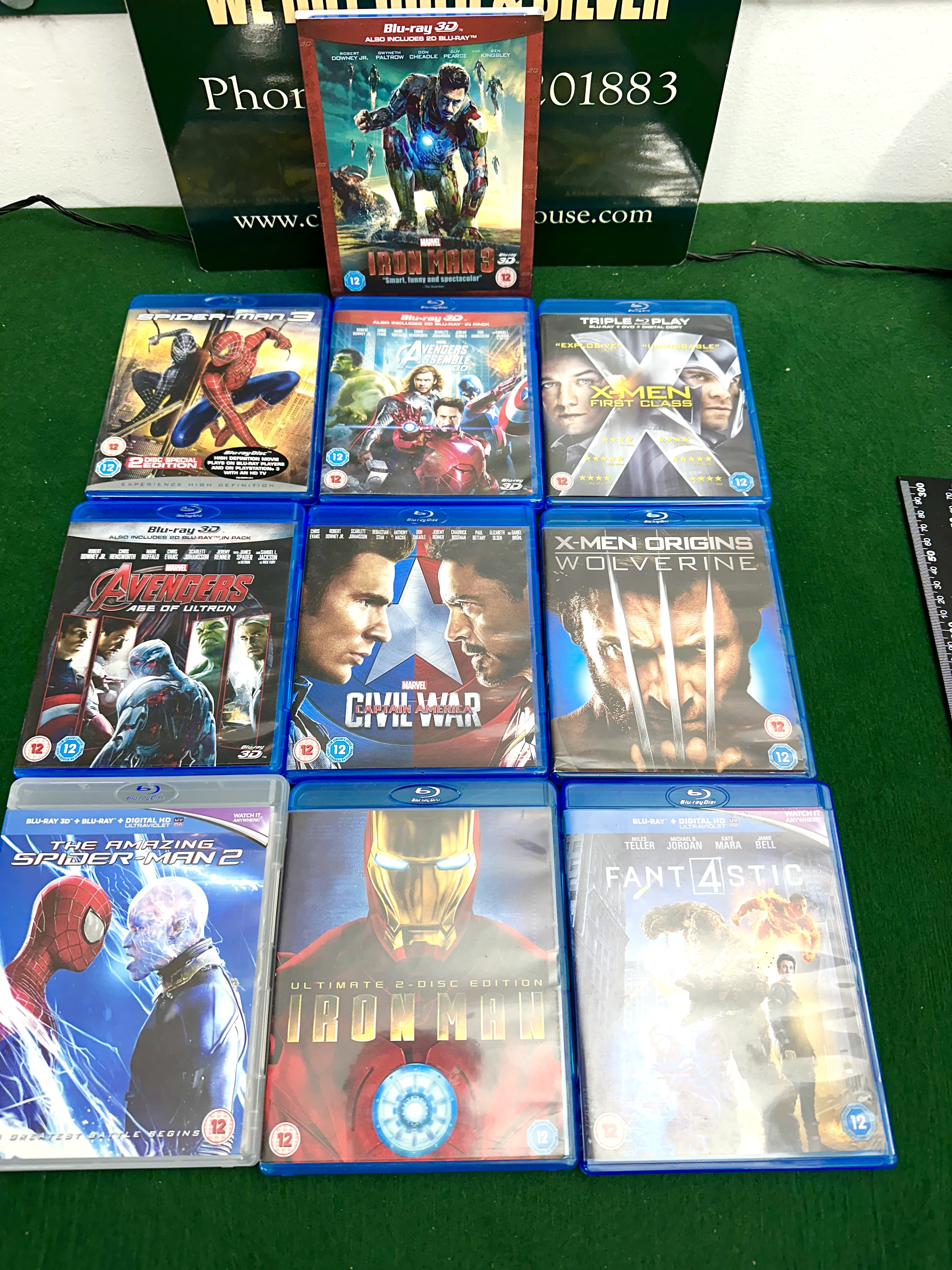 This lot comprises a collection of ten (10) commercial media Blu-ray discs, primarily featuring popular Marvel and superhero film titles. This catalogue entry is being processed under the ‘Auto Parts & Accessories’ category due to inventory constraints, but it is critical to note that **NO VEHICLE, CHASSIS, ENGINE, OR AUTOMOTIVE COMPONENT IS INCLUDED** in this sale. The lot consists solely of the media items photographed. Titles include: Iron Man (Ultimate 2-Disc Edition), Iron Man 3 (Blu-ray 3D), The Amazing Spider-Man 2, Spider-Man 3 (2 Disc Edition), Avengers Assemble (3D), Avengers: Age of Ultron (3D), Captain America: Civil War, X-Men: First Class, X-Men Origins: Wolverine, and Fantastic Four (2015).
