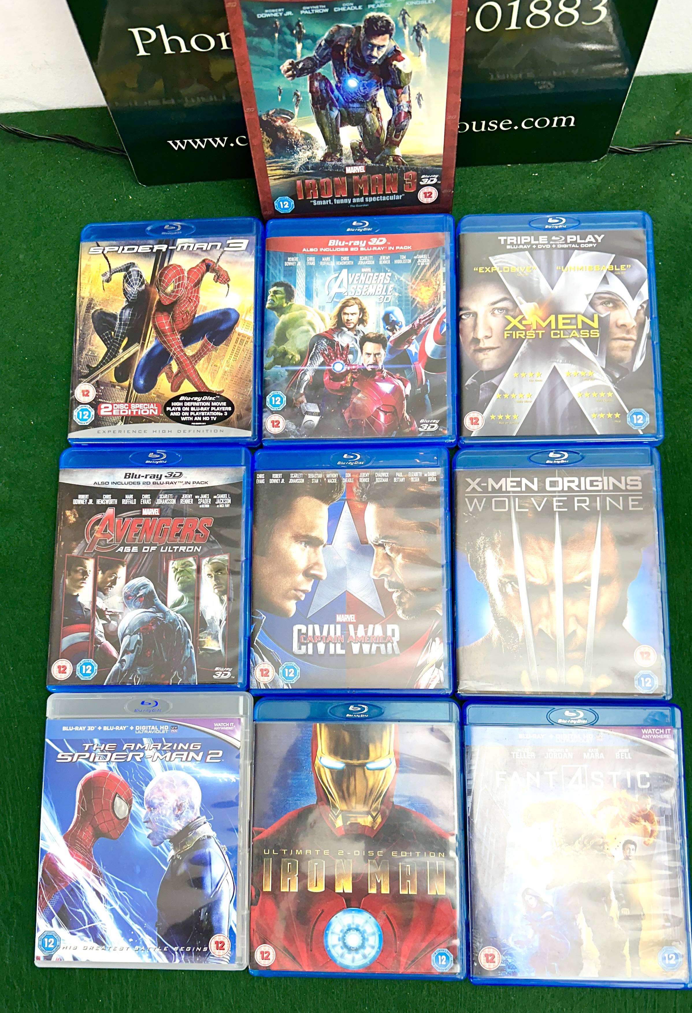 This lot comprises a collection of nine (9) retail Blu-ray disc cases featuring popular superhero and Marvel film titles. The collection includes: Iron Man 3, Spider-Man 3 (2-Disc Special Edition), Avengers Assemble (3D), X-Men First Class (Triple Play), Avengers Age of Ultron (3D), Captain America Civil War, X-Men Origins Wolverine, The Amazing Spider-Man 2, and Iron Man (Ultimate 2-Disc Edition). These are standard retail media items. No vehicle, VIN, engine, transmission, mileage, colour, or automotive components are included in this lot. Documentation consists solely of the original retail packaging and sleeves. Ownership history is unknown.