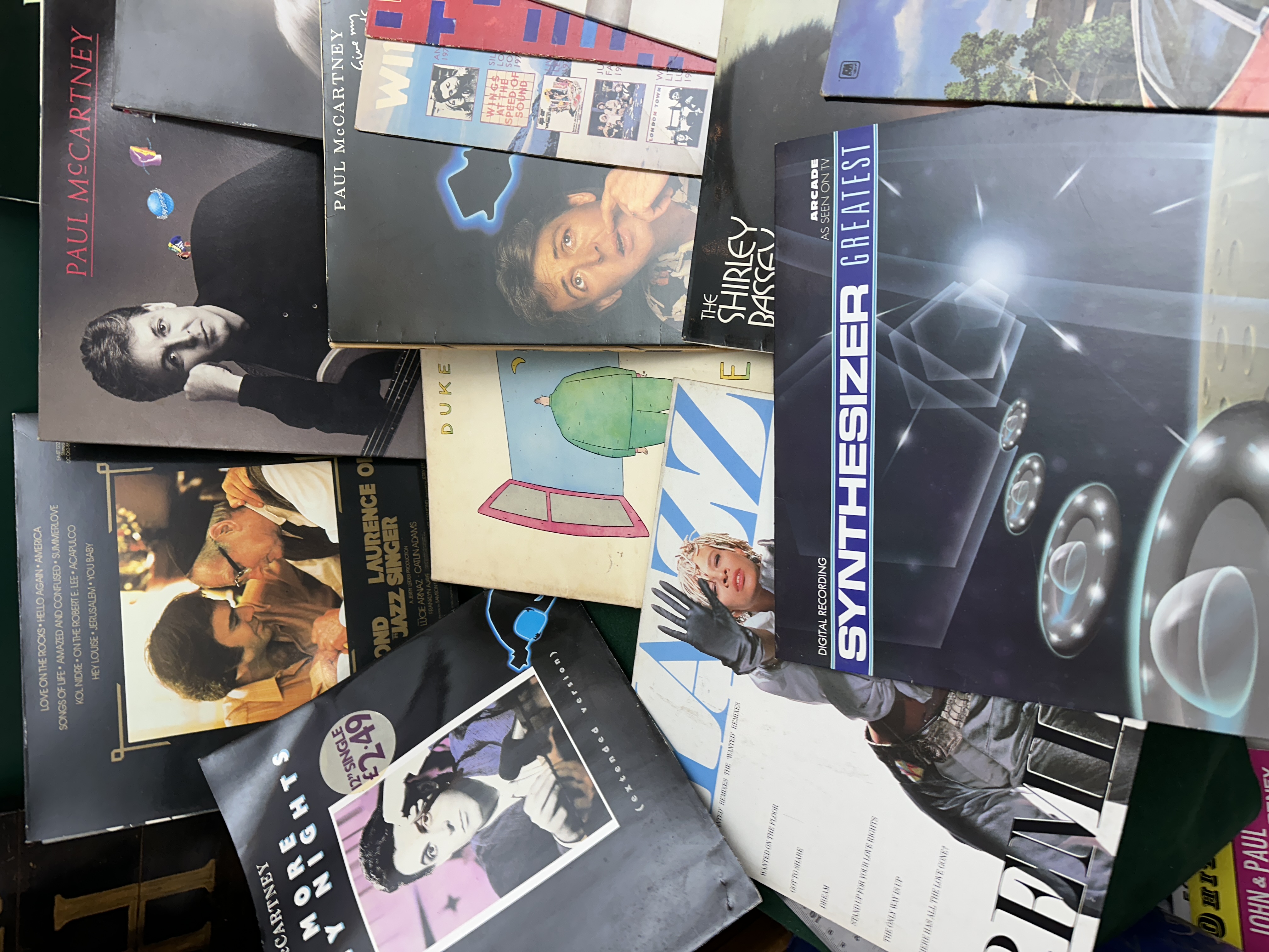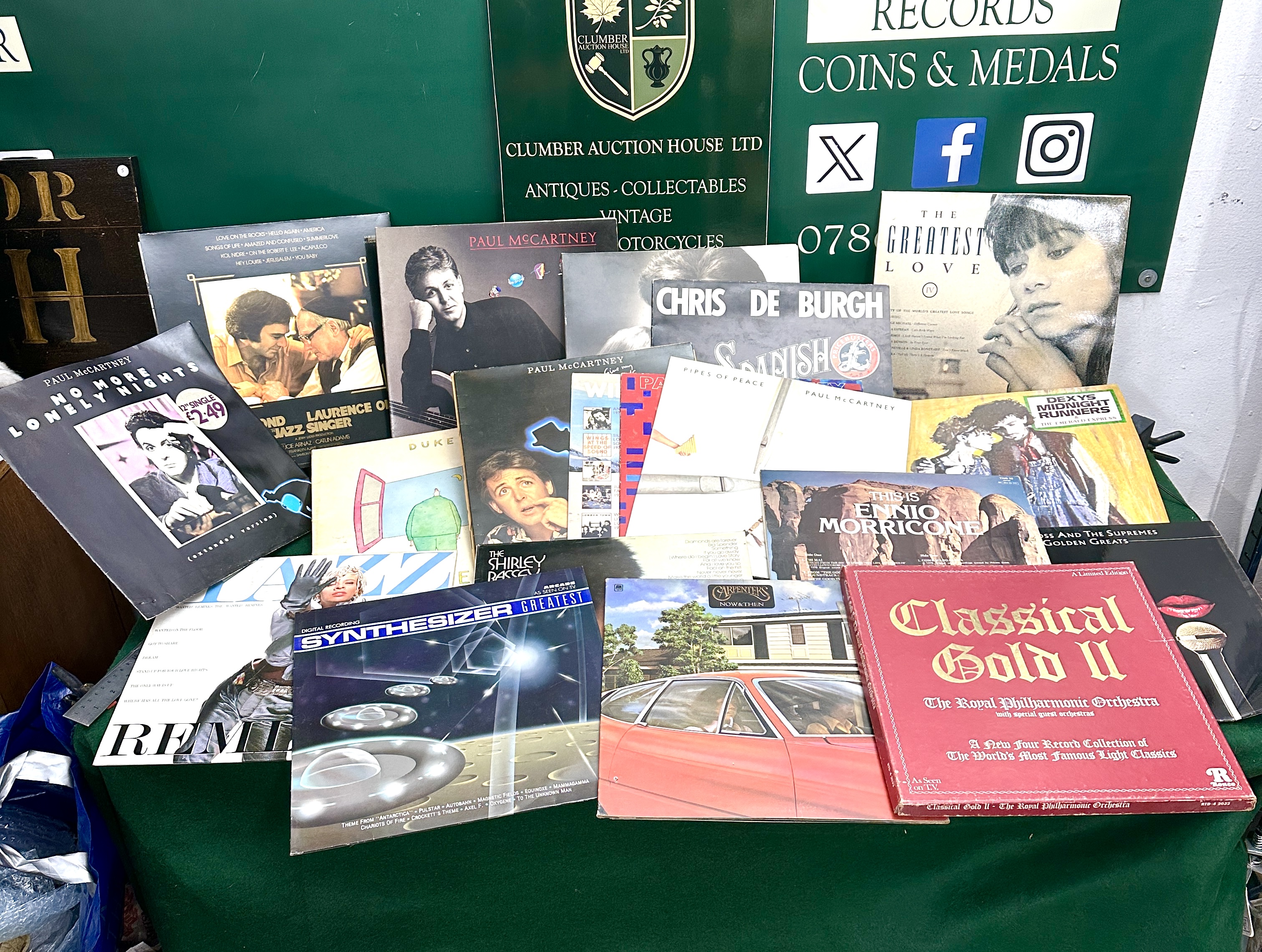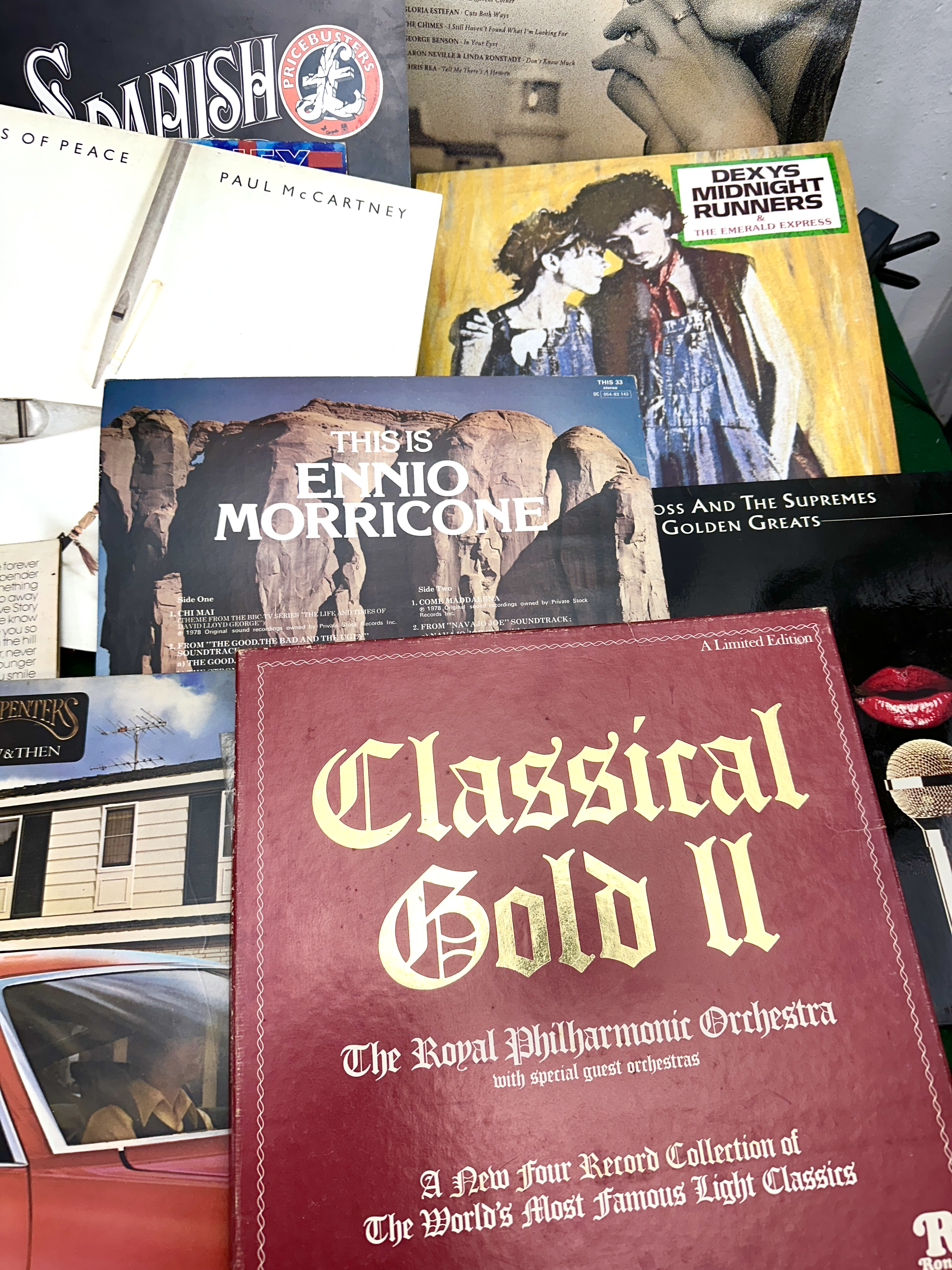 A collection of multi-coloured vinyl record albums featuring various artists including Paul McCartney, Chris De Burgh, Dexys Midnight Runners, Ennio Morricone, and a Classical Gold II box set.