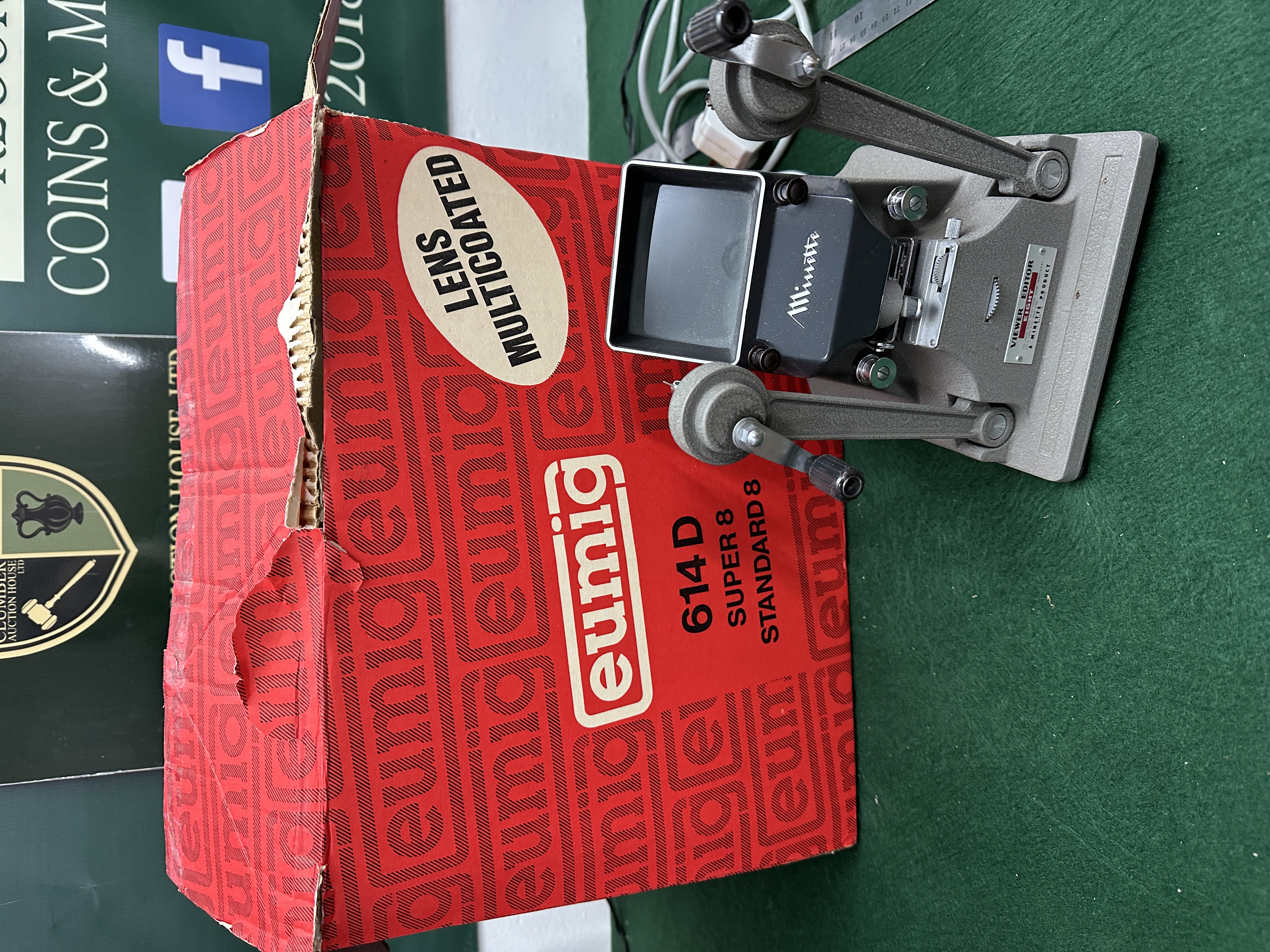 A collection of three items (Projector: 1, Viewer/Editor: 1, Box: 1; Total count: 3 items) comprising a beige and black Eumig 614 D Super 8 and Standard 8 projector with its associated red box labelled LENS MULTICOATED, alongside a grey Minette Viewer Editor.