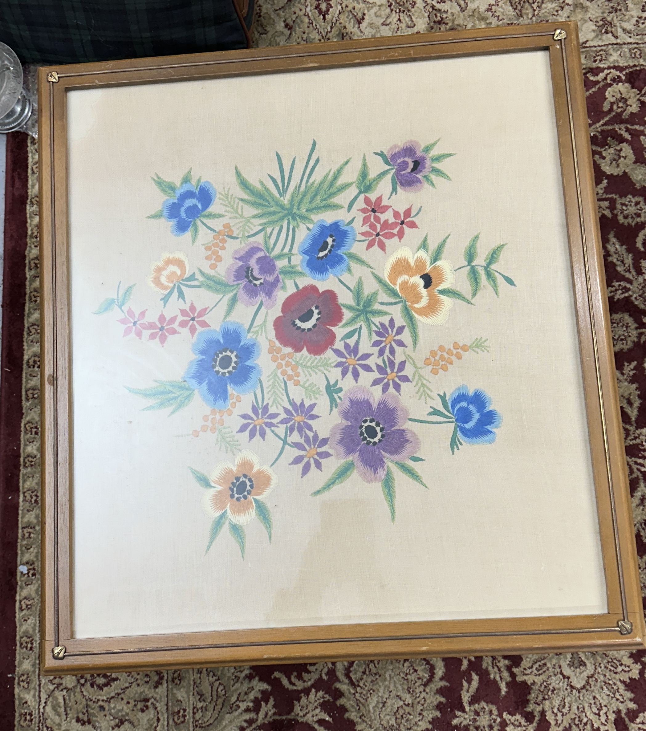 Year: Circa 1970s (Estimated) Make: Unknown / Handcrafted Model: Decorative Standing Screen / Firescreen VIN: Not Applicable (Furniture Item) Engine: Not Applicable Transmission: Not Applicable Mileage: Not Applicable Colour: Medium Brown Stained Wood Frame with Multi-Coloured Floral Embroidery Features: This is a vintage decorative standing screen, often utilised as a firescreen or a display for needlework. The construction features a solid medium brown stained wooden frame supported by fixed, curved wooden feet/stabilisers. The central panel showcases a large, vibrant crewel embroidery piece depicting an elaborate floral bouquet in hues of blue, purple, orange, red, and green against a tan textile background. The reverse features a plain wooden back panel supported by internal cross braces. Documentation is not present. Ownership history is unknown.
