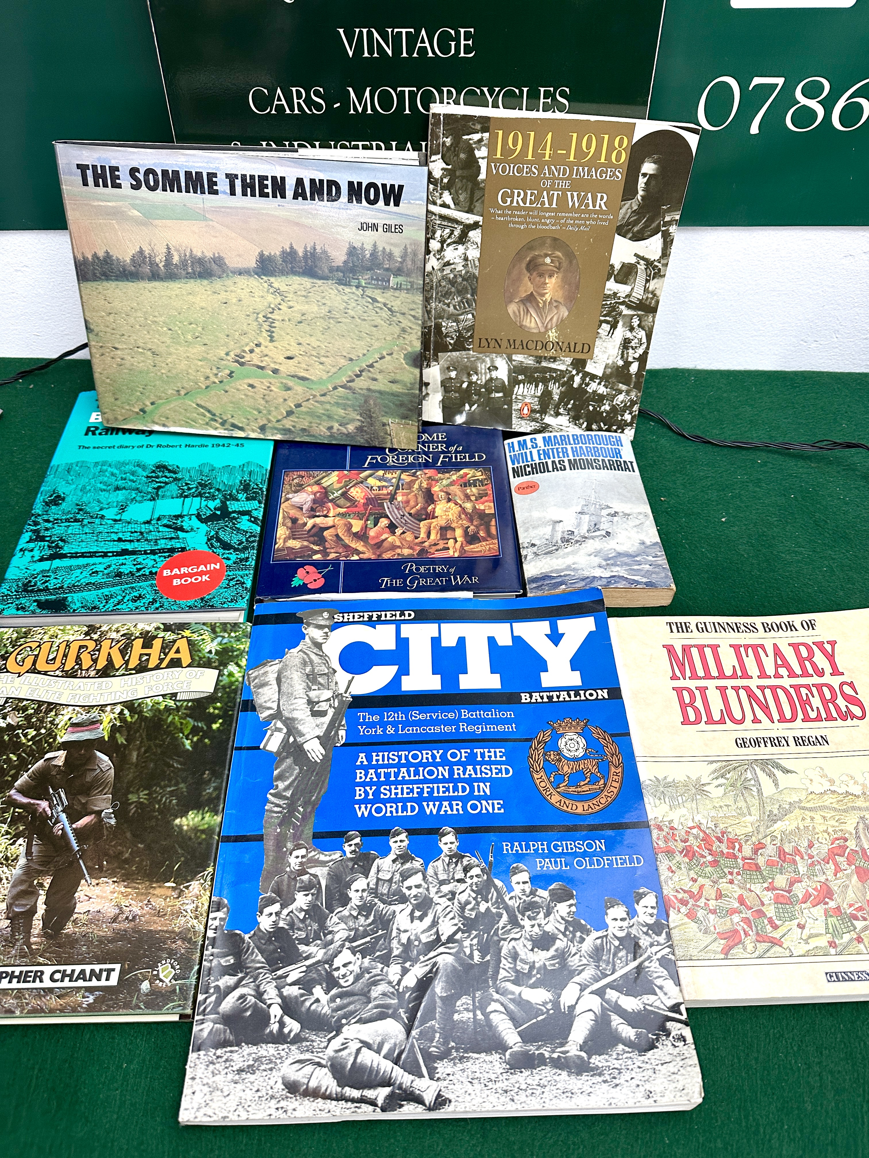 This lot comprises a collection of approximately eight used books, predominantly focused on military history, World War One, and naval themes. Key titles include ‘Sheffield City Battalion The 12Th Battalion, York and Lancaster Regiment: A History of the Battalion Raised by Sheffield in World War One’ (identified via web research), ‘The Somme Then and Now’ by John Giles, ‘1914-1918 Voices and Images of the Great War’ by Lyn Macdonald, ‘Gurkha’ by Christopher Chant, ‘The Guinness Book of Military Blunders’ by Geoffrey Regan, ‘H.M.S. Marlborough Will Enter Harbour’ by Nicholas Monsarrat, and ‘Poetry of the Great War’. The collection is presented against a backdrop featuring a partial green sign or banner indicating an interest in VINTAGE CARS and MOTORCYCLES, alongside the partial numerical identifier 0786. No physical vehicles, vehicle parts, or specific vehicle documentation (VIN, title, service records, build sheets, or odometer readings) are included in this lot. This offering is for the collection of literature only.