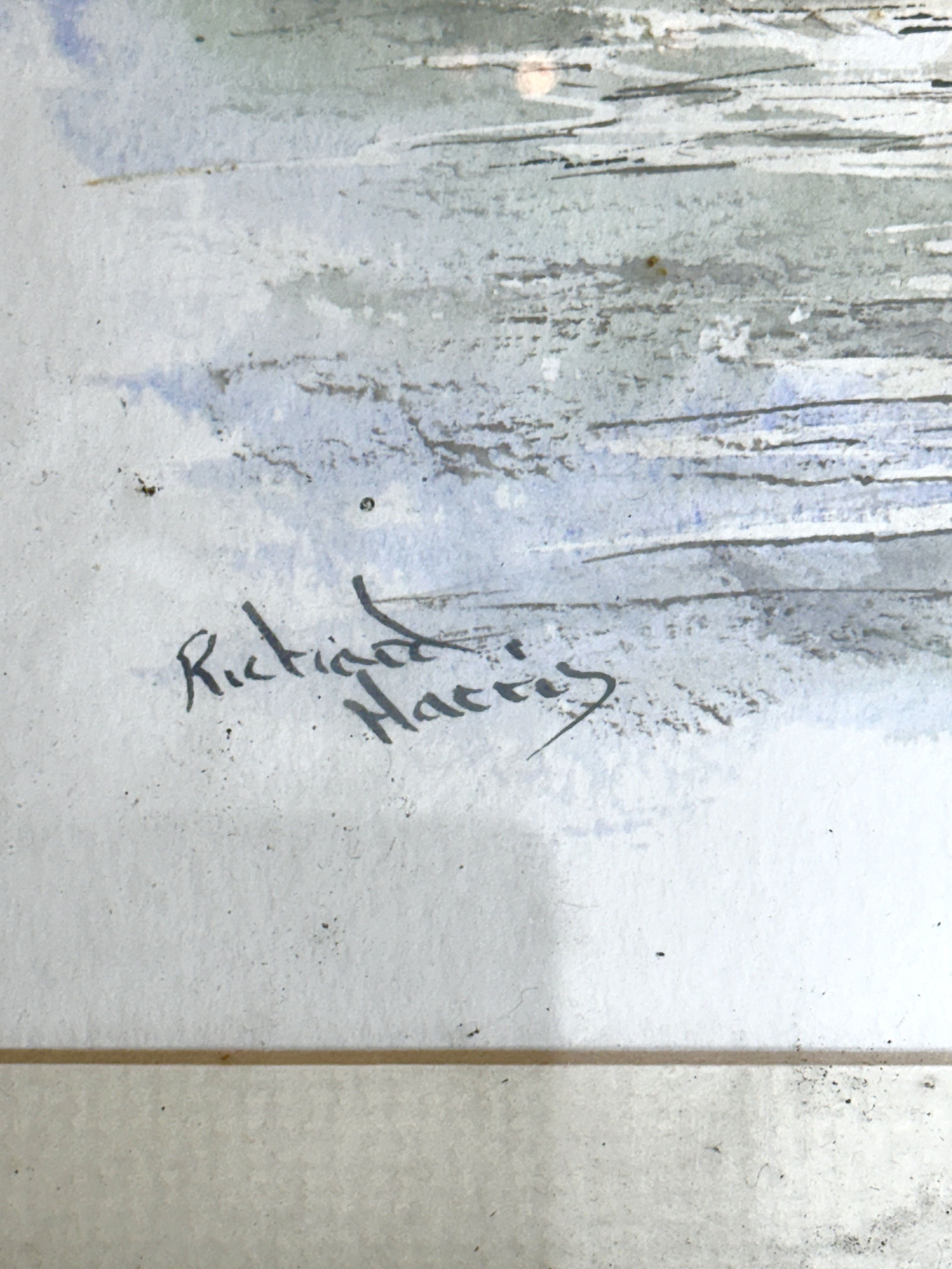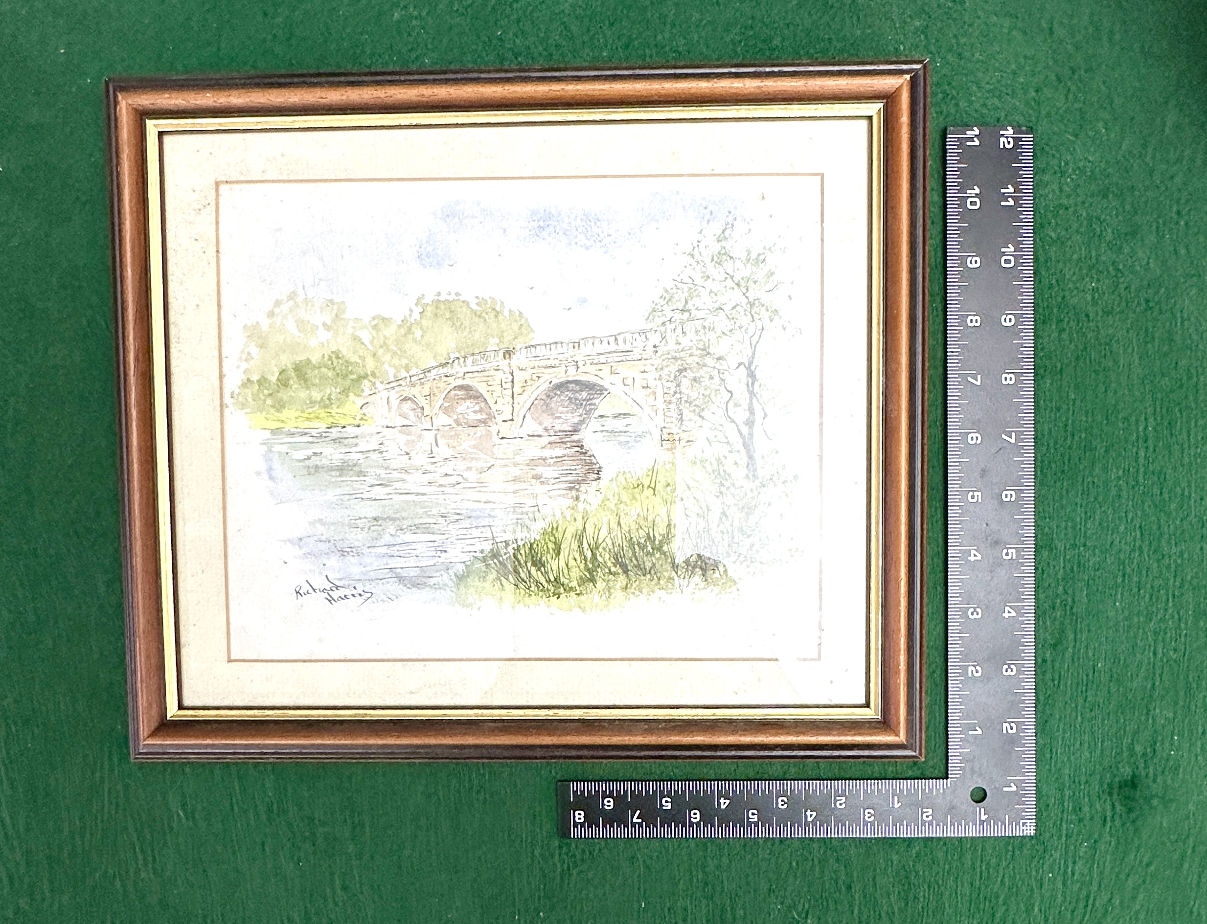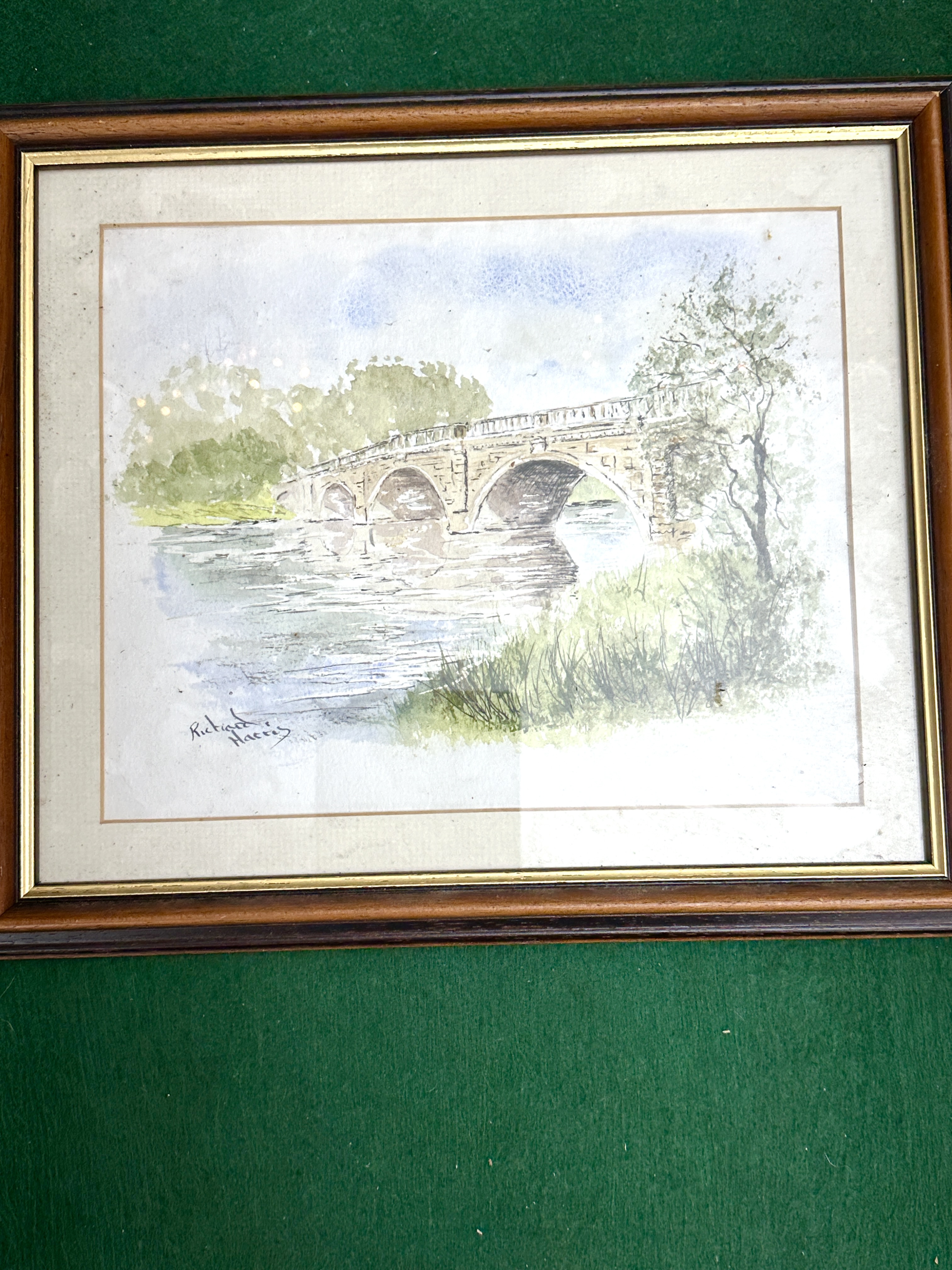 This lot comprises an original framed watercolour painting signed by the artist Richard Harris in the lower margin. The artwork depicts a picturesque stone arch bridge spanning a river in a tranquil, pastoral setting. The piece is presented in a dark brown wooden frame featuring a gold-tone inner fillet and is mounted with an off-white matting. As this is an artwork and not a vehicle, standard vehicle specifications (Year, Make, Model, VIN, engine, transmission, mileage, colour, documentation) are not applicable. The dimensions are approximately 12 inches by 8 inches. Ownership history is unknown.