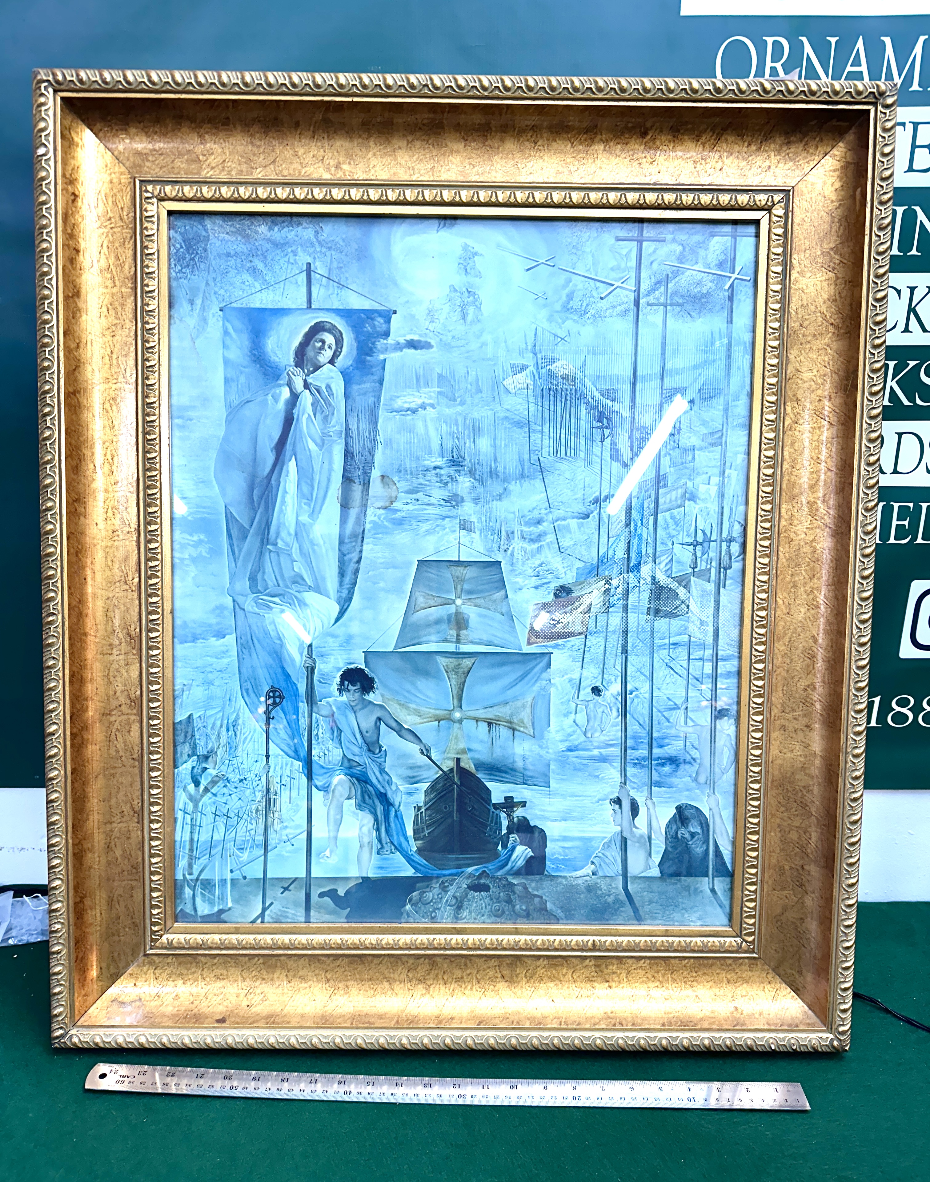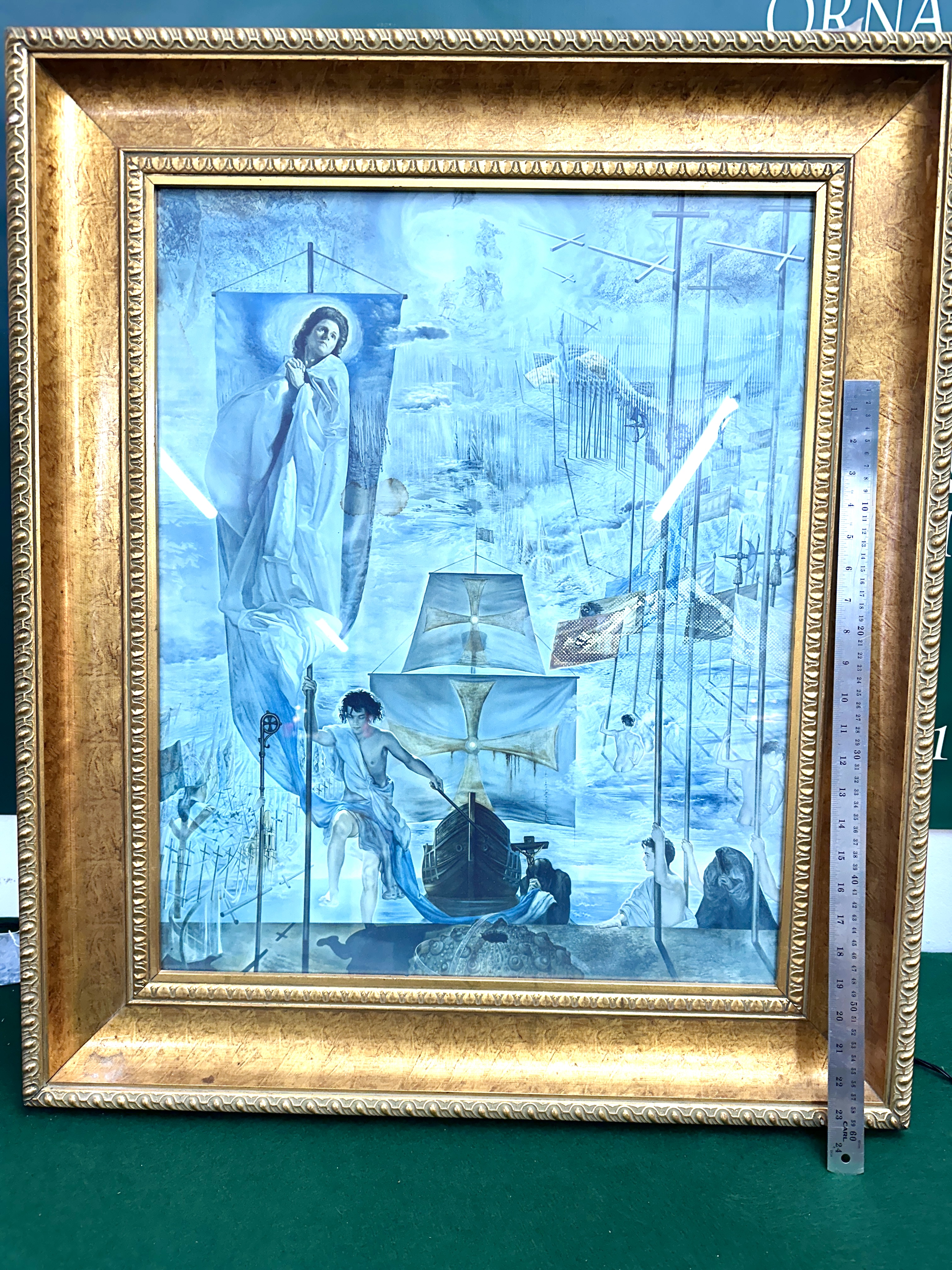 Artist Salvador Dalí Spanish 1904-1989 Title The Discovery of America by Columbus Medium Colour lithograph or print set under glazing in an ornate gold-coloured frame. This piece features surrealist religious and maritime themes including a large figure of Christ or the Virgin Mary on a banner and a ship reminiscent of the Santa María. The piece is believed to be a signed edition based on web intelligence but the signature and edition number have not been verified. Approximate dimensions are 24 inches on the longer side. No VIN or vehicle identification information is applicable. Documentation No Certificate of Authenticity or provenance documentation is visible or included with the lot. This item is sold as attributed to or after Salvador Dalí unless otherwise stated by the auctioneer at the time of sale.