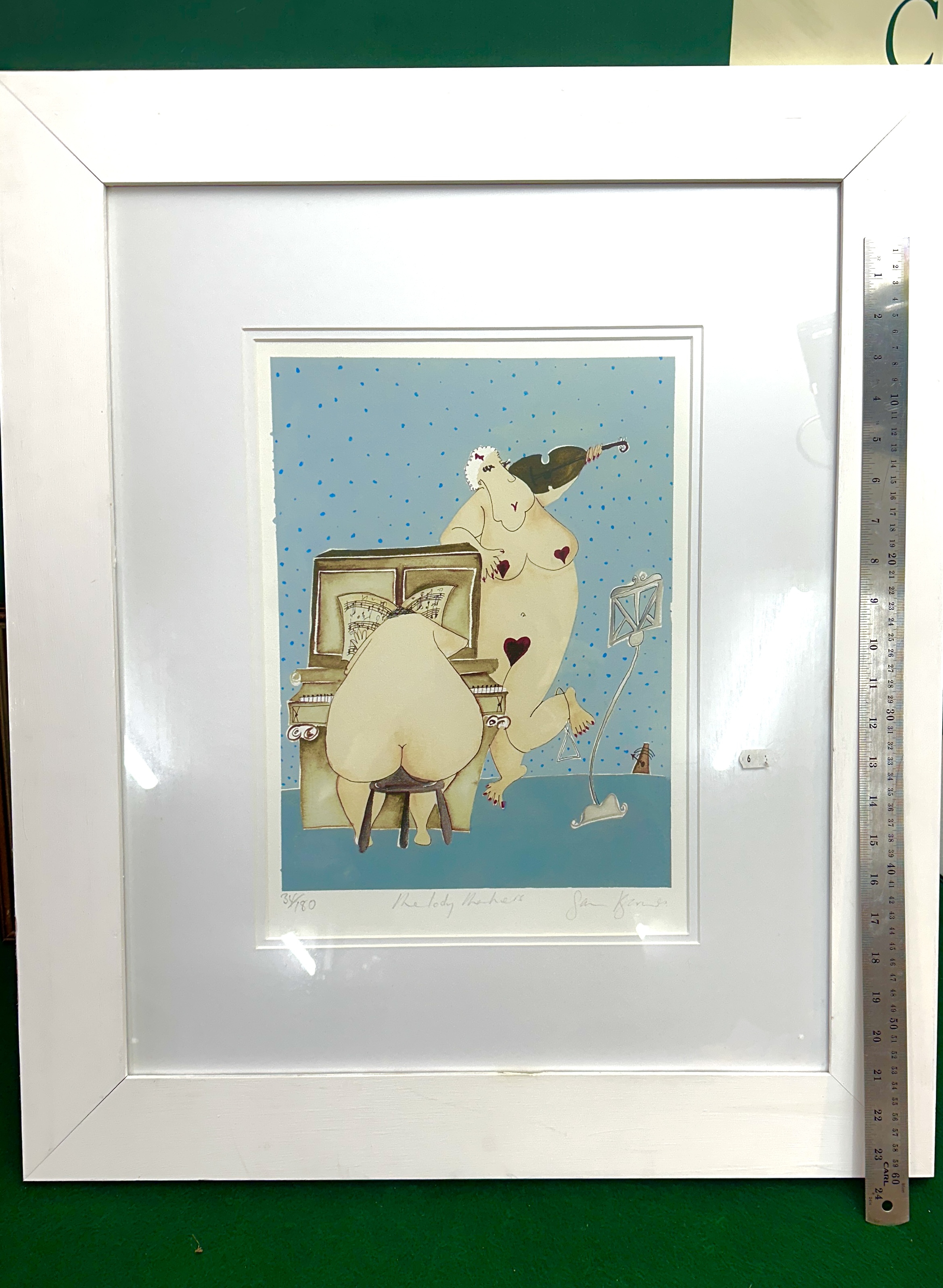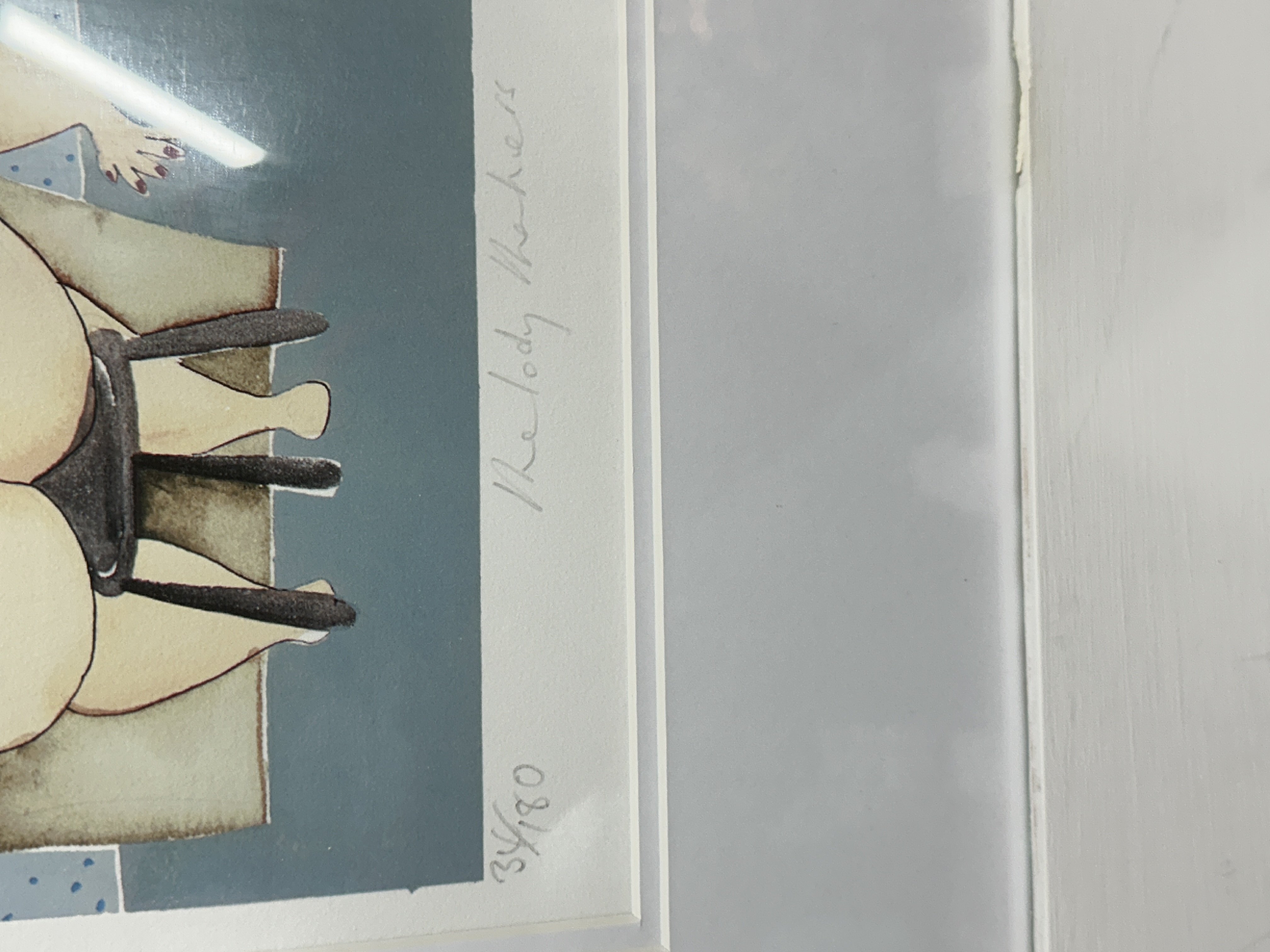 This lot comprises a framed piece of artwork, not a vehicle or vehicle component. Standard automotive metrics are therefore not applicable. Make N/A. Model N/A. Year N/A. VIN N/A. Engine N/A. Transmission N/A. Mileage N/A. The item is a limited edition print titled The Lady The Hair, numbered 34/180 and signed by the artist in pencil below the image. The print features a humorous, figurative scene, rendered in multi-colour tones. The artwork is presented in a clean, contemporary white frame with a wide white mount. The print is documented by the visible numbering and signature. Ownership history is unknown.