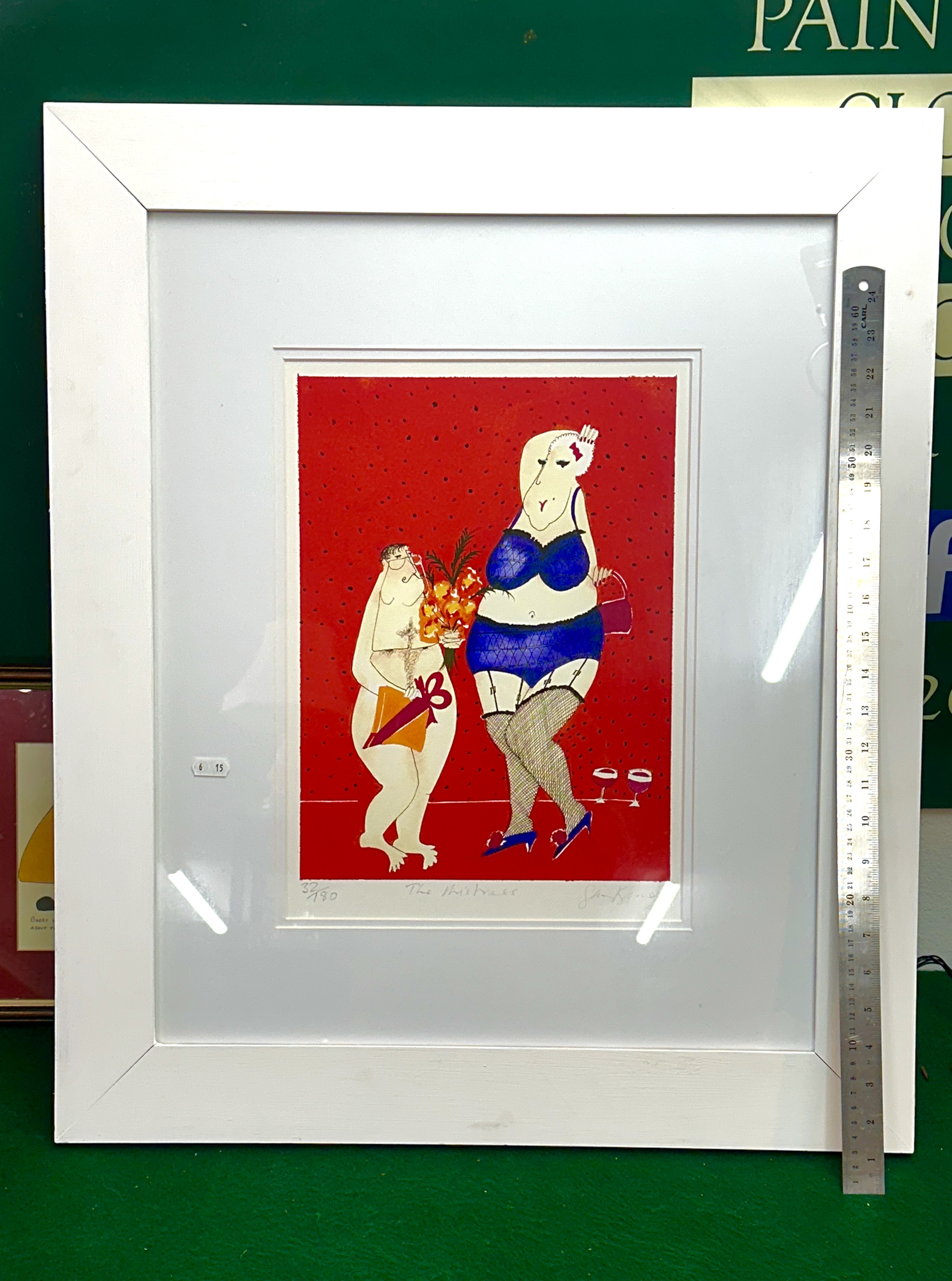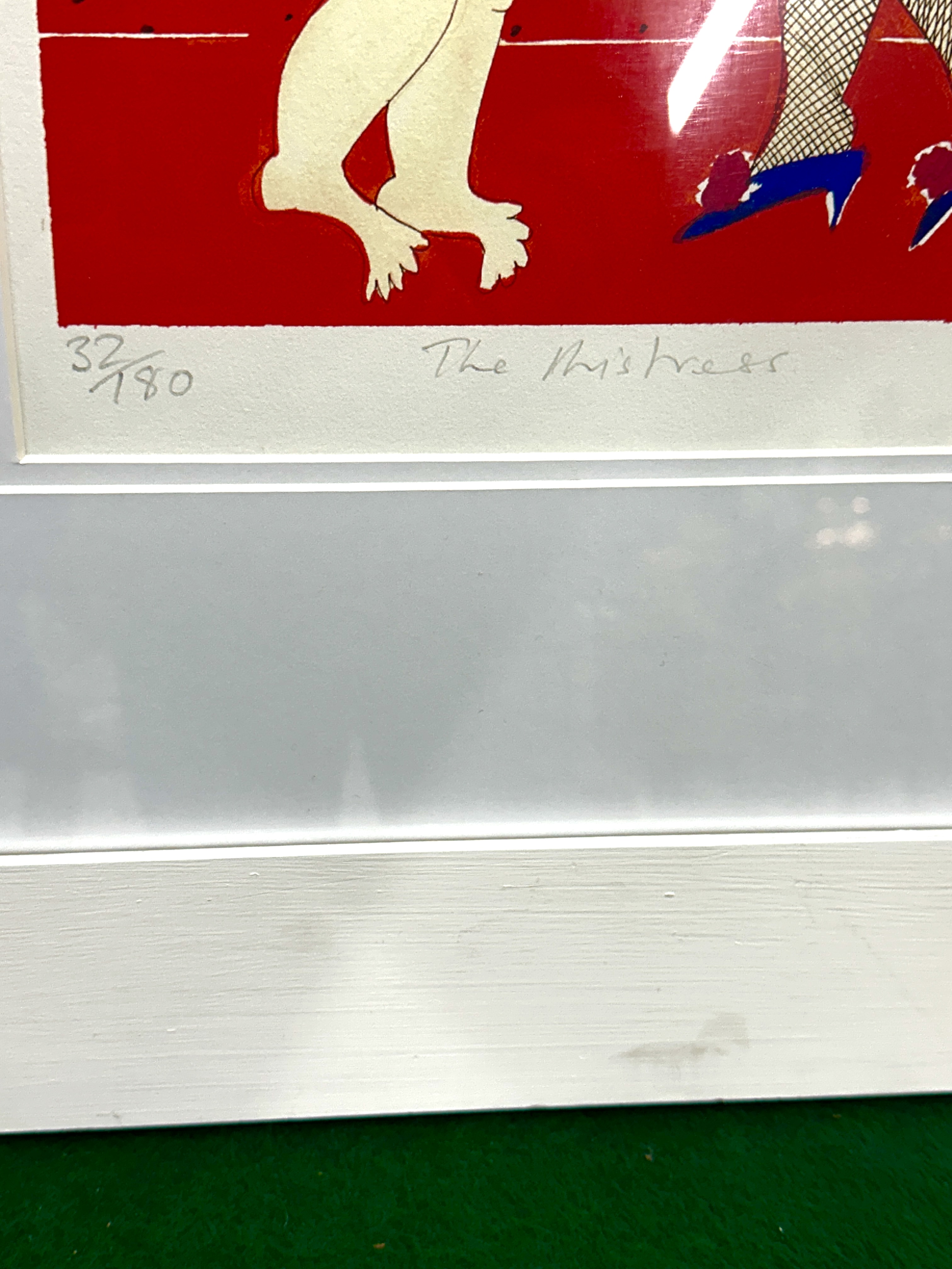 This lot comprises a framed piece of artwork, not a vehicle or associated automotive component. Standard vehicle data, including Year, Make, Model, VIN, Engine type, and Transmission, are inapplicable and cannot be transcribed. The item is a limited edition print titled “The Mistress,” numbered 32/180, set against a vibrant red background. The print is presented in a wide, white wood frame with a white matte. The overall presentation is professional. Documentation relating to vehicle ownership (title, service records, build sheets, window sticker) is not present. Mileage is inapplicable to this item.
