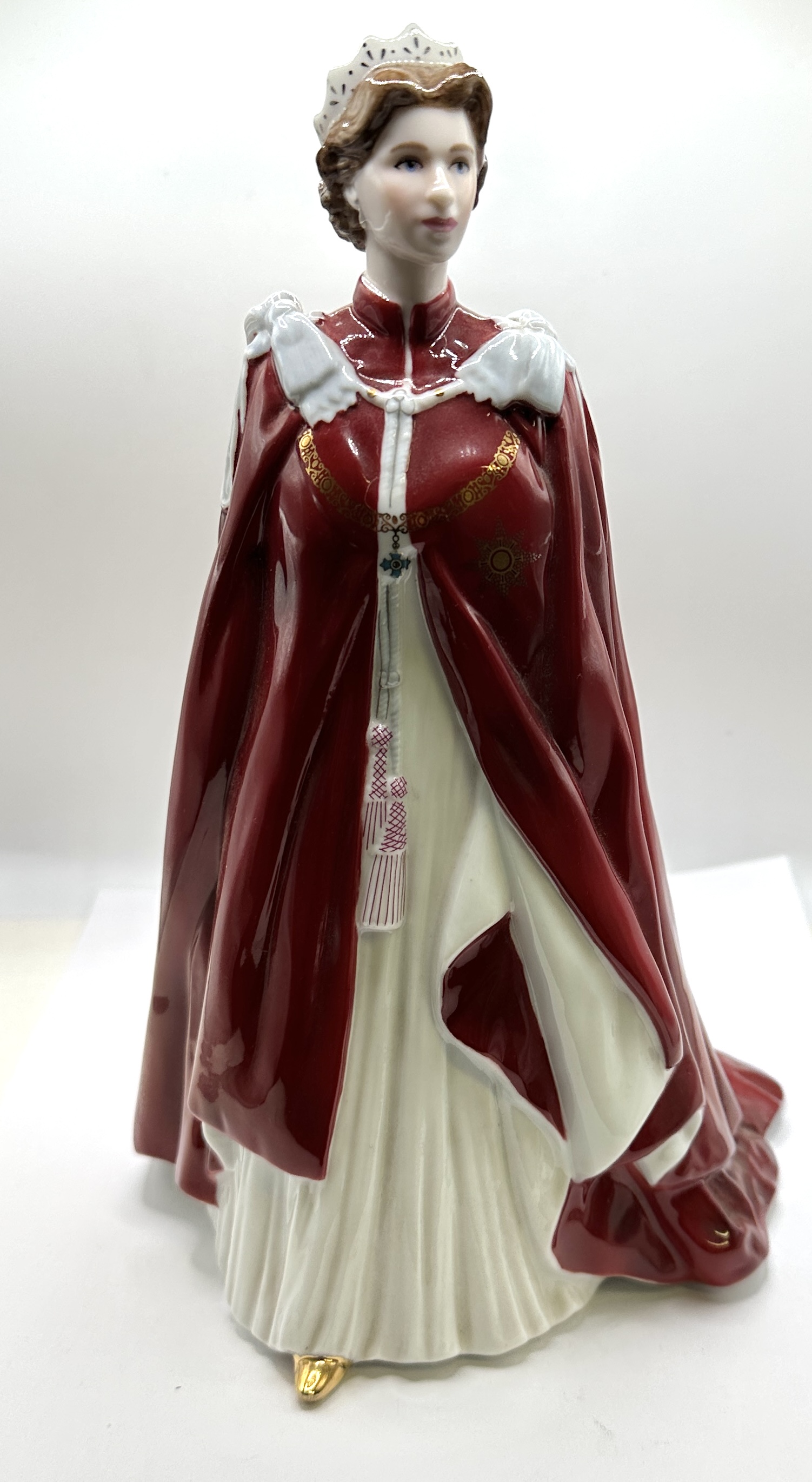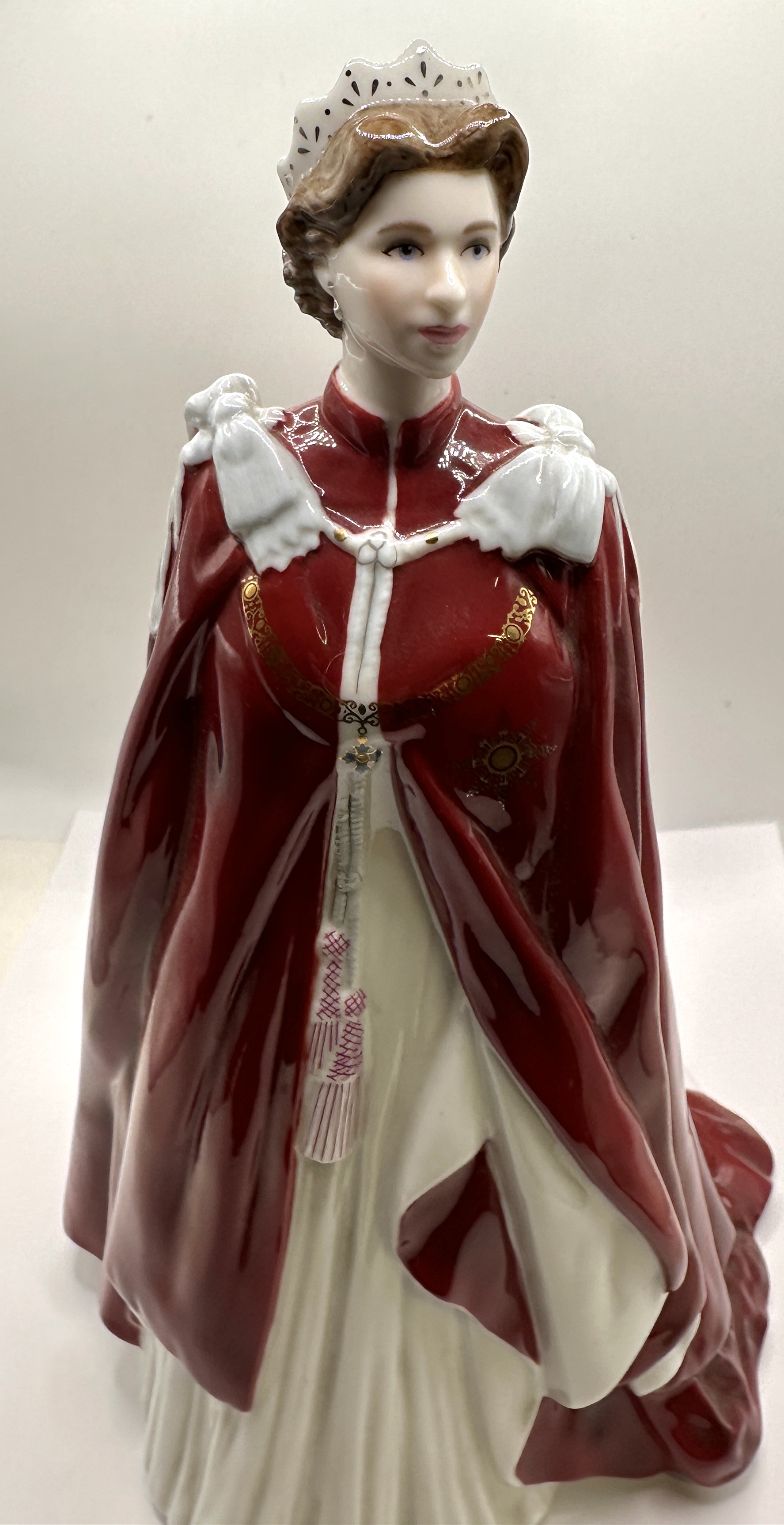 Year: 2006 (Commemorative Issue). Make/Manufacturer: Royal Worcester. Model/Subject: Queen Elizabeth II (80th Birthday Celebration). VIN/Serial Number: N/A (Collectible Figurine). Engine/Material: N/A (Glazed Porcelain/Ceramic). Transmission/Finish: N/A (High Gloss Glaze). Mileage/Dimensions: N/A (Static Display Piece). Colour: Deep Crimson, Cream, White, Gold Accents. Features: Highly detailed depiction of the Queen in elaborate ceremonial robes. The figure wears a white crown/tiara and a glossy deep crimson mantle trimmed in white fur/ermine, fastened with a decorative tassel and white cord, over a cream-coloured pleated gown. This piece was issued to celebrate the Queen’s 80th birthday. Documentation: N/A. Ownership History: Single owner consignment to the auction house.