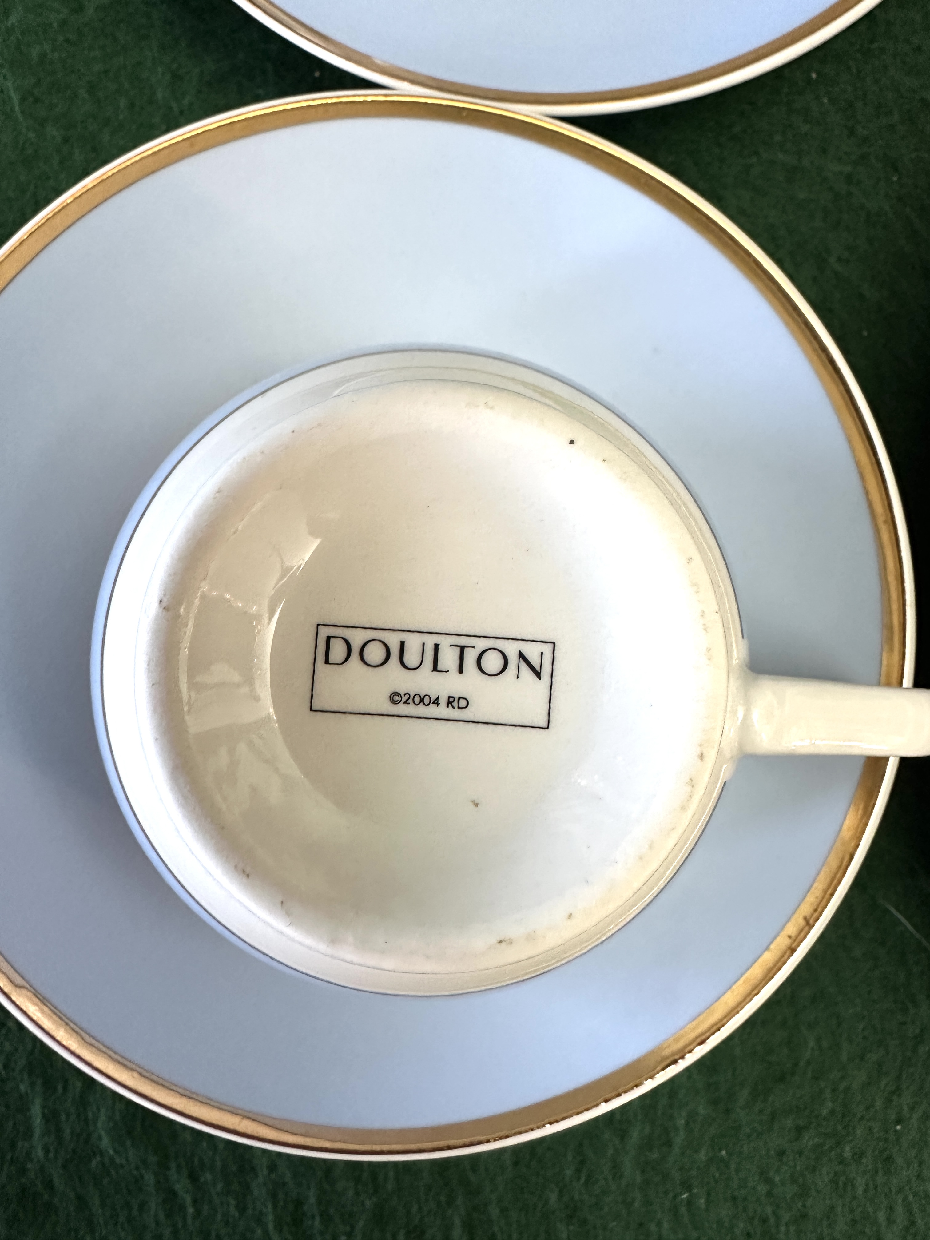Doulton part dinner service, copyrighted 2004. This elegant collection features a light powder blue outer band, a crisp white centre well, and consistent gold banding around all edges. The set includes four teacups, four saucers, five dinner plates, and four shallow bowls, totalling seventeen pieces. While the specific pattern name is not stamped, the style is reminiscent of contemporary luxury designs, possibly associated with Doulton’s designer collaborations. The manufacturer stamp is clearly visible as DOULTON ©2004 RD. No original packaging, service records, or catalogue documentation is present.