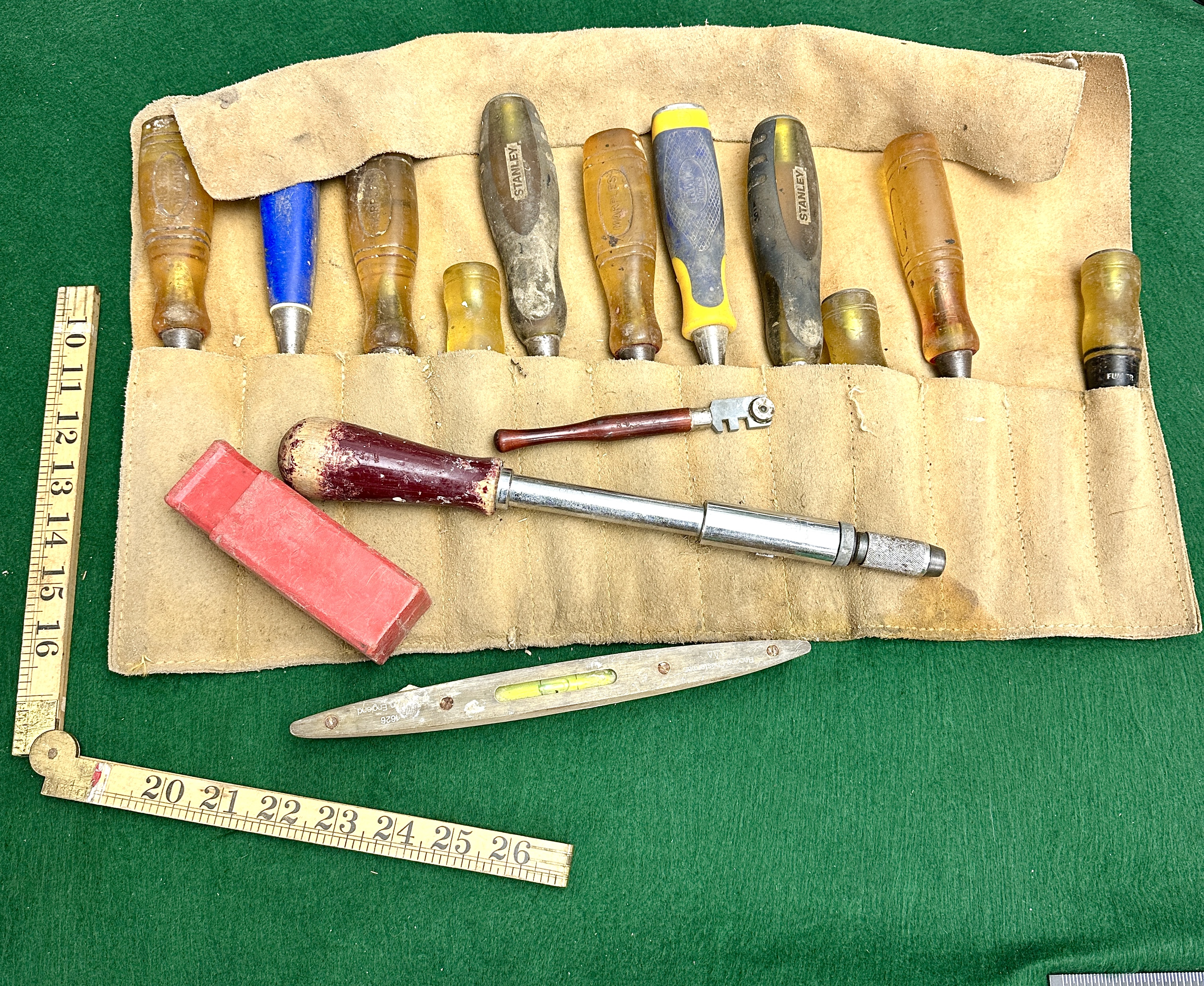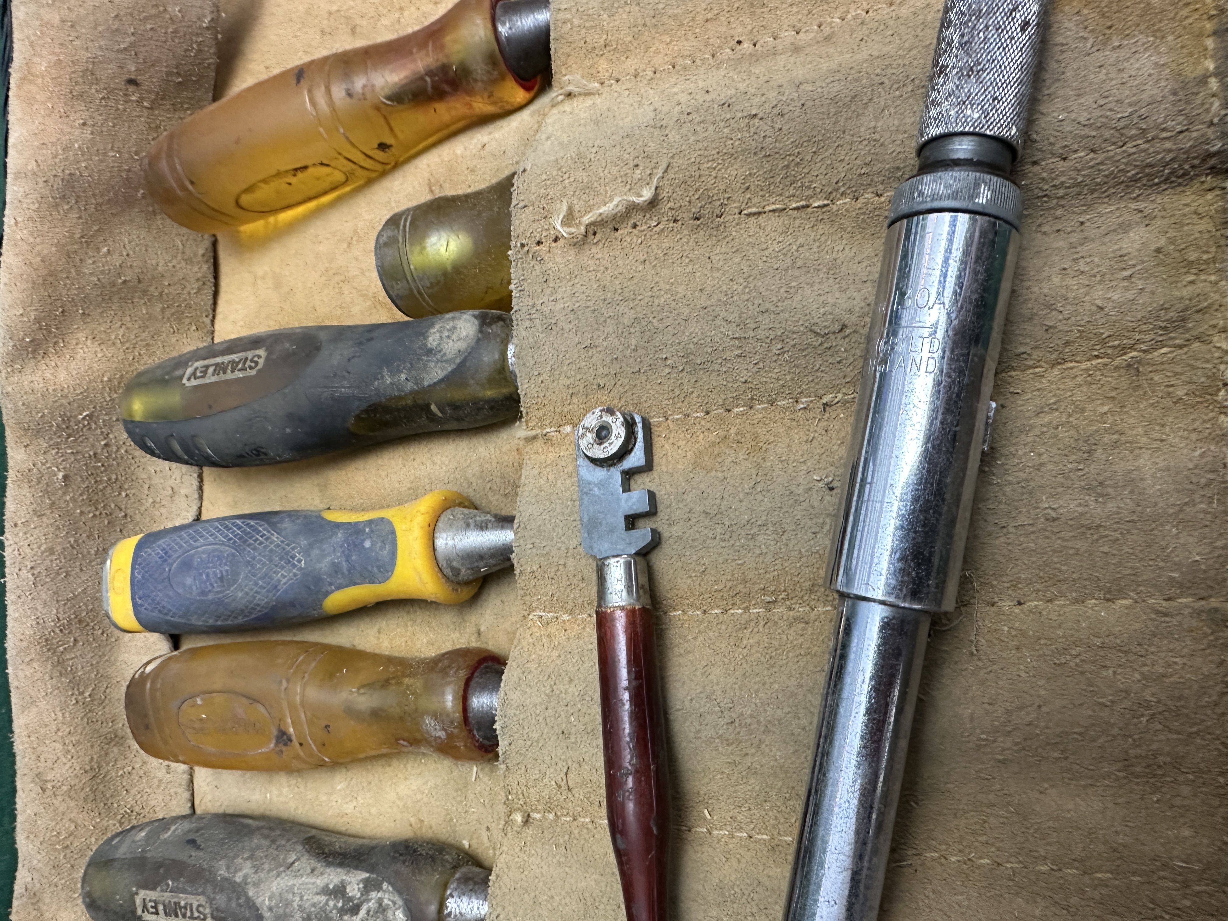 This lot comprises a collection of vintage mechanic’s hand tools housed within a heavily worn, stained, tan leather or suede roll-up pouch. The collection features components from mixed manufacturers, including several pieces marked STANLEY. The centrepiece of the collection is a large metal-bodied spiral ratchet screwdriver, clearly marked “YANKEE” or “AUTOMATIC HAND,” consistent with North Bros. Mfg. Co. models. Other notable items include multiple amber and composite handle screwdrivers, a small wooden spirit level, a wooden folding ruler (measured to 26 inches), and a small glass cutter with a maroon handle. No VIN, part numbers, or specific documentation accompany this lot. This collection represents tools likely used extensively in a garage or workshop environment over many decades.