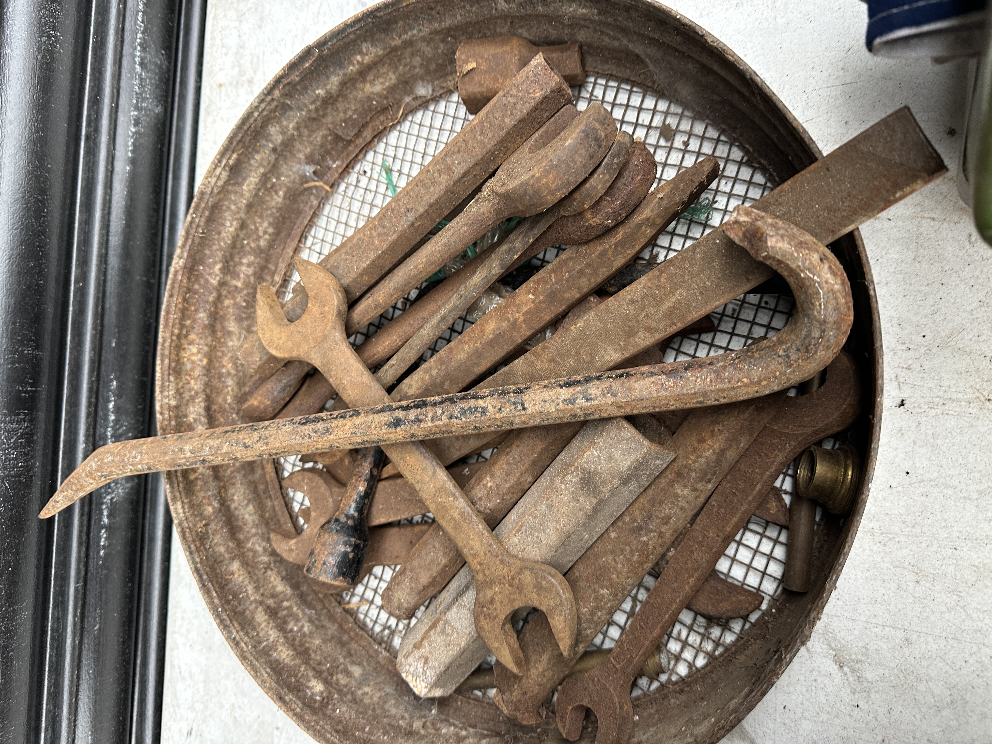 This lot comprises a collection of assorted, heavily corroded ferrous metal workshop implements, presented within a round, rusty metal sifting pan featuring a coarse wire mesh base. The collection includes multiple open-end wrenches of varying sizes, several substantial striking implements or chisels with hexagonal shafts, and a large, curved pry bar. A single small, non-ferrous brass fitting is also present amongst the cluster. These items are general trade implements and are not identifiable as specific OEM automotive parts. No VIN, manufacturer, model, or year information is applicable or available. No documentation is present. Mileage is not applicable.