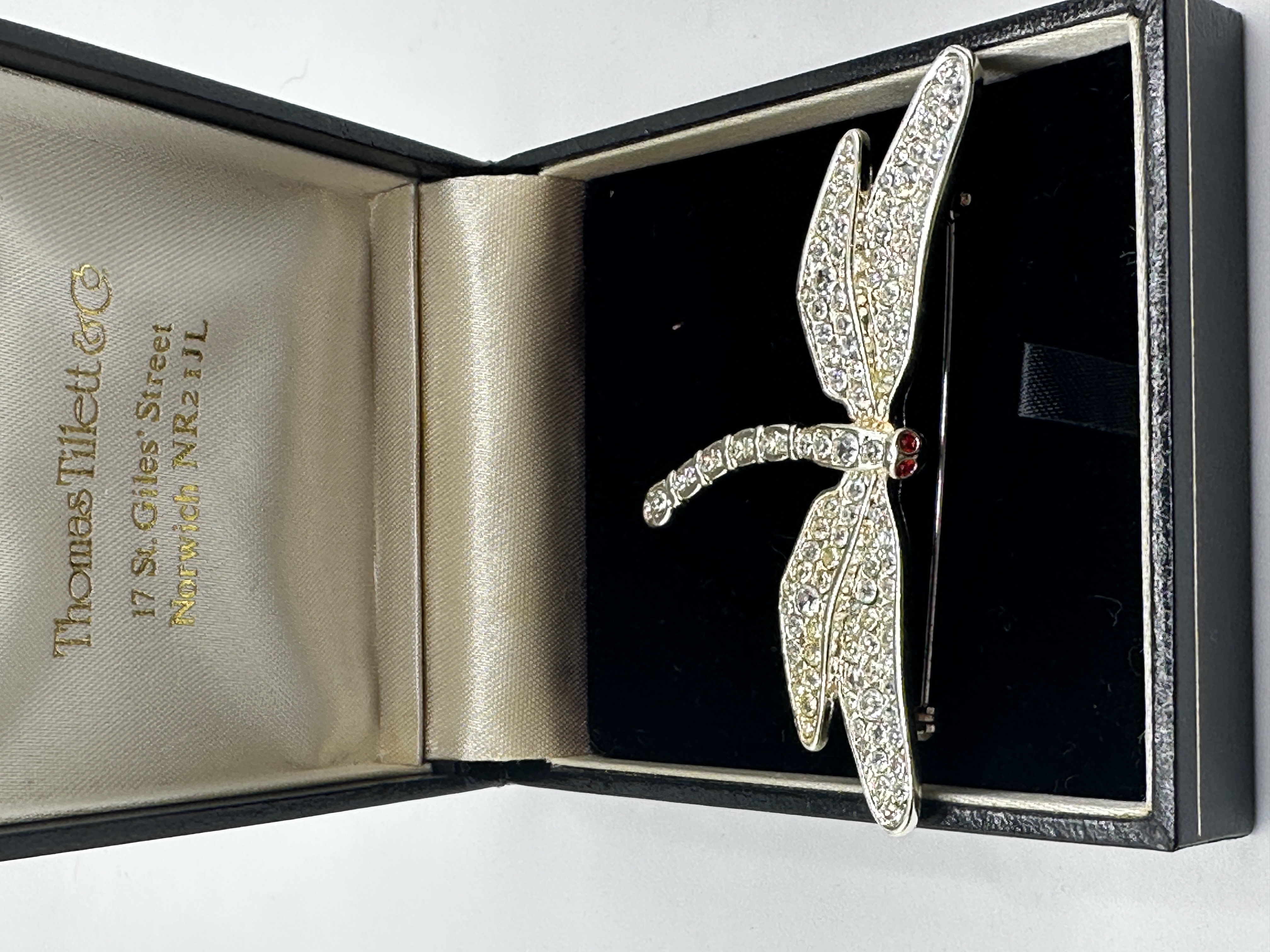A single figural brooch executed in the form of a dragonfly. The piece is constructed from silver-toned metal, likely plated, and is entirely paved with numerous round-cut, colourless paste stones or rhinestones covering the four wings and the segmented body. Two small red paste stones are set at the head/body juncture. The brooch is secured by a standard pin mechanism visible along the reverse. The item is presented in its original hinged black presentation box, which is lined internally with black velvet and champagne satin. The satin lining of the lid bears the gold-printed retailer inscription: Thomas Tillett & Co. / 17 St. Giles’ Street / Norwich NR2 1JL. This piece is characteristic of vintage costume jewellery designs.