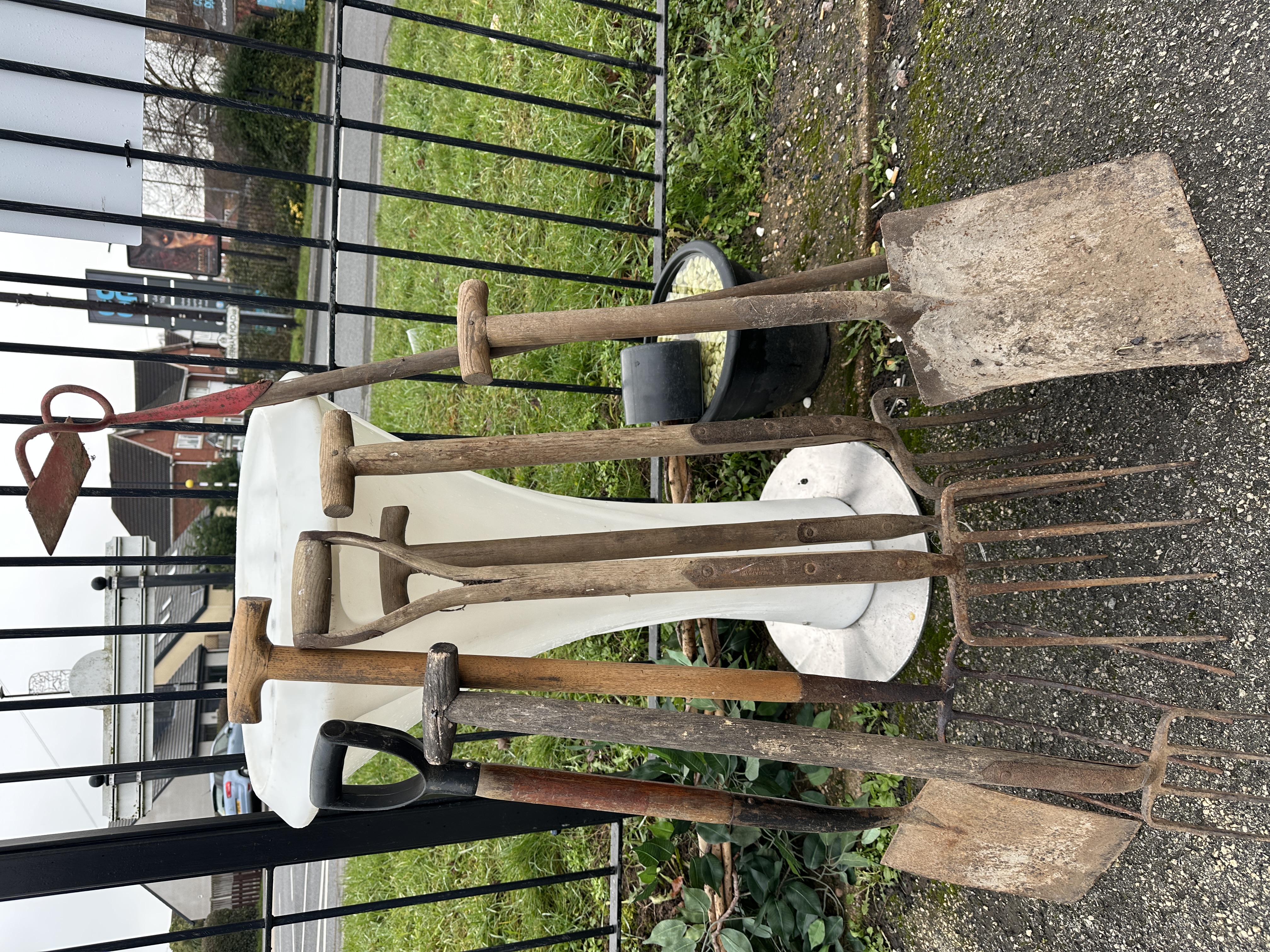 This lot comprises a collection of heavily utilised, traditional long-handled gardening and digging implements, suitable for restoration, practical use, or decorative display. The inventory includes approximately six principal tools: two multi-tined pitchforks or digging forks, several shovels (including one large, square-point blade), and a single hand hoe featuring a red-painted metal head. The tools exhibit varied construction styles, incorporating weathered wooden shafts with traditional wooden T-grips, wooden D-grips, and one modern black rubberised D-grip. No manufacturer markings, part numbers, or documentation are present. Ownership history is unknown.