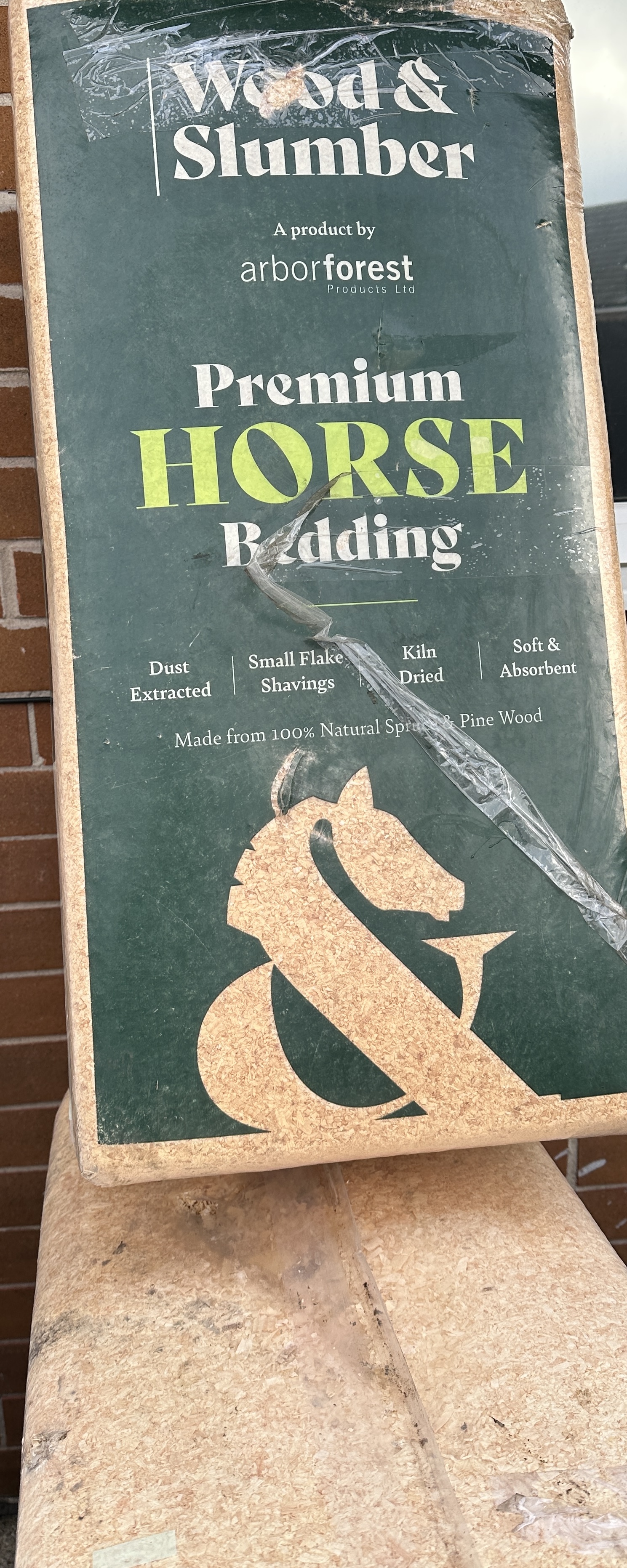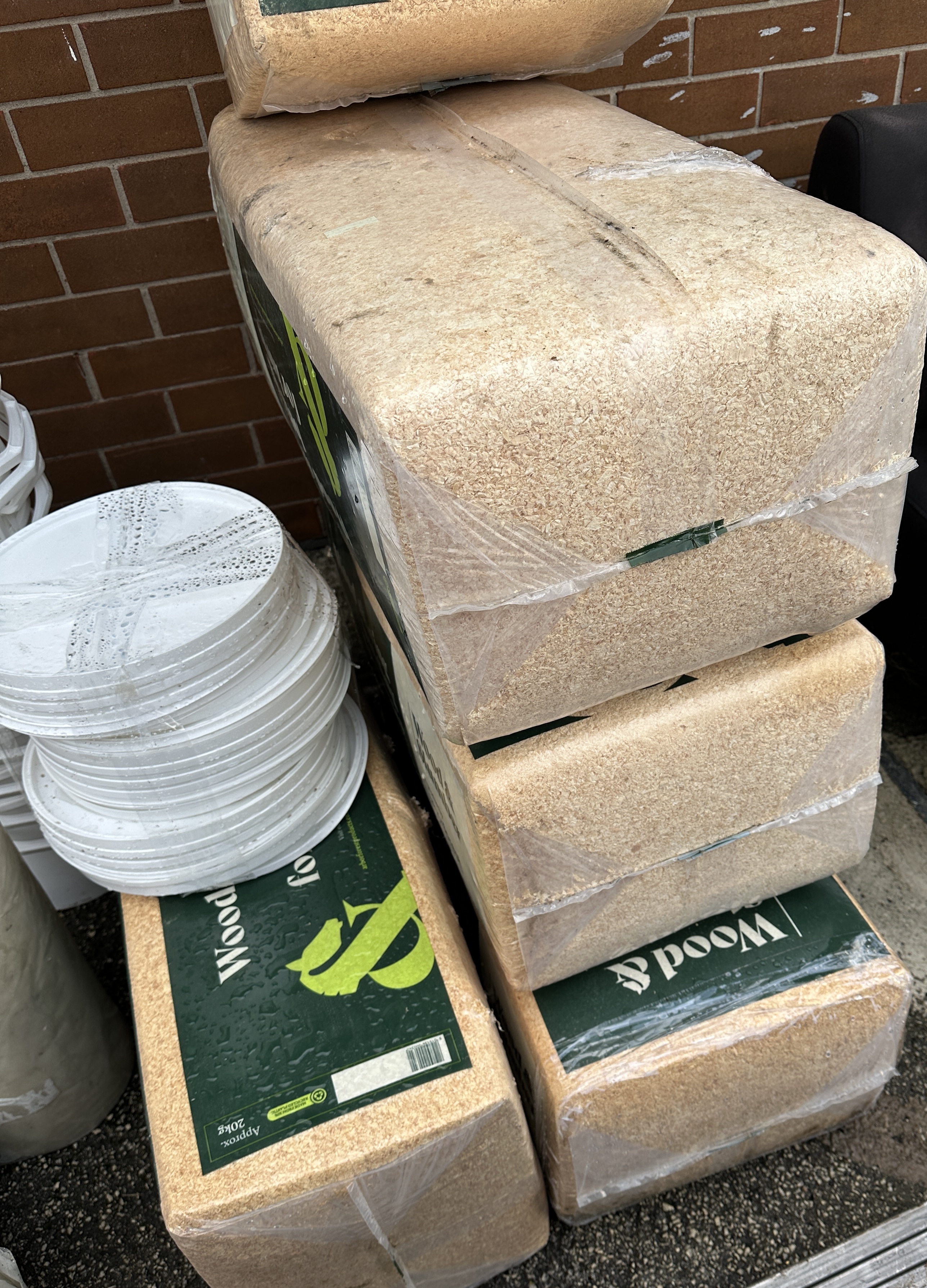 Five 20kg bales of Wood and Slumber kiln dried dust extracted pine and spruce wood shavings for equine bedding accompanied by a stack of white plastic lids.