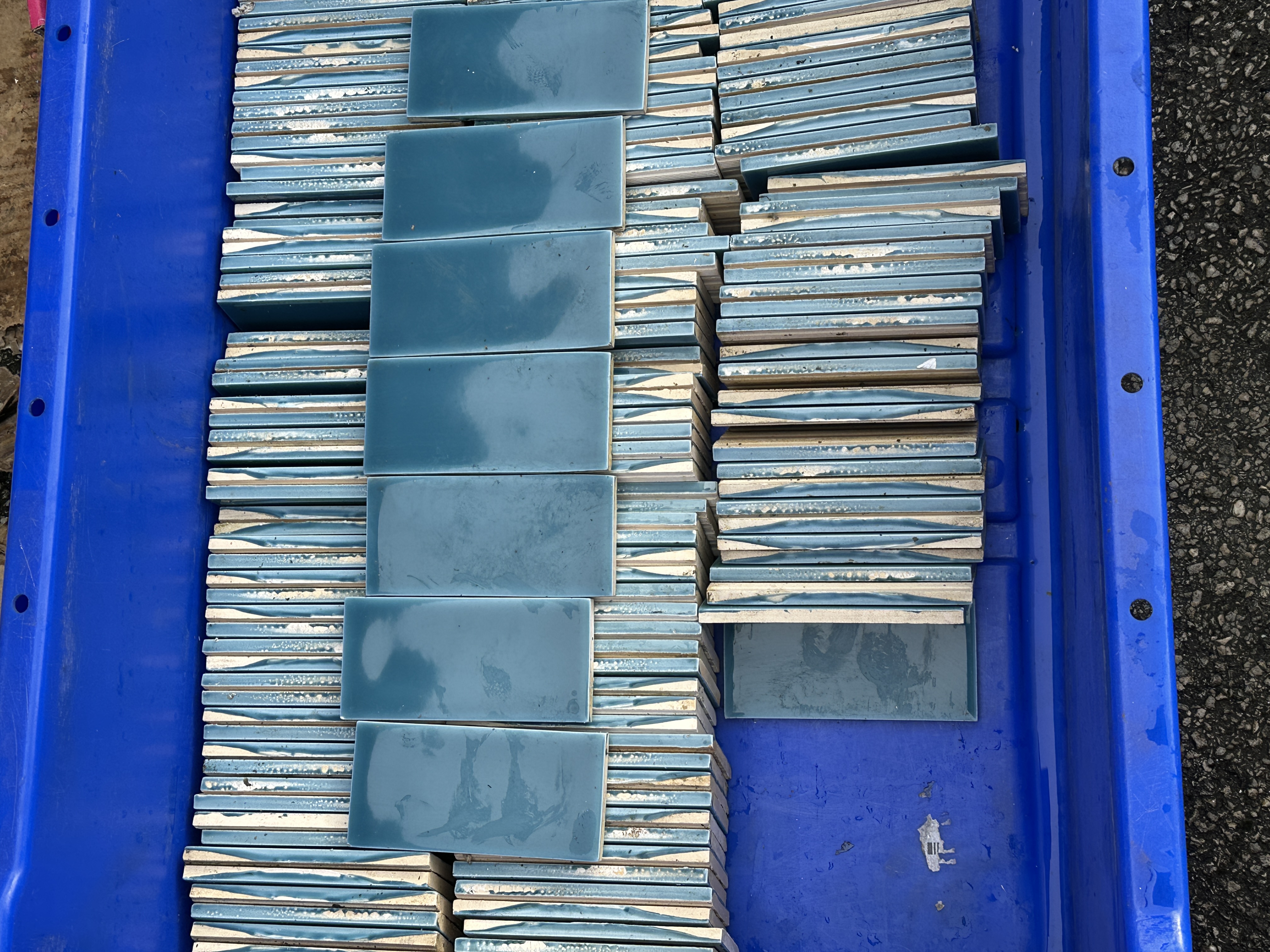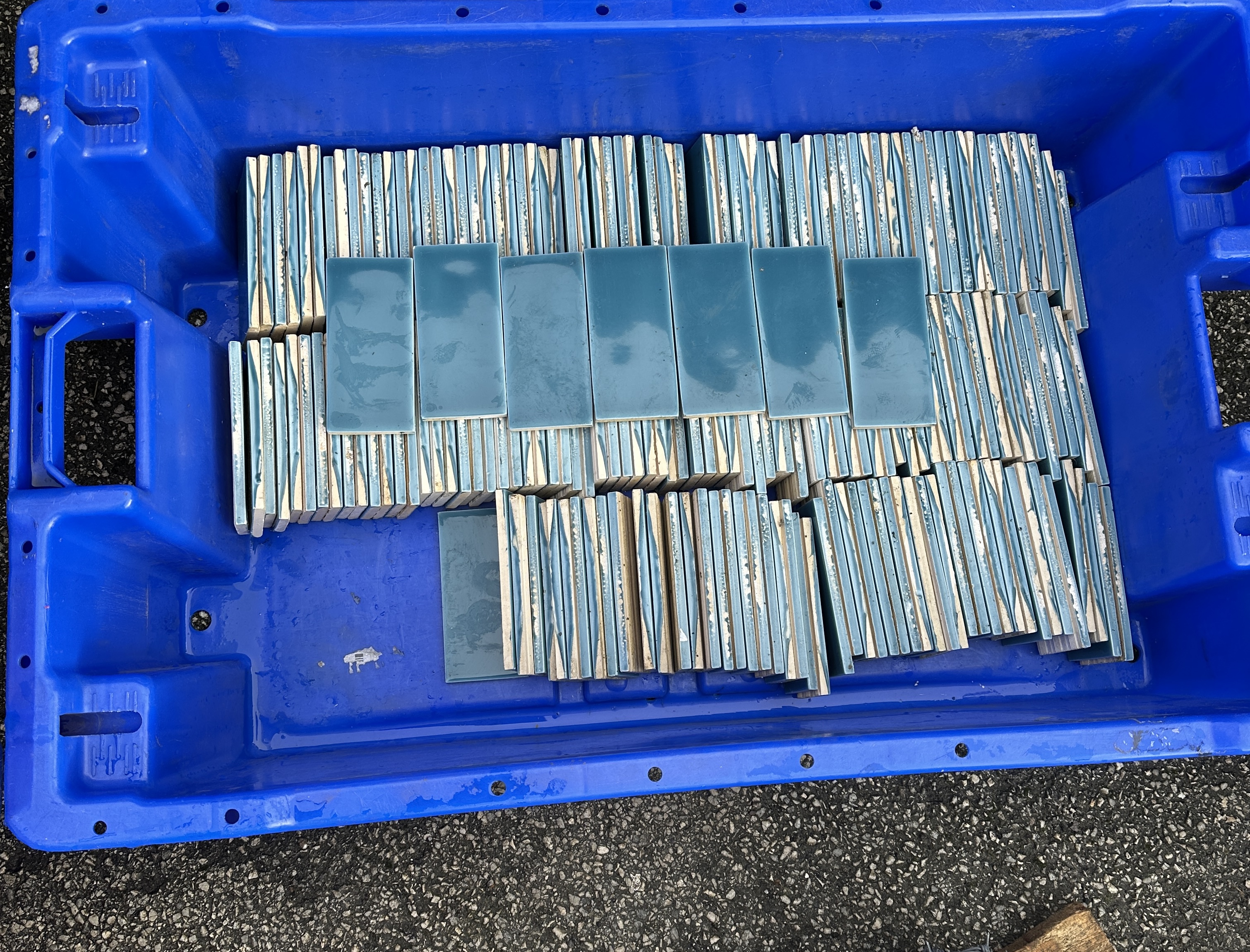 This lot consists of a large quantity of rectangular ceramic tiles, finished in a vibrant, glossy teal/turquoise colour. The tiles are contained within a large, blue plastic high-density polyethylene (HDPE) storage crate. No manufacturer markings, part numbers, or packaging are present. The tiles are believed to be new or unused stock, suitable for decorative wall or floor applications, such as kitchen splashbacks or bathroom installations. Exact dimensions are unverified, but the tiles appear to measure approximately 4 inches by 8 inches (approx. 10cm x 20cm). The total quantity is estimated to be several hundred pieces, sold as a single bulk lot. No documentation, service records, or ownership history is available. This item is not a vehicle or a standard automotive component.