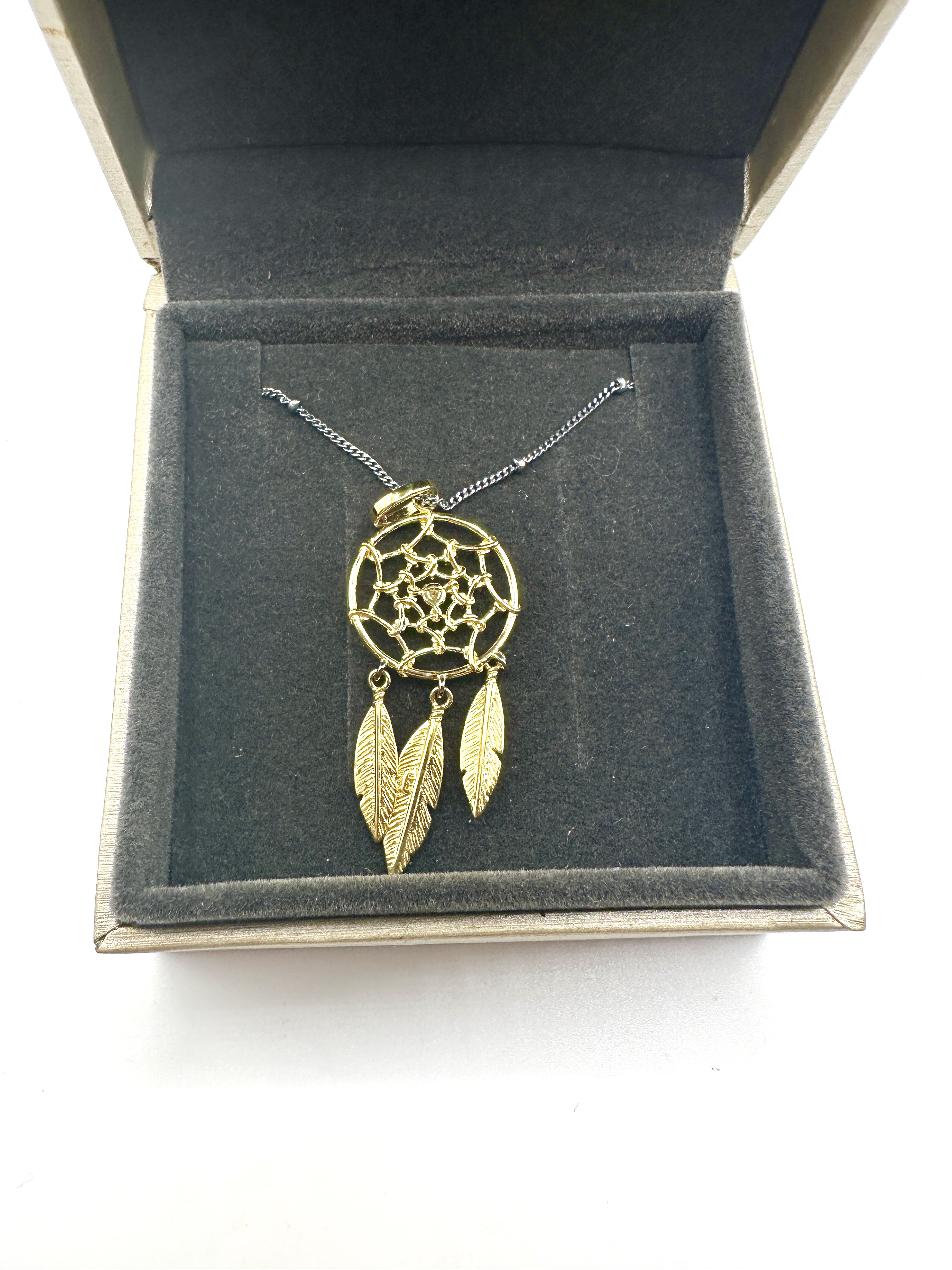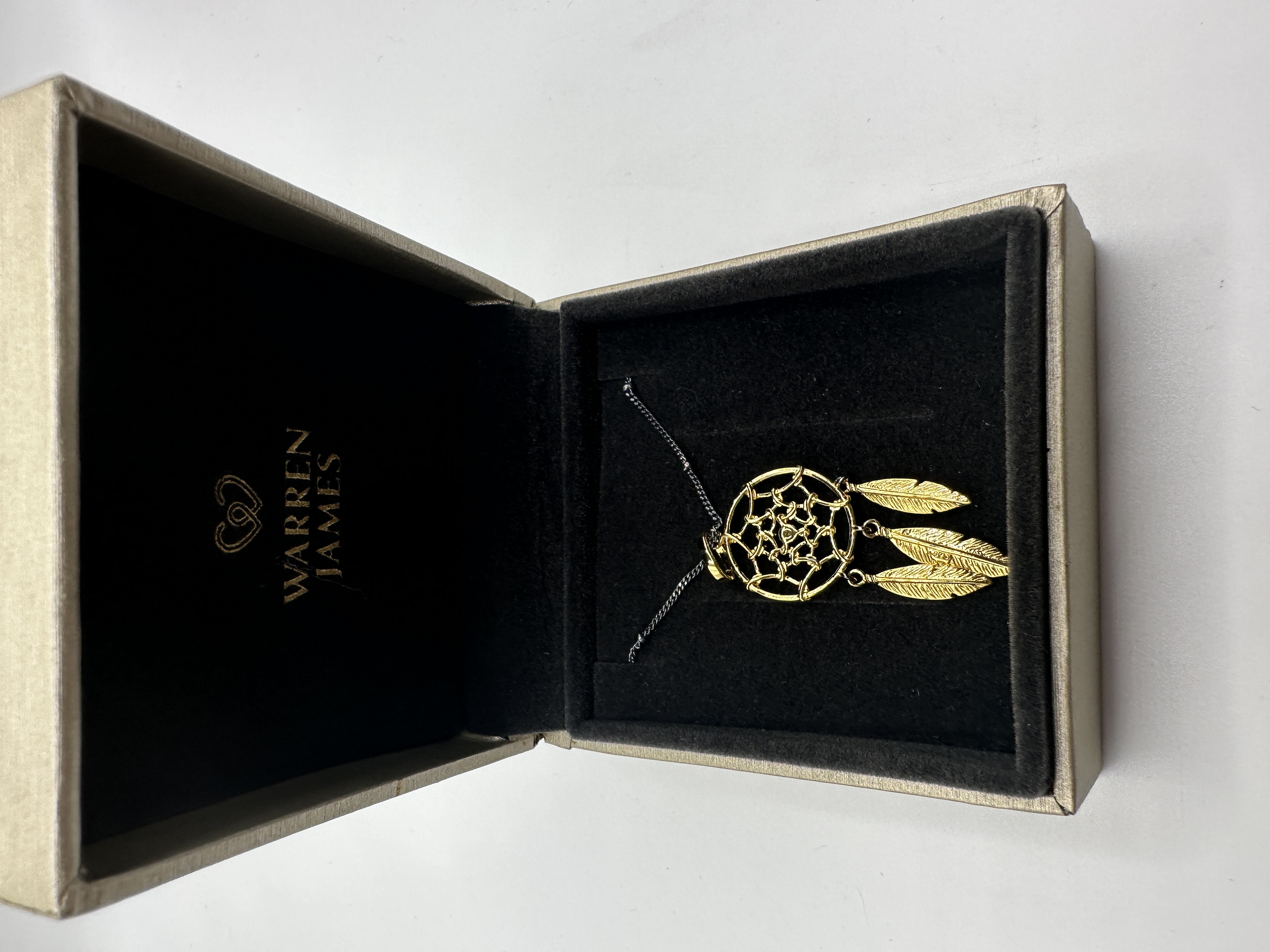 A Warren James Dream Catcher necklace. The piece features a circular openwork pendant styled as a dream catcher, crafted from yellow gold-tone metal, likely plated sterling silver as suggested by market comparables. Three detailed feather charms dangle from the bottom of the pendant. The pendant is suspended from a contrasting dark grey or blackened metal chain, consistent with a choker style. The necklace is presented in its original branded jewellery box featuring a textured light tan exterior and dark fabric interior lining. The interior lid of the box is marked vertically with the brand name “WARREN JAMES” alongside a stylized heart logo in gold lettering.