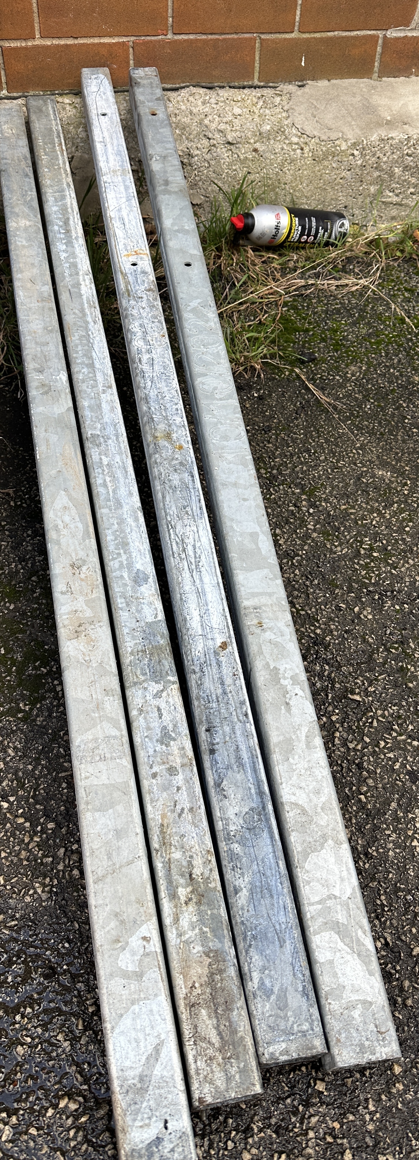 A lot comprising four identical, long, rectangular galvanized steel beams. These are generic structural members, likely intended for heavy-duty applications such as trailer chassis fabrication, boat lift bunks, or custom commercial vehicle racking systems. No manufacturer identification, part numbers, or specific vehicle compatibility information is available. The beams appear to be of substantial gauge steel, hot-dip galvanised for corrosion resistance. A Holts Puncture Repair aerosol can was observed near the beams during inspection, suggesting a general vehicle maintenance context, though it is not included in the lot. Dimensions are approximate based on visual inspection (length is significant, rectangular profile). Documentation: None present.