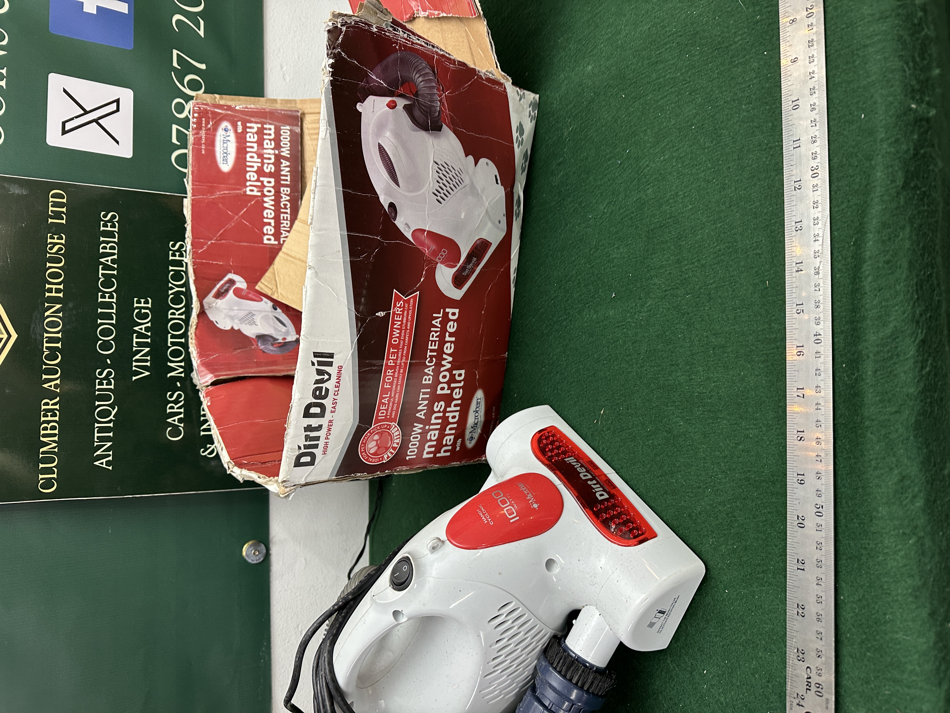 This lot comprises a Dirt Devil Handy Cyclonic handheld vacuum cleaner. The unit is mains powered and rated at 1000 Watts. It features Microban anti-bacterial technology, designed for efficient cleaning, potentially suitable for vehicle interiors and general household use. The unit is finished in white with distinctive red accents and includes the attached power cord and hose assembly. VIN is not applicable. Mileage is not applicable. Documentation includes the original retail box, though it is heavily damaged, crushed, and torn. Ownership history is unknown.