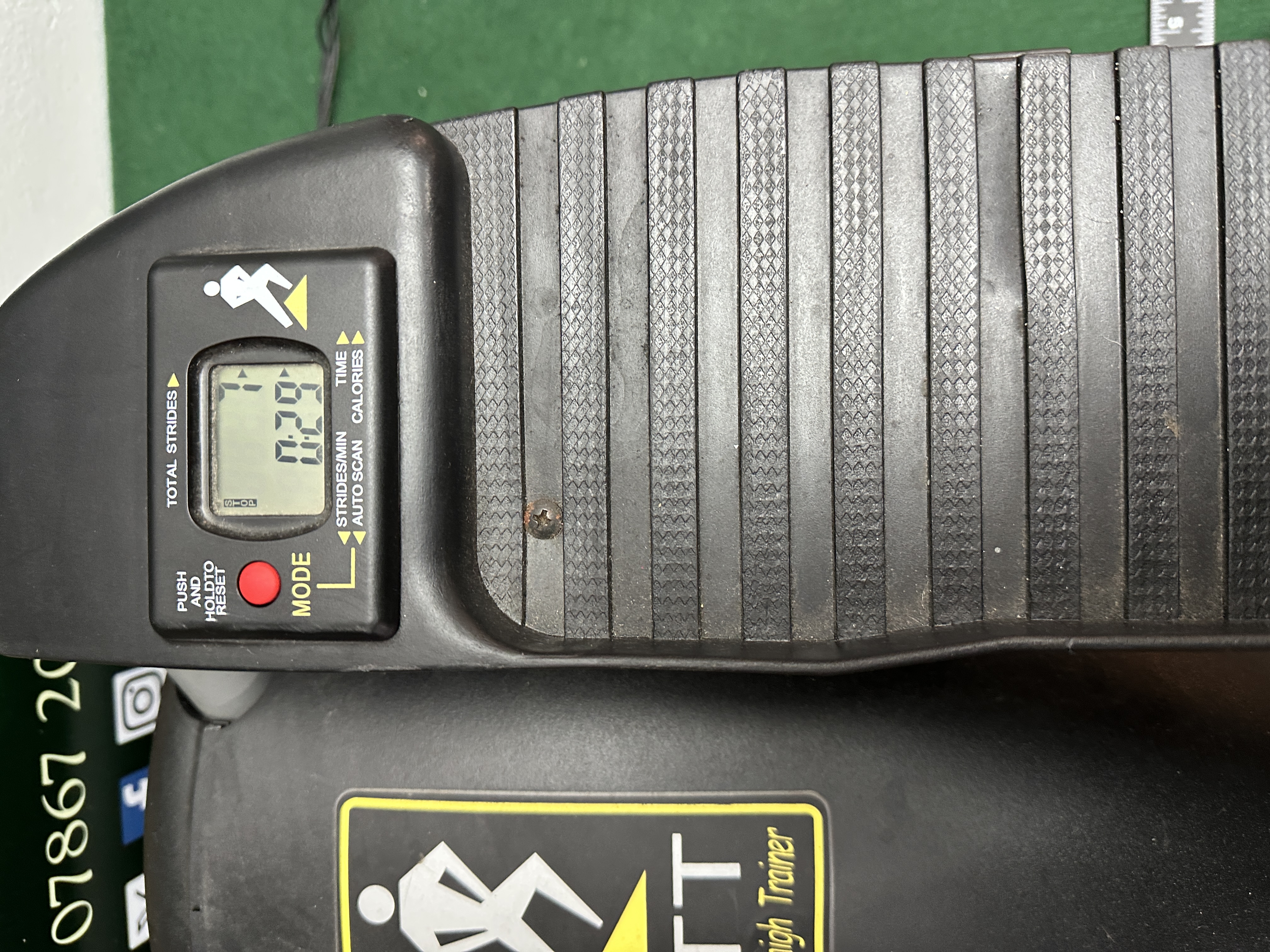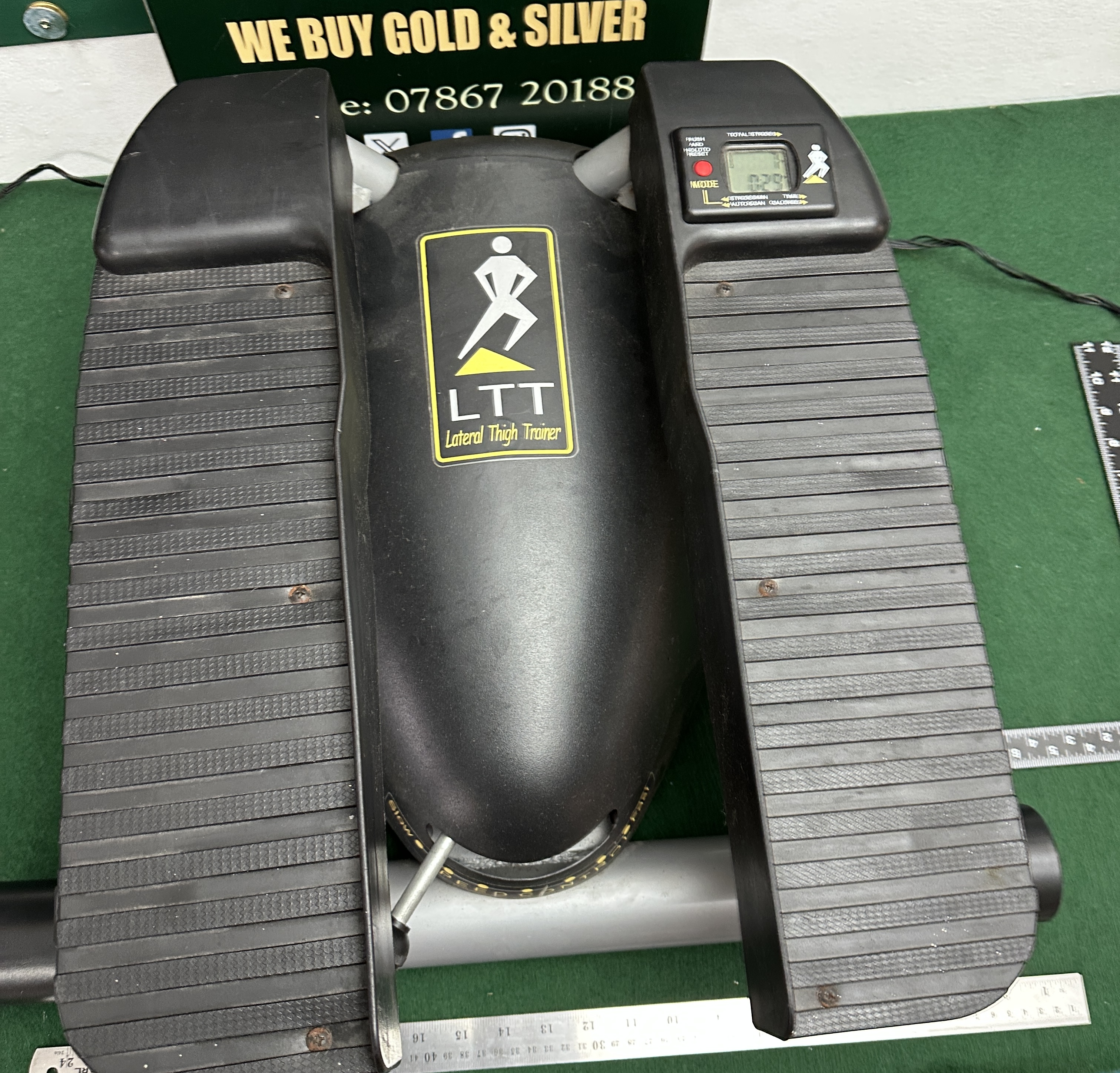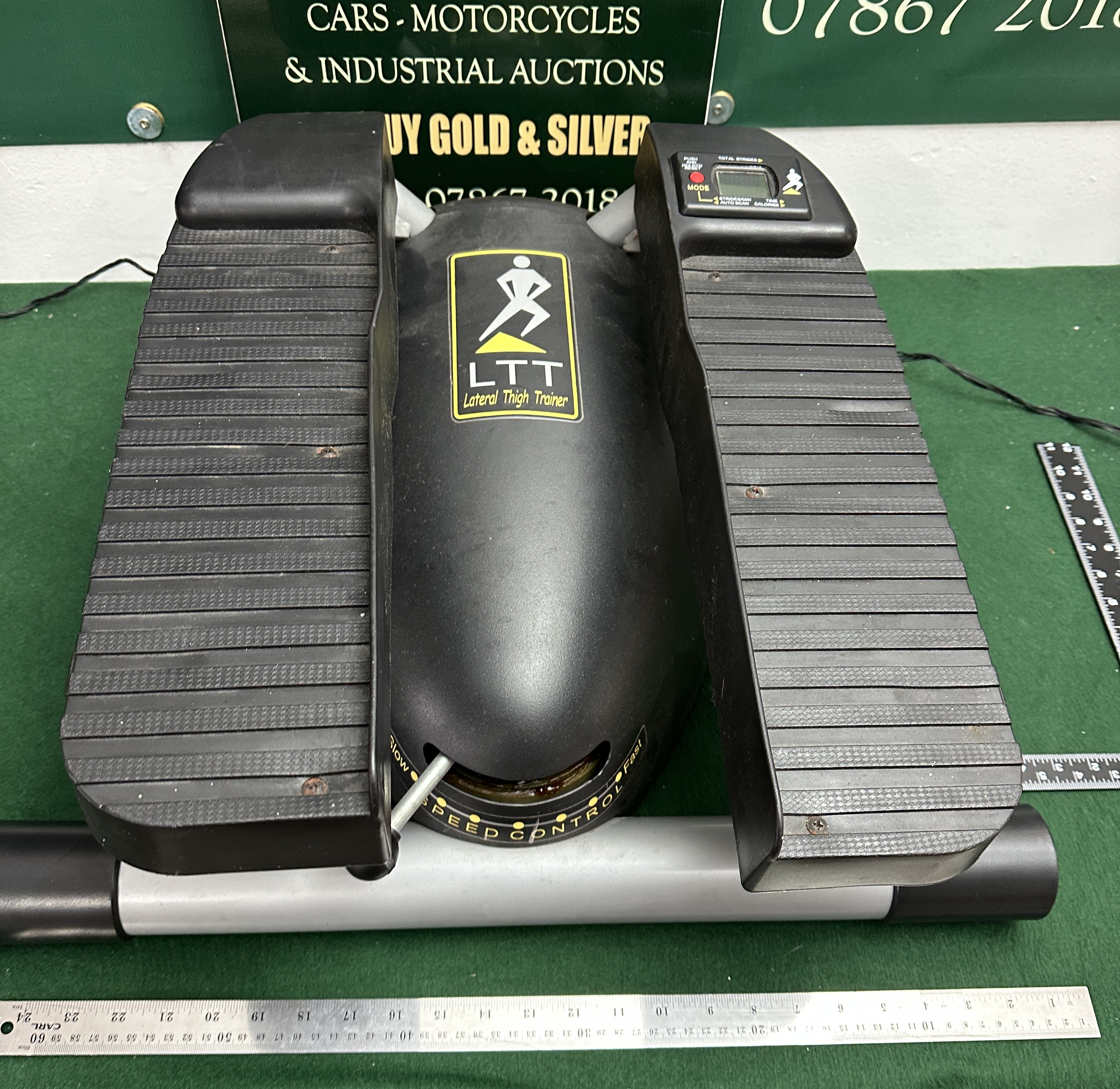 This listing is for a used LTT Lateral Thigh Trainer. This piece of personal exercise equipment is designed to simulate a stair stepper motion while engaging lateral thigh muscles. The unit features a black plastic housing and ribbed foot platforms mounted on a grey metallic stabilising base. Instrumentation includes a functioning digital console displaying usage metrics such as Total Strides, Time, and Calories. Resistance is manually adjustable via the front centre speed control dial, which is often associated with a seven-speed system.