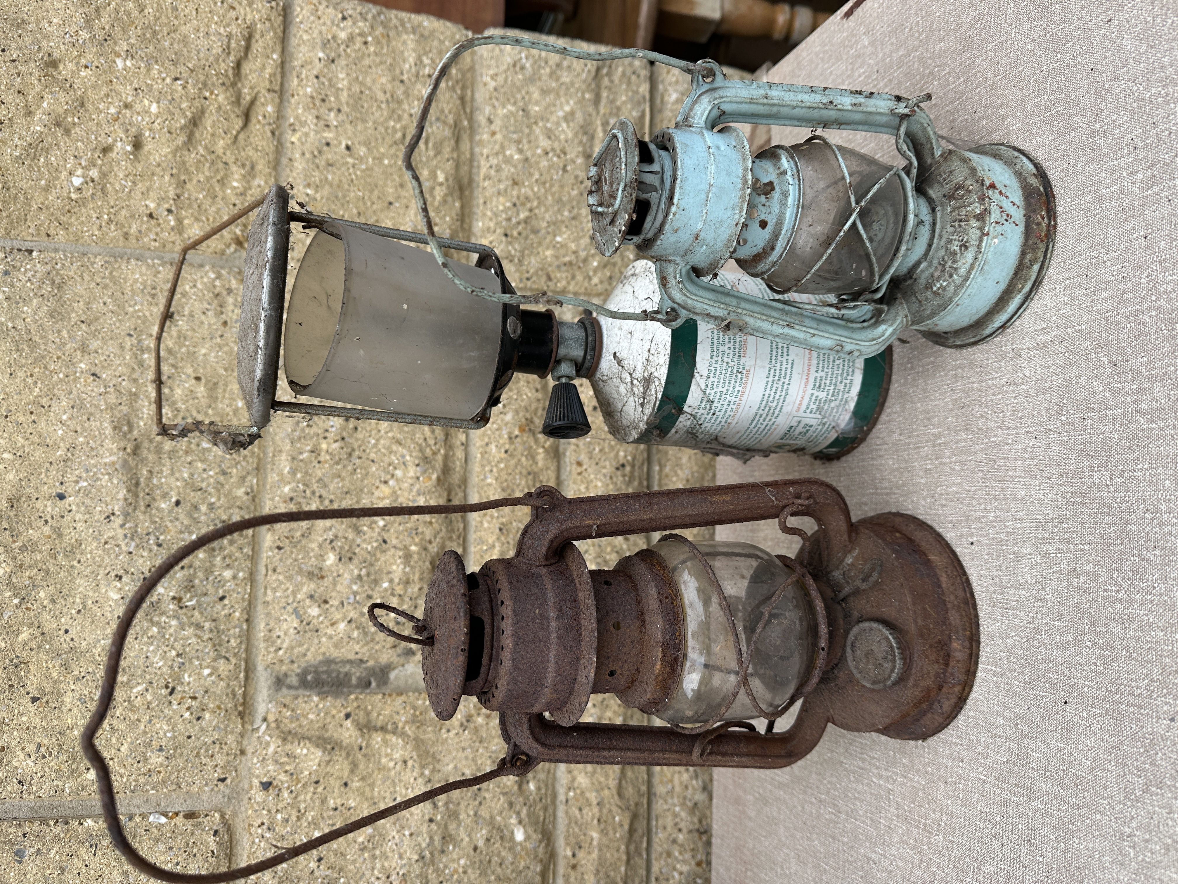 A pair of vintage portable lanterns offered for restoration or decorative display. This lot comprises two distinct styles of lighting accessories commonly used in classic camping or utility settings. The first lantern is a pressurised gas model, featuring a distressed light blue/teal colour metal head with a round glass globe and protective wire bail. This unit is currently attached to a disposable fuel canister, likely containing propane gas, which features partially legible warning labels including ‘HIGHLY FLAMMABLE’. The second lantern is an antique wick-style or hurricane lantern, heavily oxidised and covered in dark reddish-brown rust. Research suggests this style is consistent with early 20th-century manufacturers such as Dietz. It features a clear glass globe secured by a rusty wire frame. No specific manufacturer names, part numbers, or dates are legible on either item. Documentation: None present. Ownership history is unknown.
