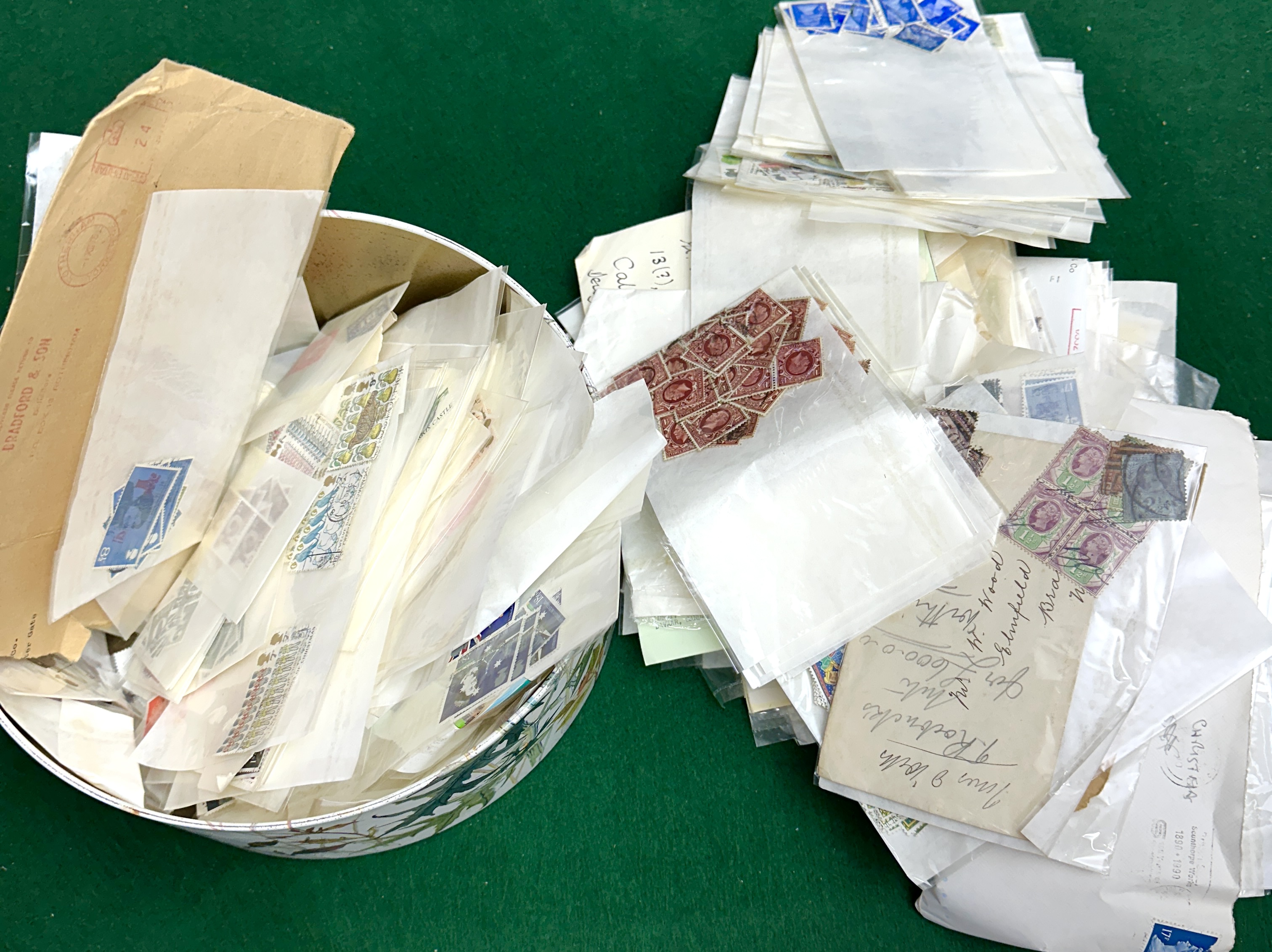 This lot comprises a substantial quantity of assorted postage stamps, housed primarily in glassine envelopes, plastic sleeves, and various paper envelopes, some contained within a decorative cylindrical tin. The collection appears to be a personal accumulation, featuring stamps from various nations, including identifiable vintage British and possibly German issues. Handwritten notes referencing individuals (e.g., Mrs. J. Roth) and locations are present on some envelopes, alongside vintage mailing envelopes (one marked DRADFORD & SON). This item is strictly philatelic material; no motor vehicle, major vehicle component, or related documentation is included. VIN: Absent. Engine: Not Applicable (N/A). Transmission: N/A. Mileage: N/A (Odometer reading absent). Colour: Mixed, featuring various stamp colours and paper tones. Features: Bulk quantity, varied international content, historical ephemera. Documentation: Limited to handwritten collector notes and vintage mailing envelopes; no vehicle title or service history is present. Ownership History: Appears to be a single, private collector’s accumulation.