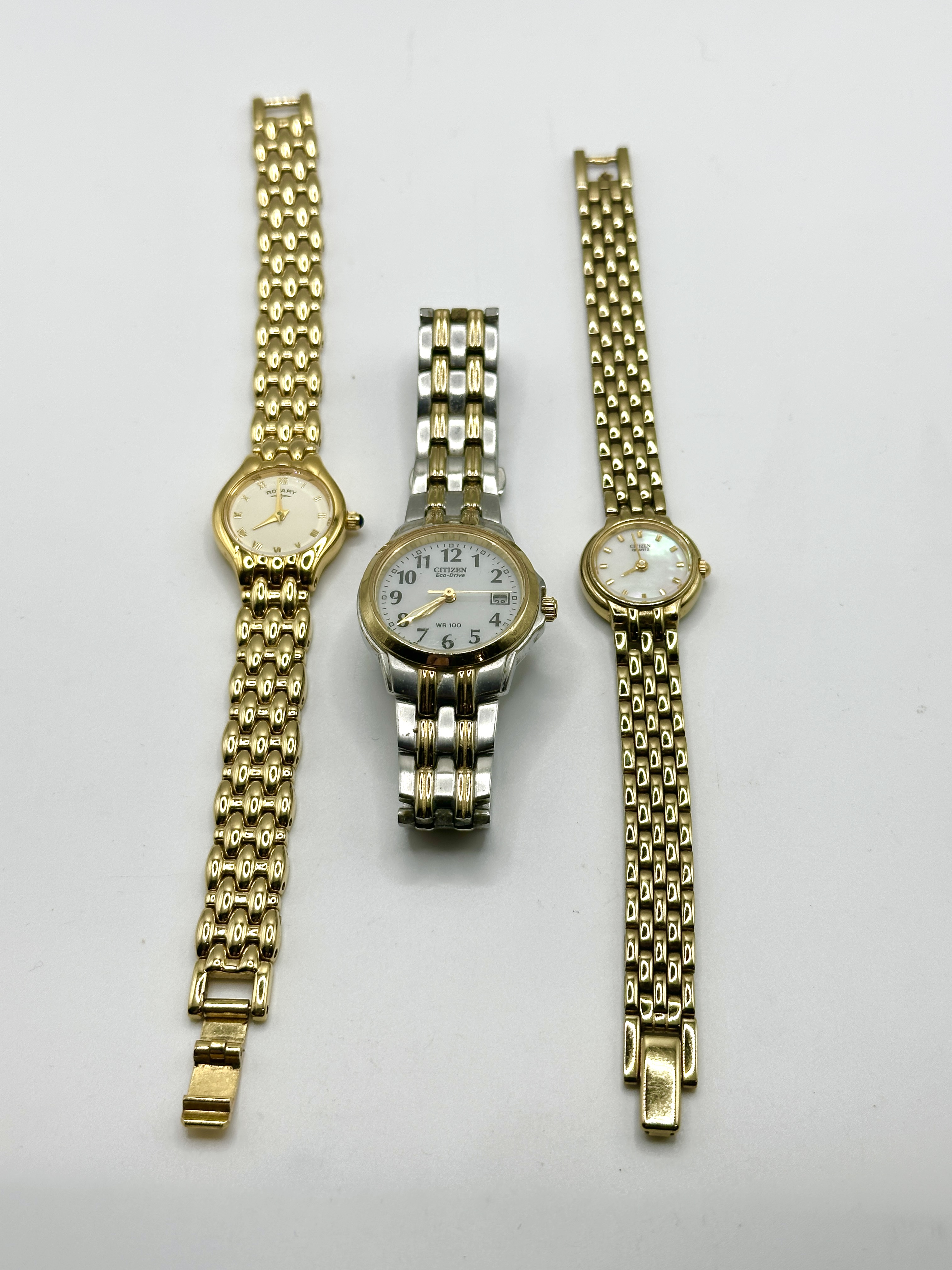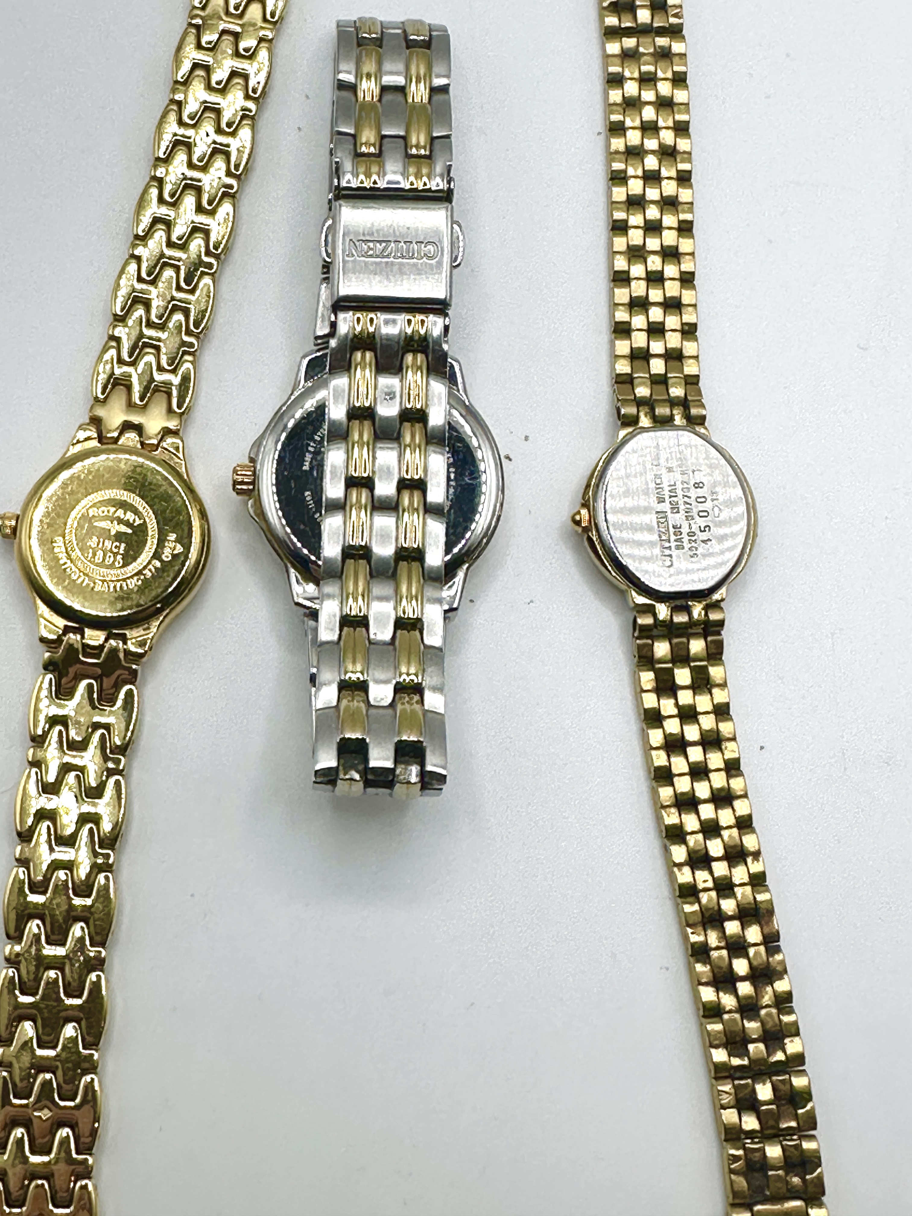 The third watch, positioned on the right, is a small, gold-tone Citizen model. It features a mother-of-pearl dial and is presented on a finely linked band. The case back is marked CITIZEN WATCH CO. and BASE METAL VP.