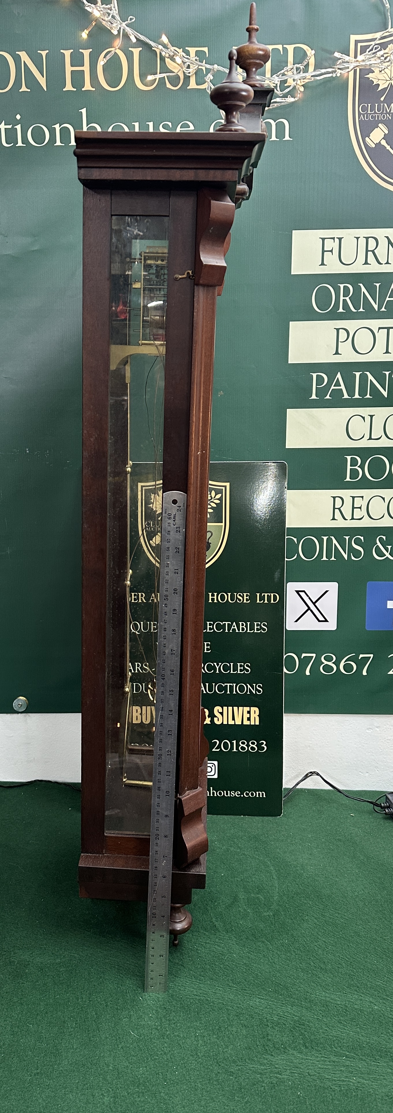 This item is a highly decorative wall-mounted regulator clock, identified stylistically as a Vienna Regulator. The clock features a tall, narrow case constructed of dark stained wood, characterised by ornate upper carvings and finials. The movement is weight-driven, evidenced by the visible winding cables and the large, highly polished brass spherical pendulum bob. The time is displayed on a white dial featuring black Roman numerals and decorated hands, housed within a polished brass bezel. Due to the nature of the item, no manufacturer stampings, model numbers, or VIN equivalent are present. The exact year and maker are unknown; research suggests Austrian or German origin, potentially dating from the late 19th or early 20th century. VIN: N/A. Mileage: N/A. Colour: Dark Stained Wood. Documentation: None available.