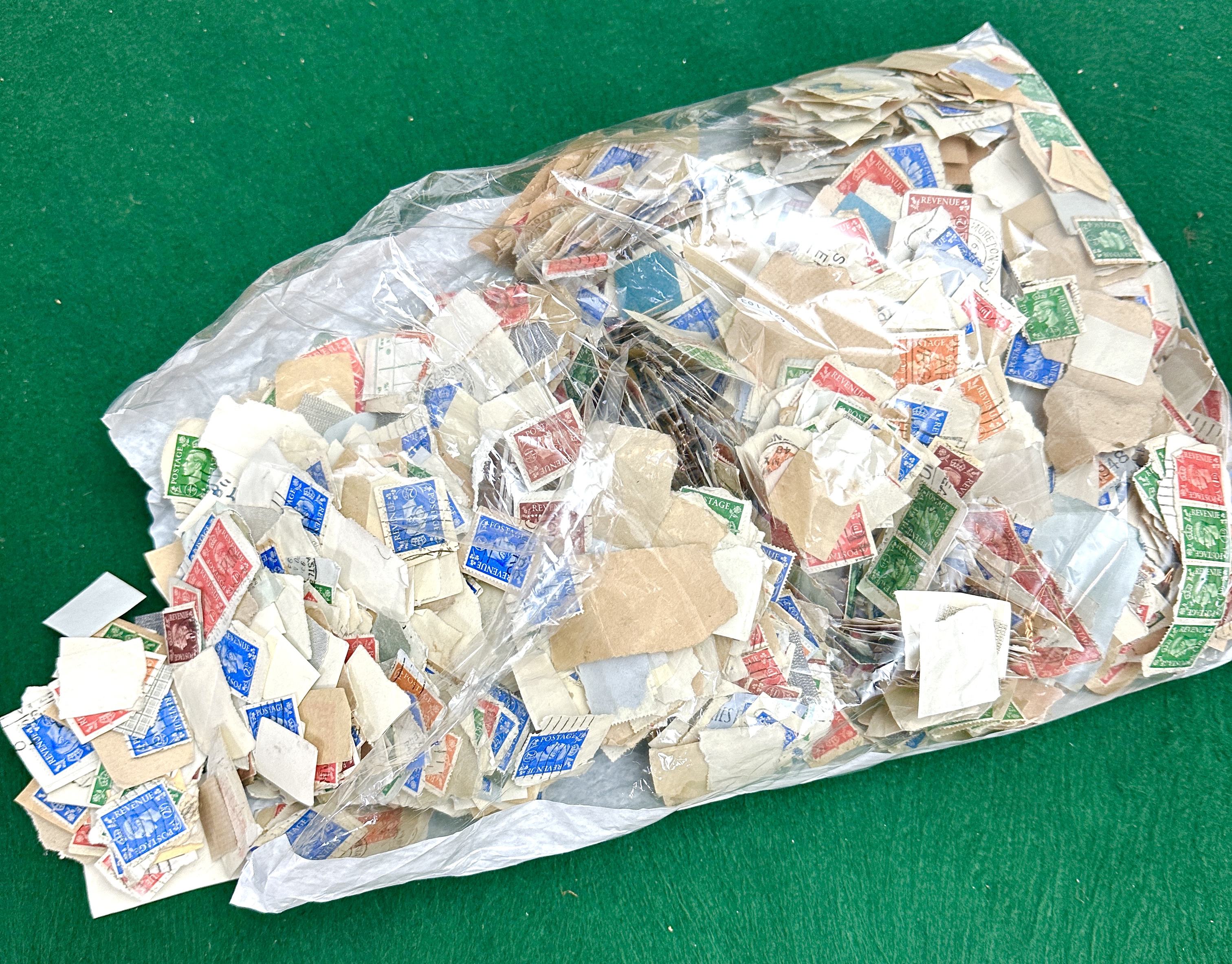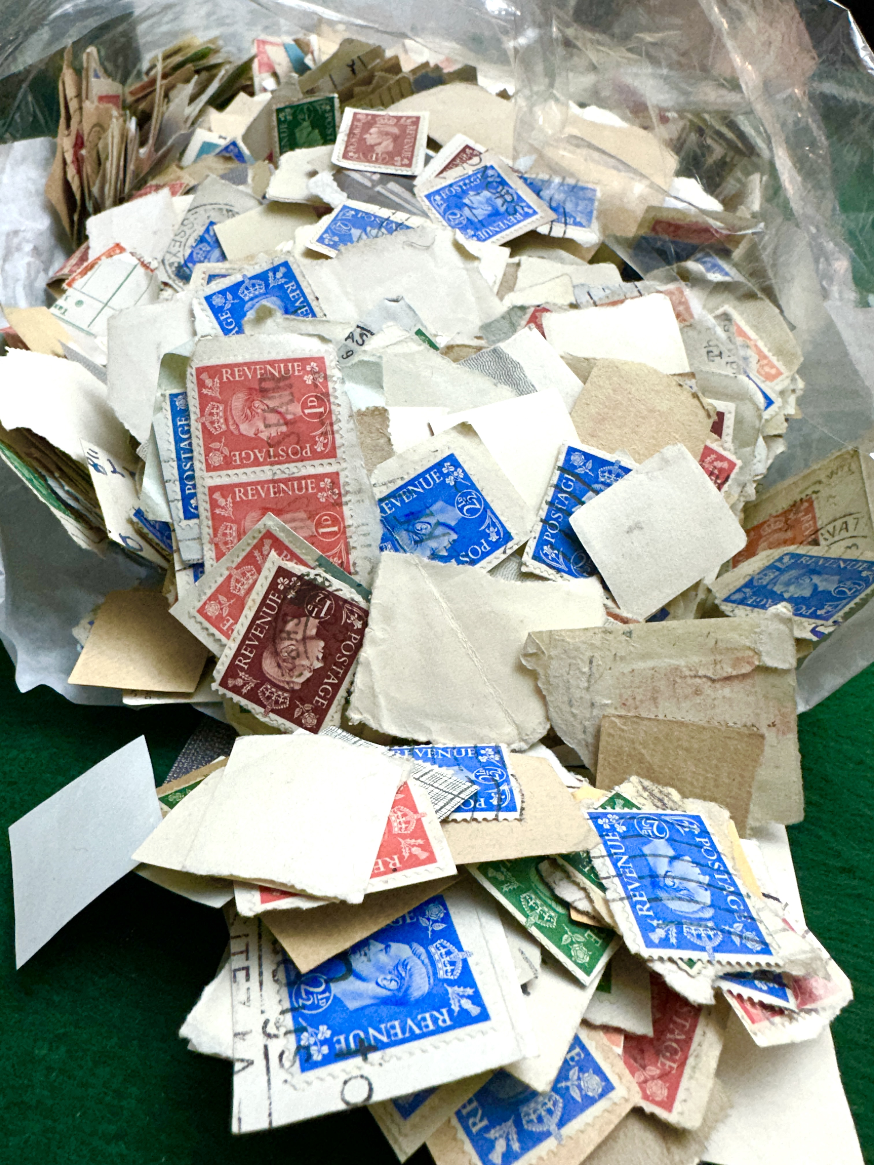 An assortment of international postage stamps, presented as kiloware still attached to portions of their original paper envelopes. The collection includes various mid-20th-century issues, with visible examples featuring British definitive designs such as King George VI and Queen Elizabeth II. The stamps exhibit a wide array of colours and denominations, with many featuring circular date stamps and other postal cancellations. Inscriptions include the words POSTAGE and REVENUE. The material is contained within a clear plastic bag.