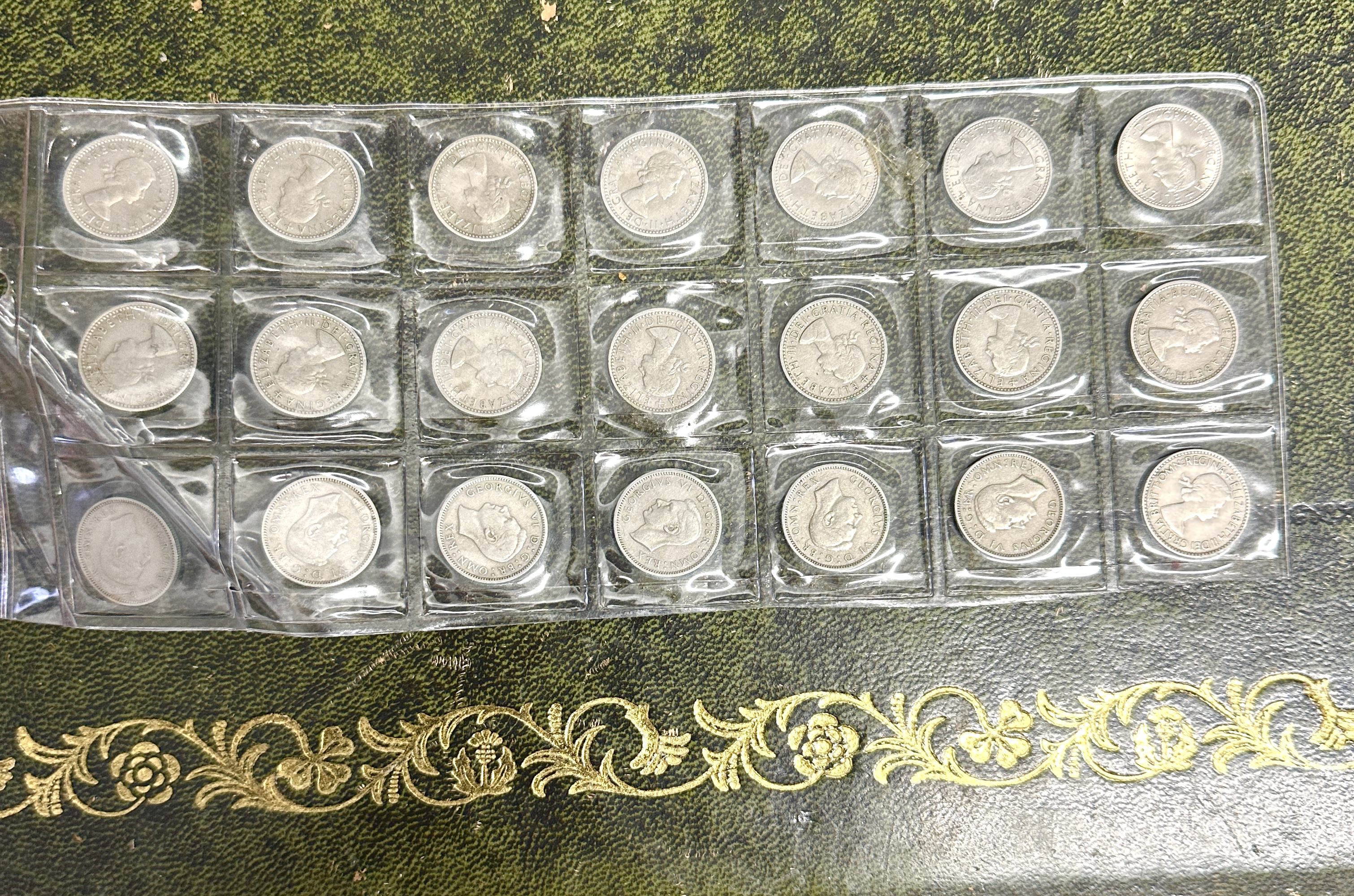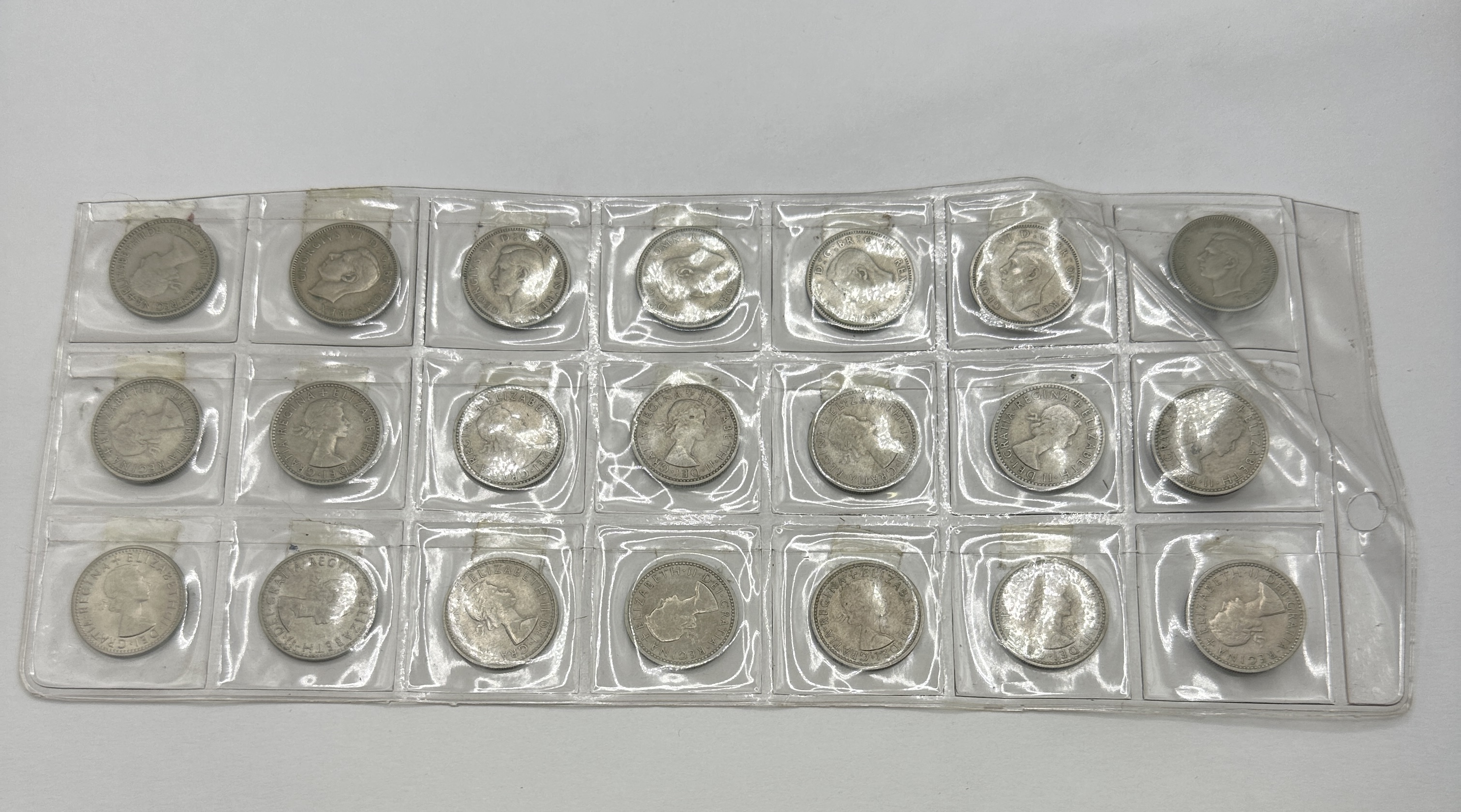 A collection of mid-20th century British silver-coloured coins, likely struck in cupro-nickel or a silver alloy. The obverse sides feature the profile portraits of two monarchs: King George VI, facing left with the Latin inscription GEORGIVS VI D:G:BR:OMN:REX, and Queen Elizabeth II, facing right with the inscription ELIZABETH II DEI GRATIA REGINA. The coins are presented in a clear plastic pocketed storage sleeve.