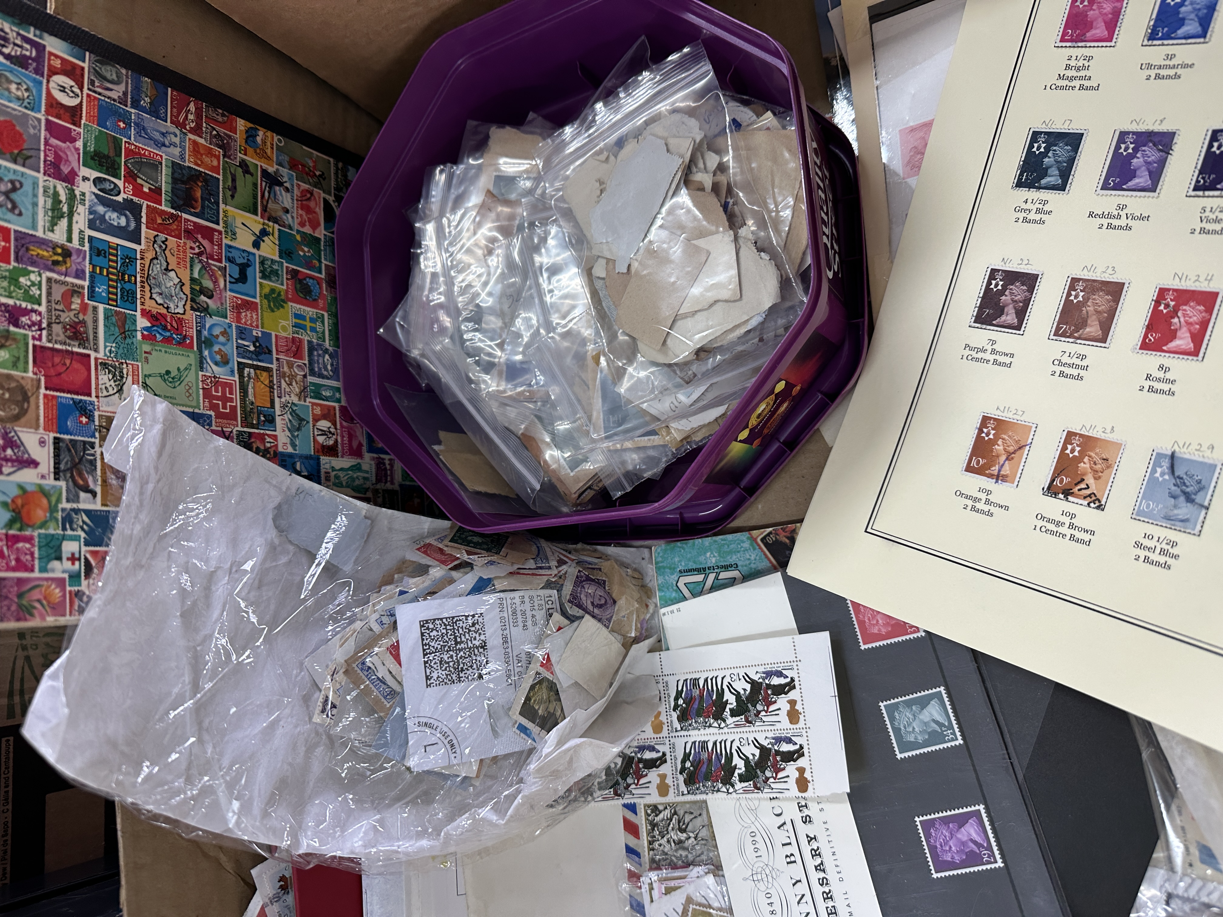 An assortment of postage stamps and philatelic materials contained within a cardboard box. The collection includes multiple stamp albums, display sheets, and a significant quantity of loose stamps stored in plastic bags and a purple plastic tub. Notable items include a reference sheet for Decimal Currency Issued 7 July 1971-1993 featuring various Machin series stamps, and a commemorative sheet for the Penny Black 150th Anniversary (1840-1990). Also present is a blue-spined binder labeled 3 Assorted & Post&Go. The materials consist of paper stamps, some remaining on original envelope fragments or backing, alongside plastic protective sleeves and cardboard storage components. The collection features both British and international examples.