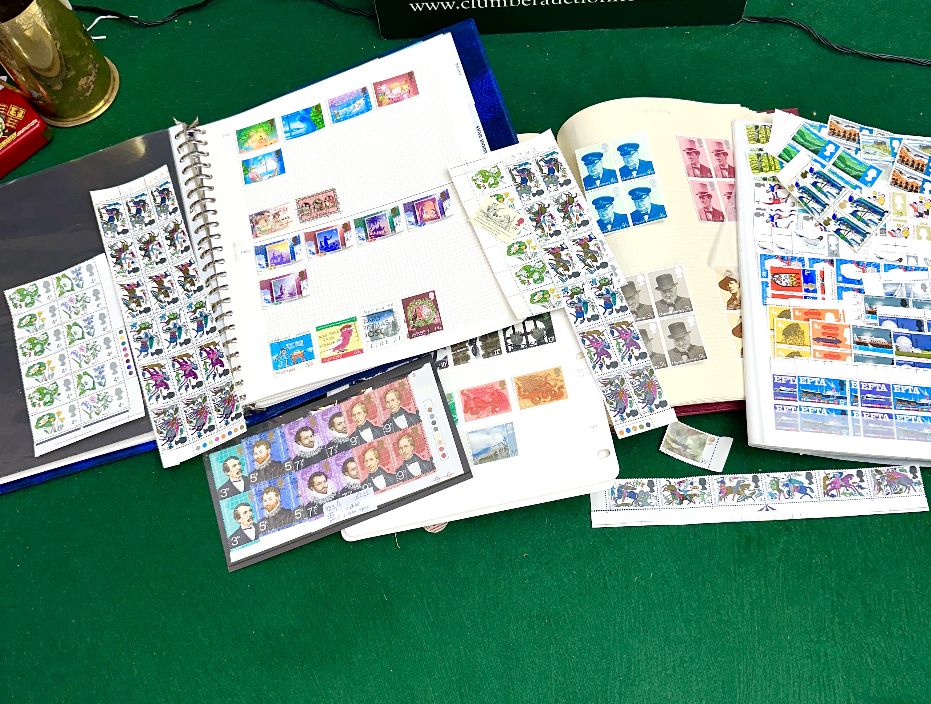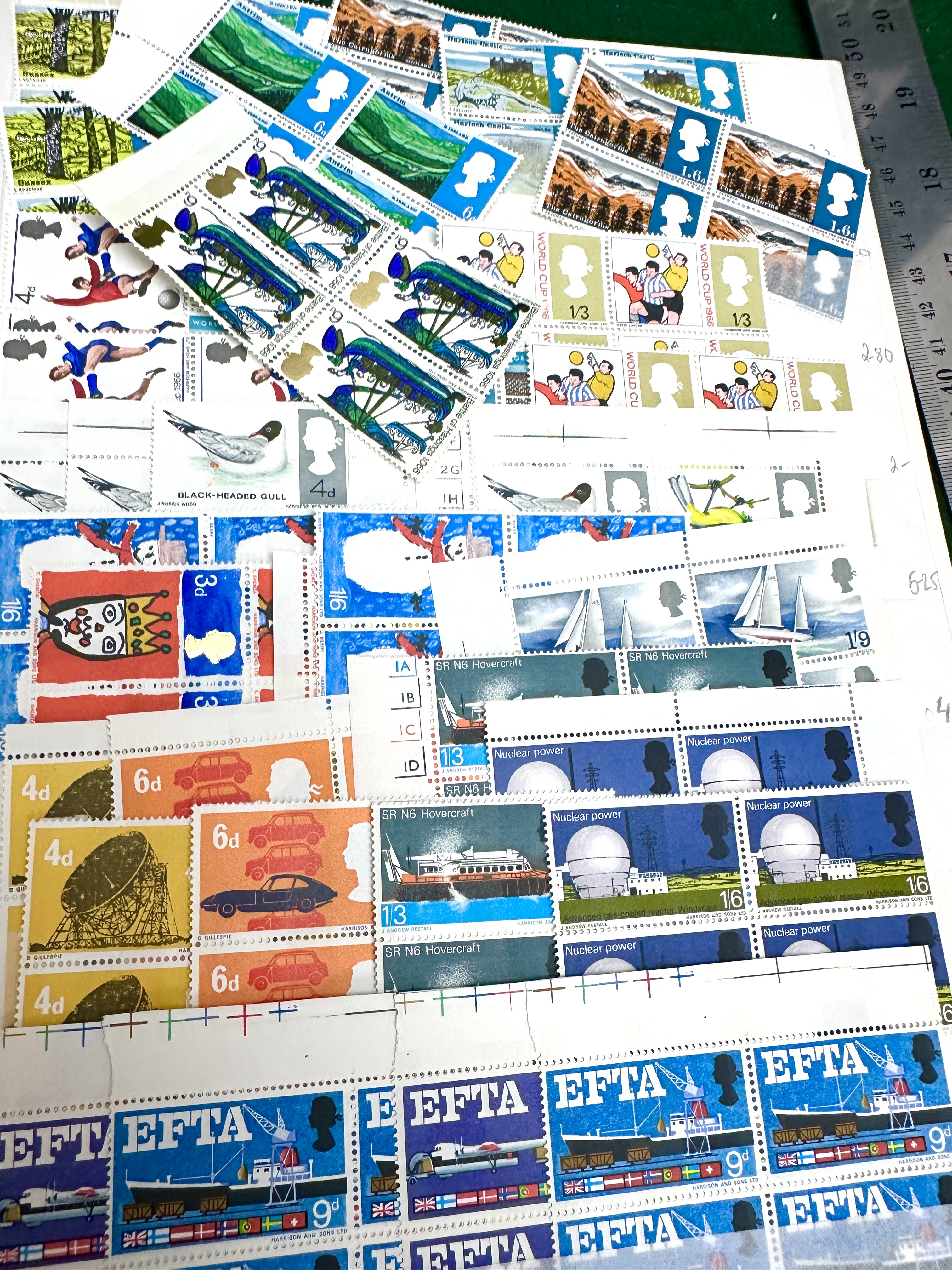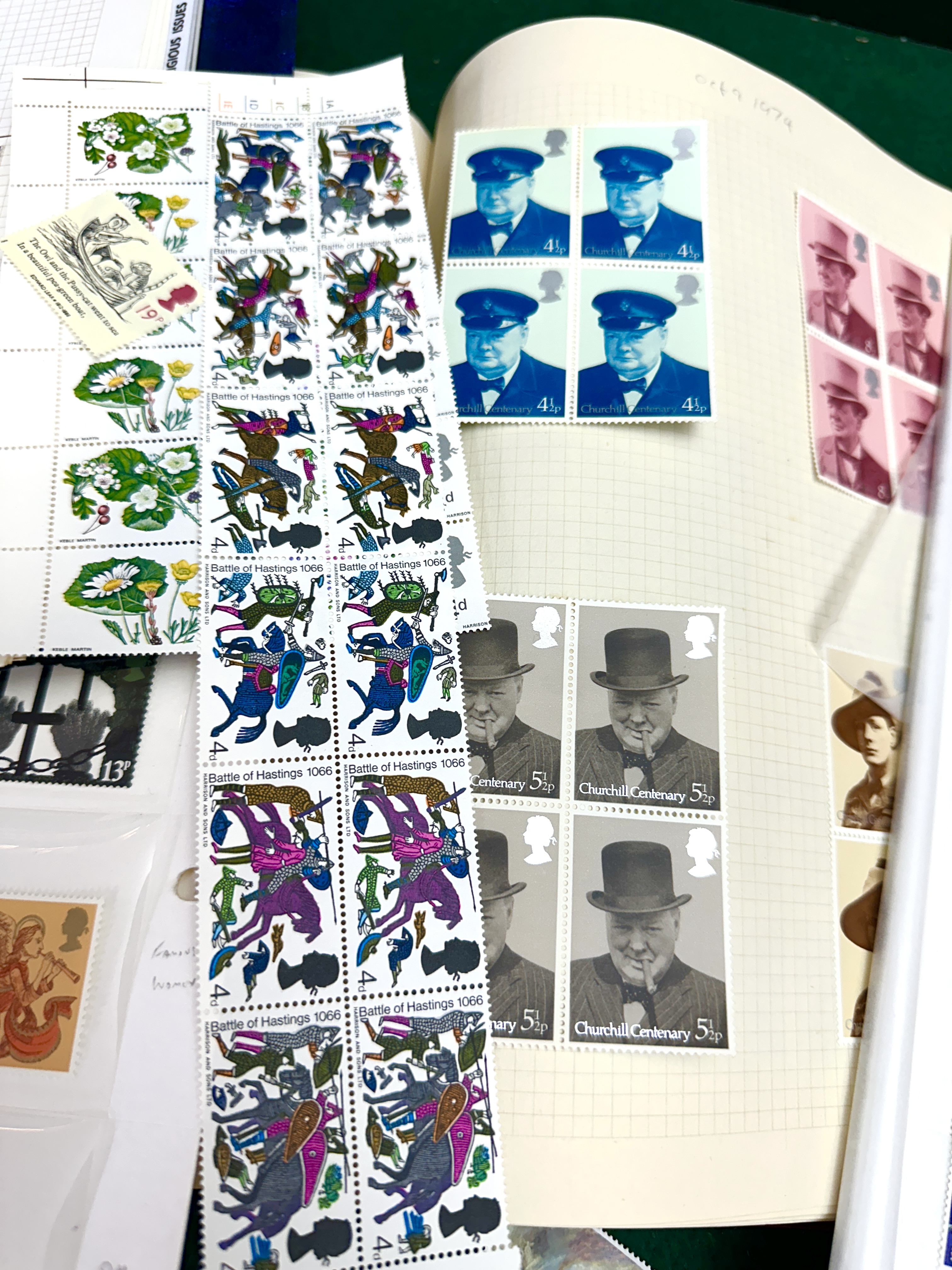 A collection of primarily British and Commonwealth postage stamps dating from the mid-to-late 20th century. The lot comprises multiple albums, loose sheets, and blocks, many in mint, uncancelled condition. Notable commemorative issues include the 1966 Battle of Hastings, the 1974 Winston Churchill Centenary, and the 1966 World Cup. Thematic sets cover British technology such as the SR N6 Hovercraft and Nuclear power, as well as wildlife, the European Free Trade Association (EFTA), and various Christmas issues. Geographical representation includes Great Britain, Australia, and Jersey. Many sheets bear the printer mark Harrison and Sons Ltd. One album page includes a handwritten date of Oct 9 1974. The stamps are presented in ring-bound albums and on black card mounts with various price notations.