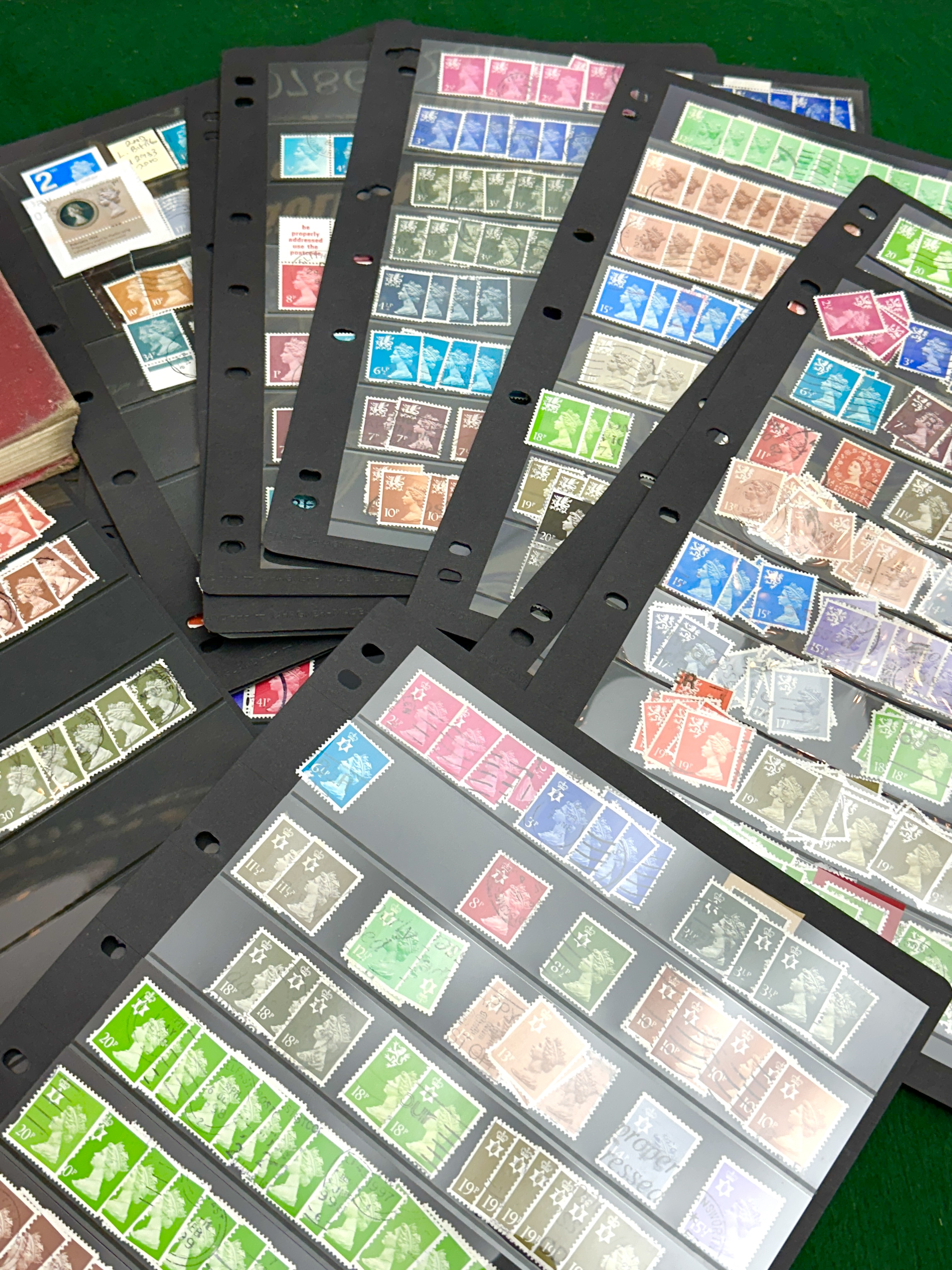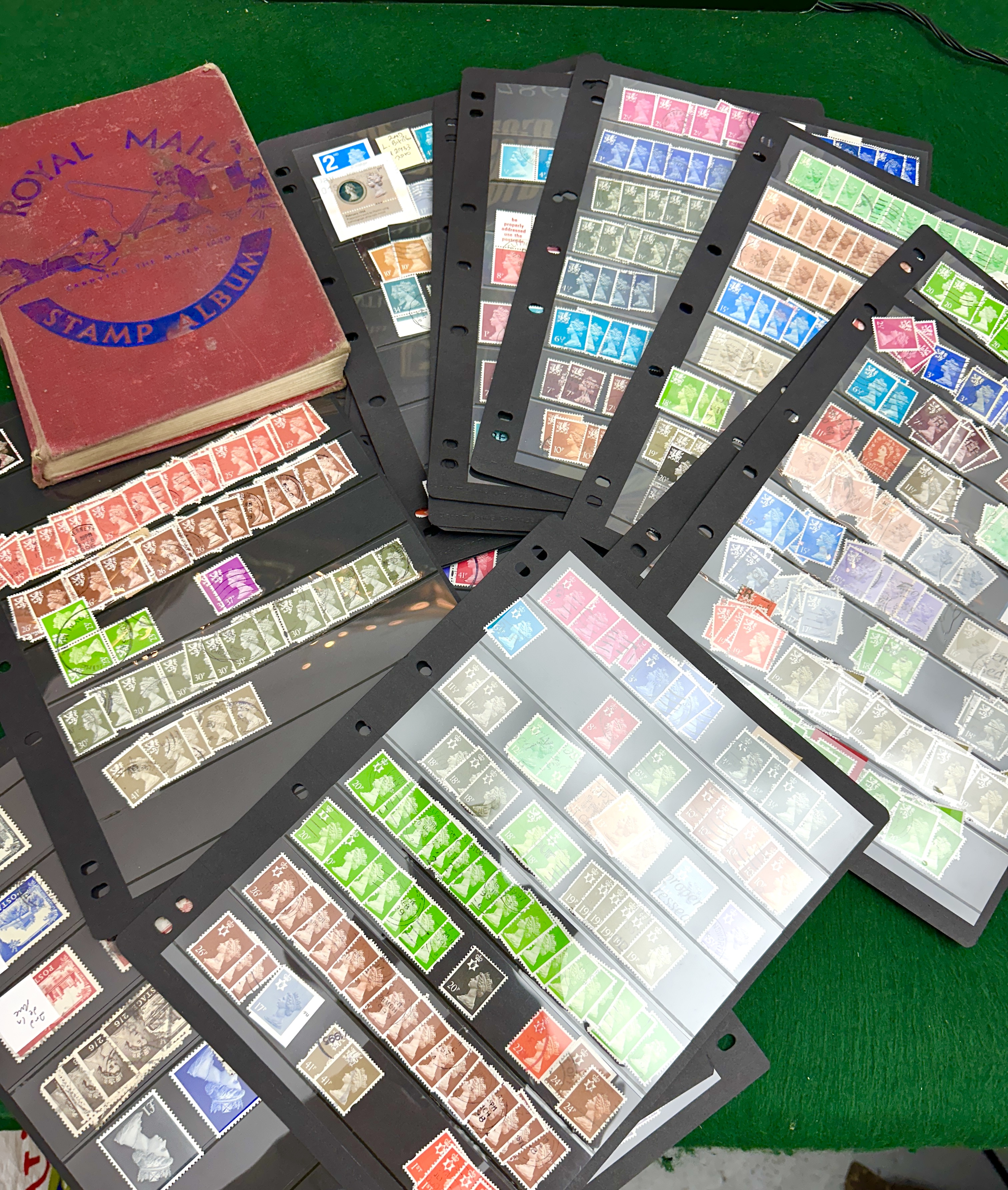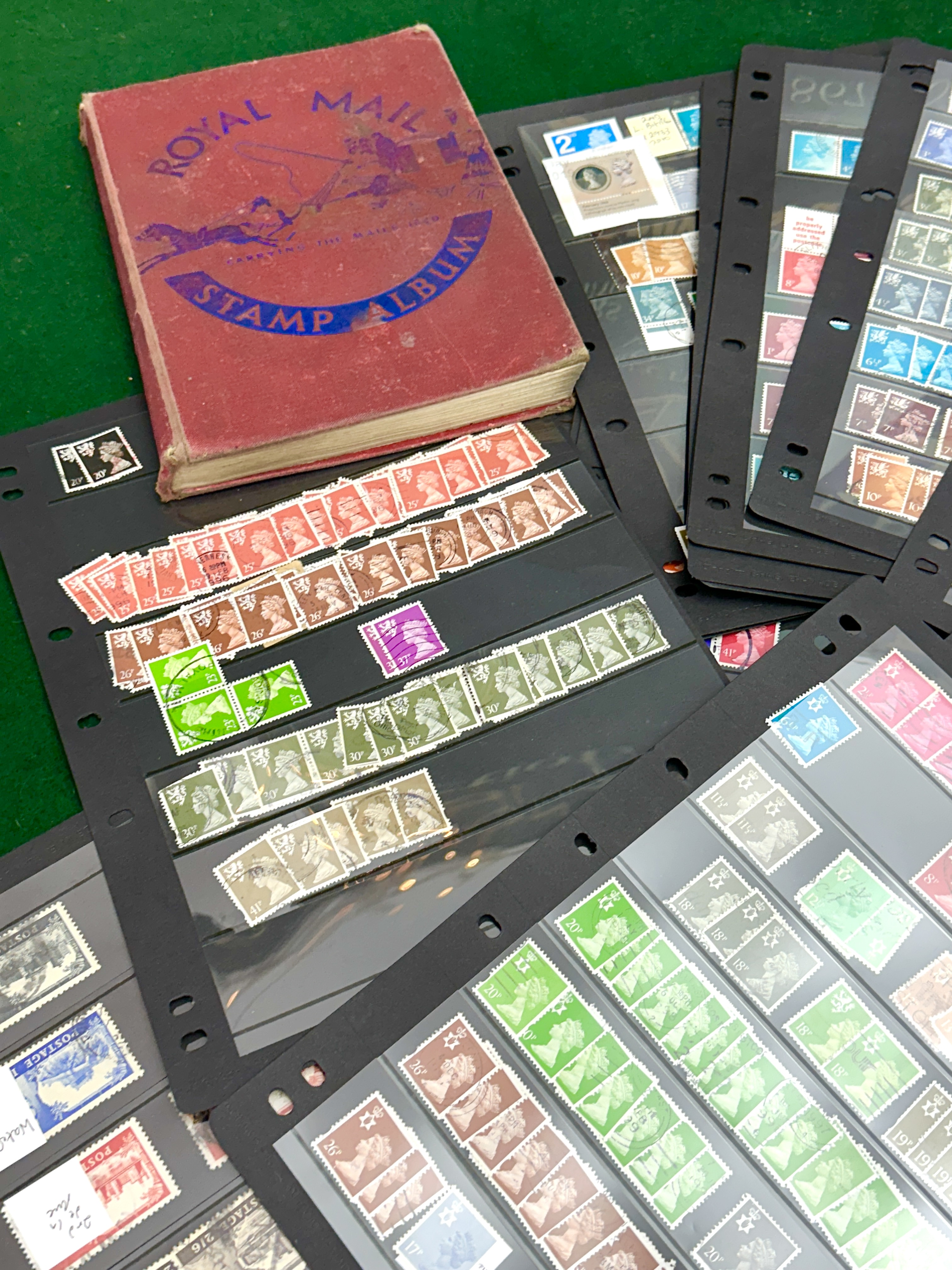 A collection of British postage stamps primarily comprising the Machin definitive series depicting the profile of Queen Elizabeth II. The assortment includes a variety of denominations in both pre-decimal and decimal values, presented in a range of colours. The stamps are organised across multiple black plastic Lighthouse VARIO stock sheets and include both mint and postmarked examples. The lot is accompanied by a vintage Royal Mail Stamp Album featuring a red cloth-bound cover with a printed illustration titled Carrying the Mail 1790.