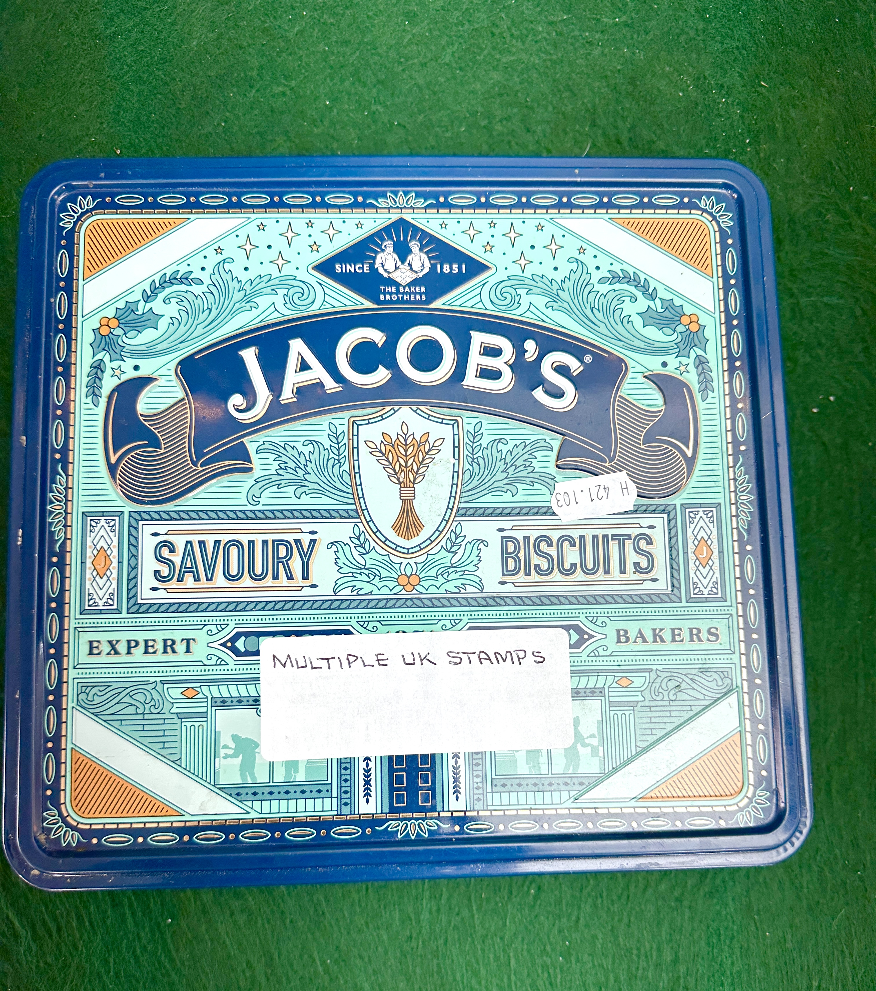This collection consists of a large quantity of used United Kingdom postage stamps, primarily dating from the mid-20th century. The stamps are housed within a rectangular metal Jacob’s Savoury Biscuits tin featuring blue and teal decorative graphics and the branding for The Baker Brothers. The stamps include various commemorative and definitive issues, many with pre-decimal denominations of 4d and 5d. Identifiable subjects include a radar installation, the Declaration of Arbroath 1320, a Happy Christmas design, and the silhouette of Queen Elizabeth II. The stamps are largely off-paper, though some retain paper remnants. The tin lid bears a white adhesive label with the handwritten text MULTIPLE UK STAMPS.
