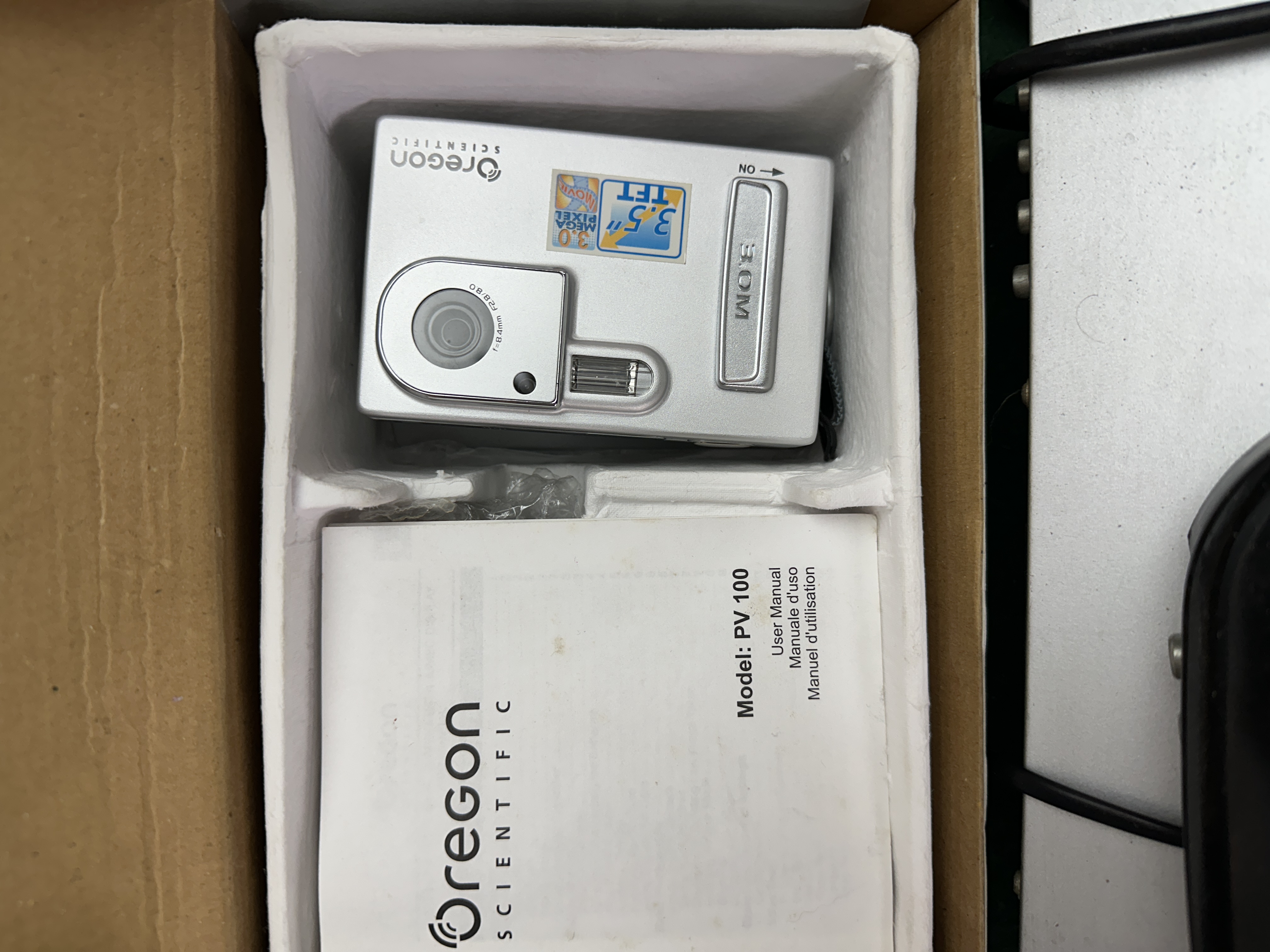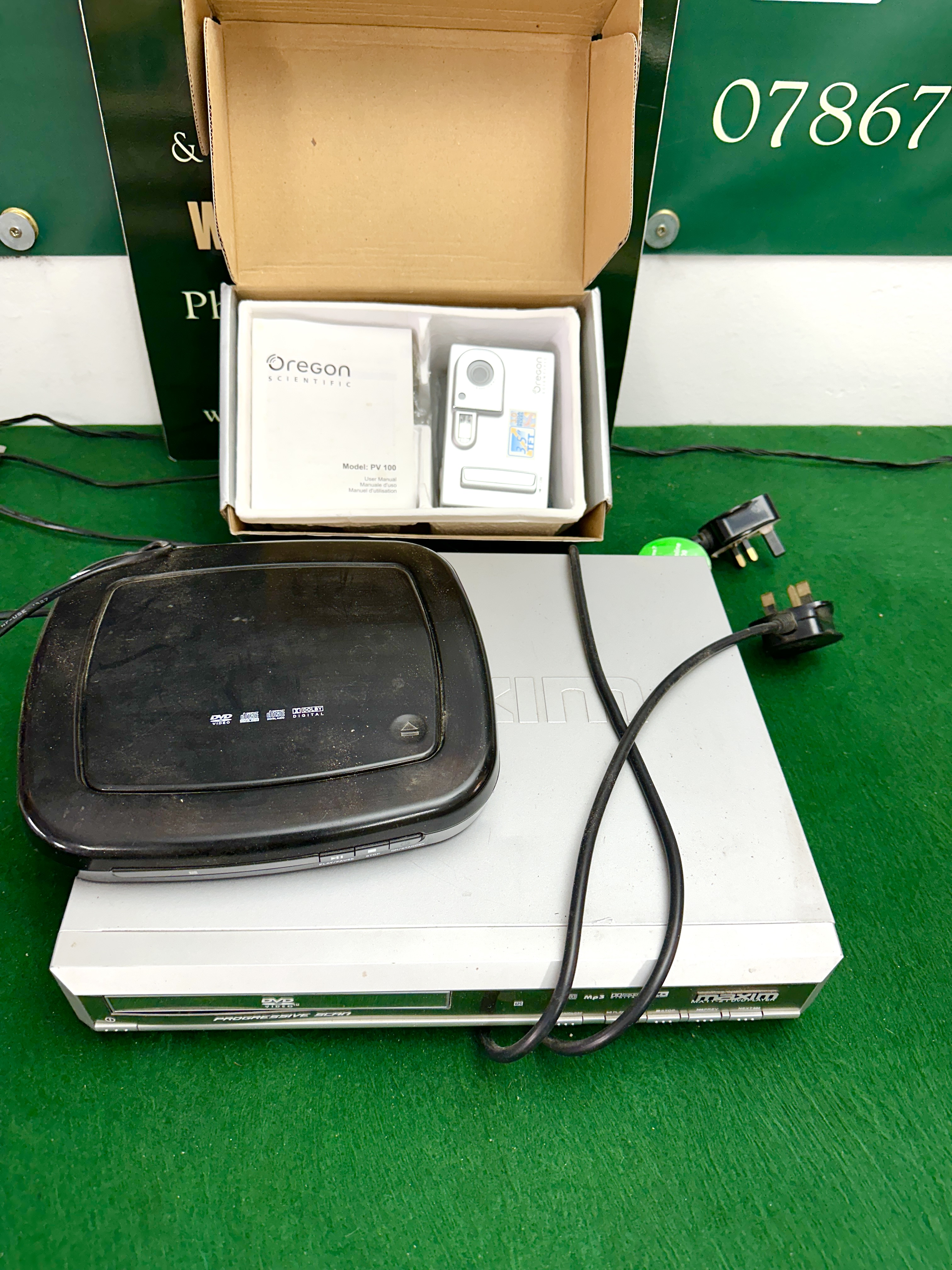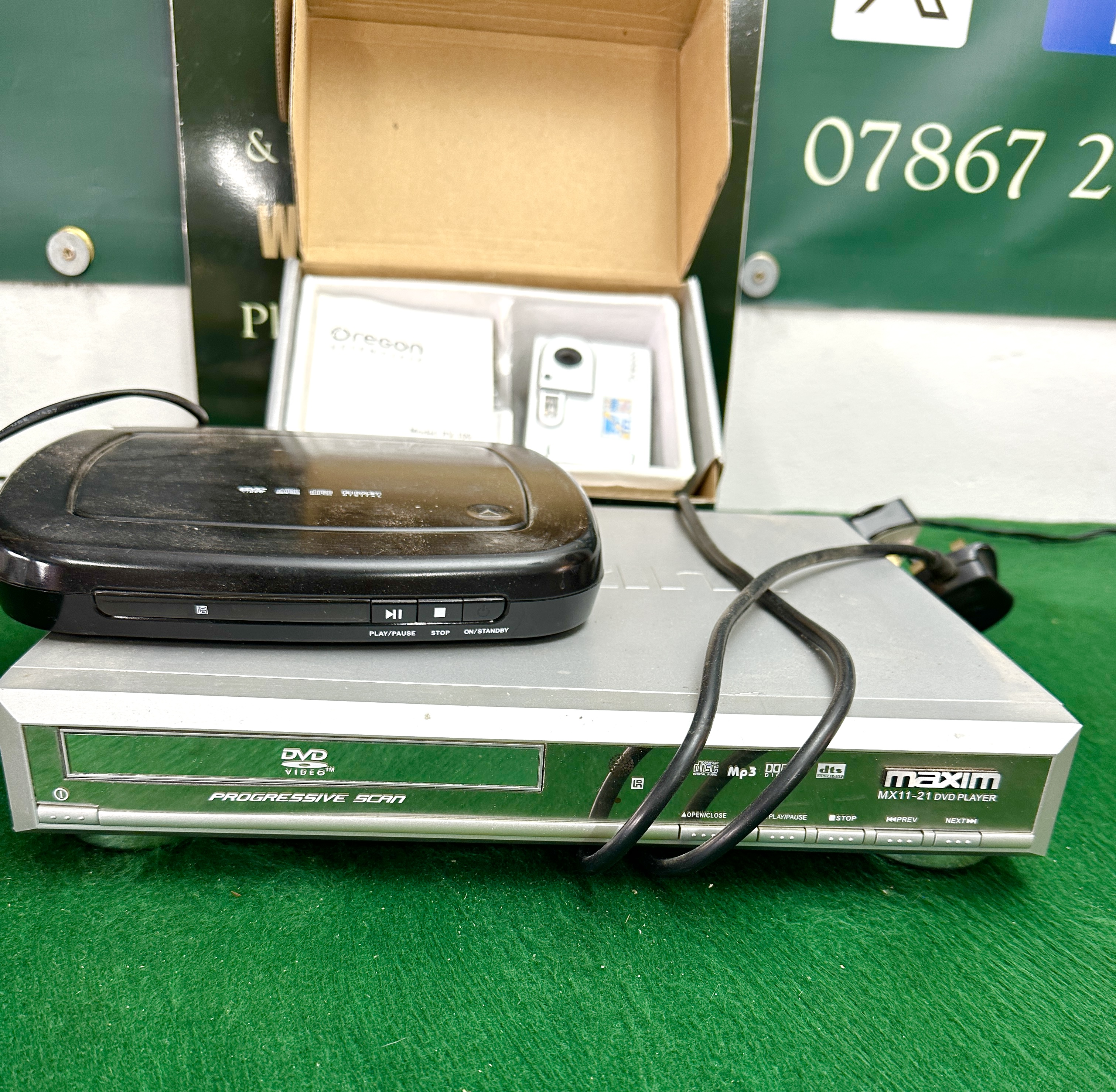 A collection of consumer electronics featuring a silver Maxim MX11-21 home DVD player and a black ASDA portable DVD player. The Maxim unit is constructed with a silver-tone finish and features progressive scan, MP3, and DTS digital out capabilities. The portable DVD player is finished in black plastic and includes standard playback controls. The group further includes an Oregon Scientific PV 100 digital camera, a 3.0-megapixel device with a 1.5-inch TFT screen, housed in its original cardboard box with a multilingual user manual. The collection is completed by various black power cables with standard UK three-pin plugs.