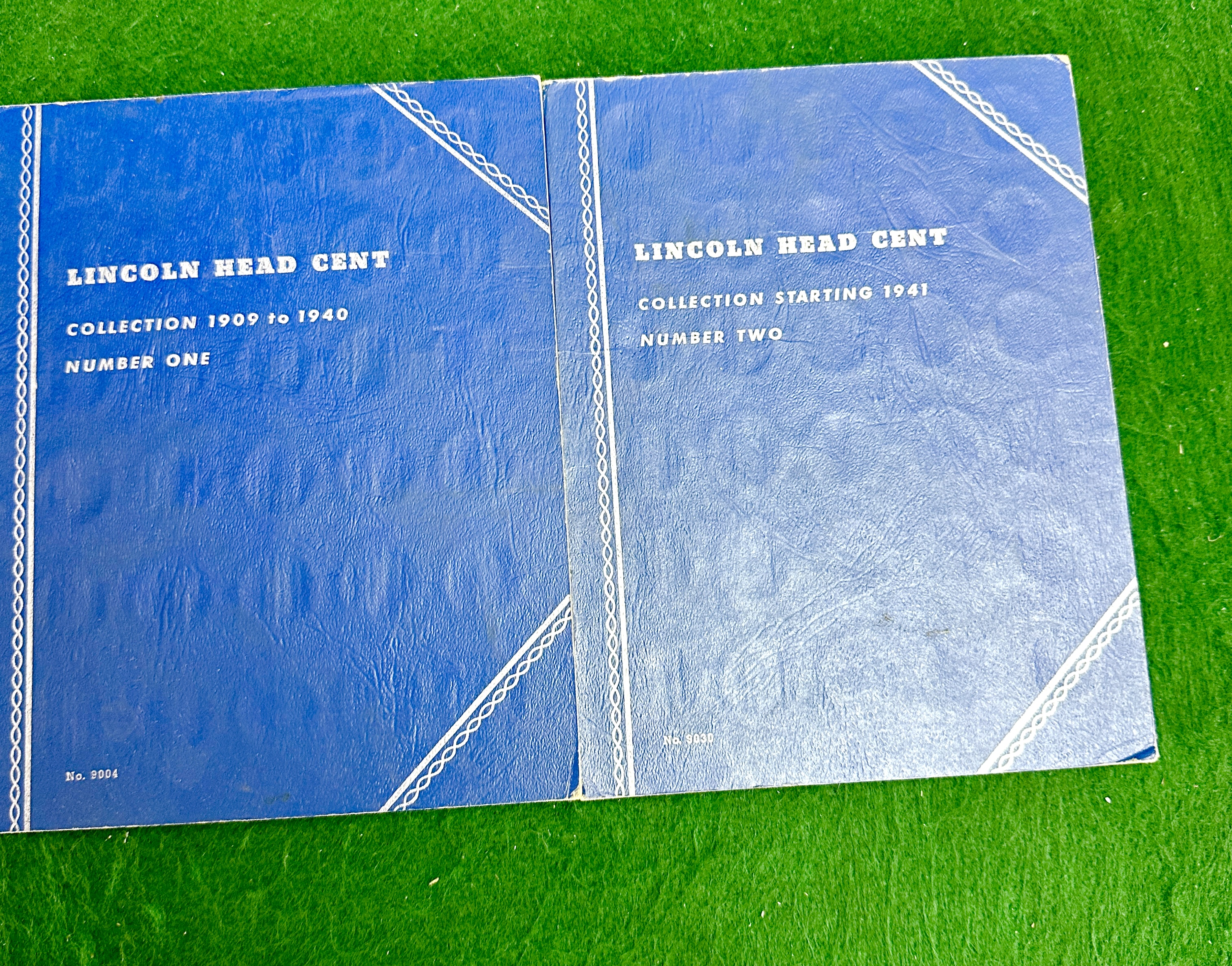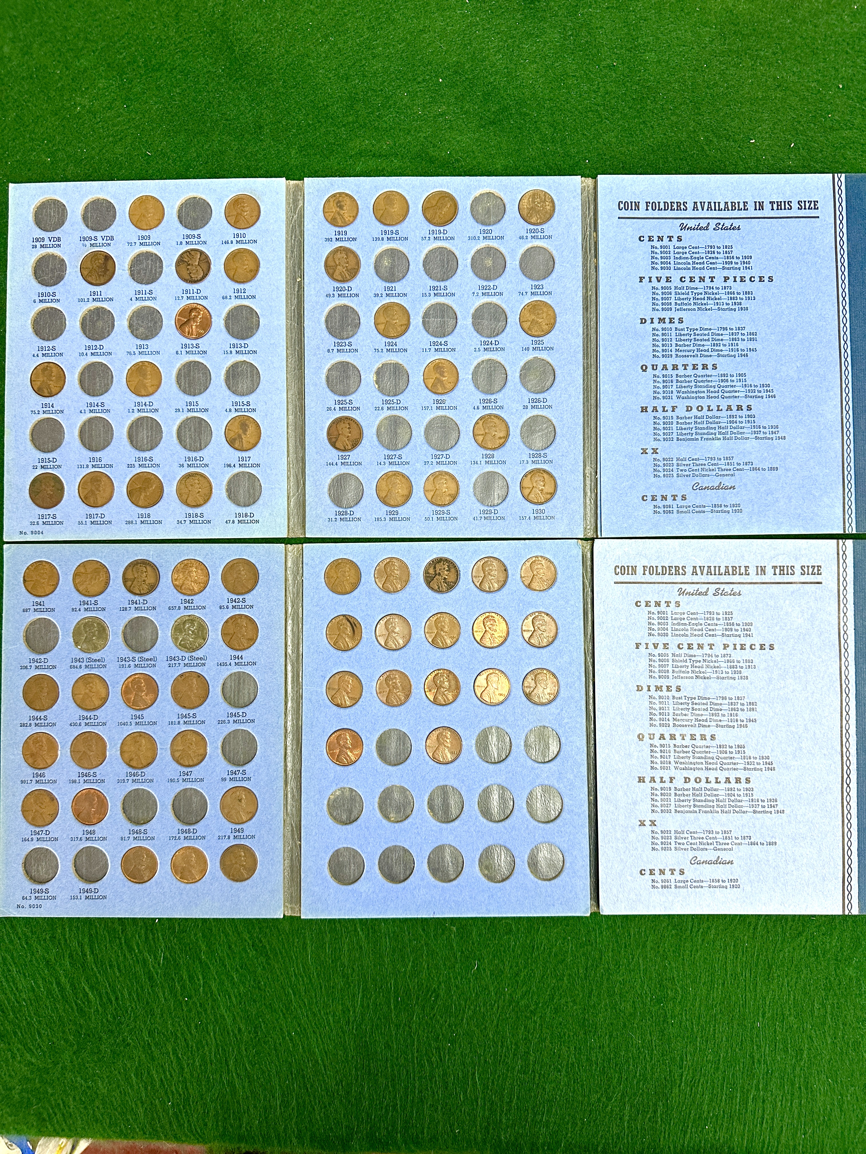 A pair of Whitman coin collection folders for United States Lincoln Head cents. The group includes Folder Number One (No. 9004) covering the years 1909 to 1940 and Folder Number Two (No. 9030) starting from 1941. Each folder is constructed from textured blue cardboard with white printed titles and decorative borders. The interior panels feature circular cutouts for specific dates and mint marks, accompanied by printed mintage figures. The folders are partially populated with various Lincoln cents in copper, bronze, and steel compositions, including 1943 steel cents. The reverse interior panels contain a printed catalogue of other available coin folder sizes and denominations for United States and Canadian coinage.