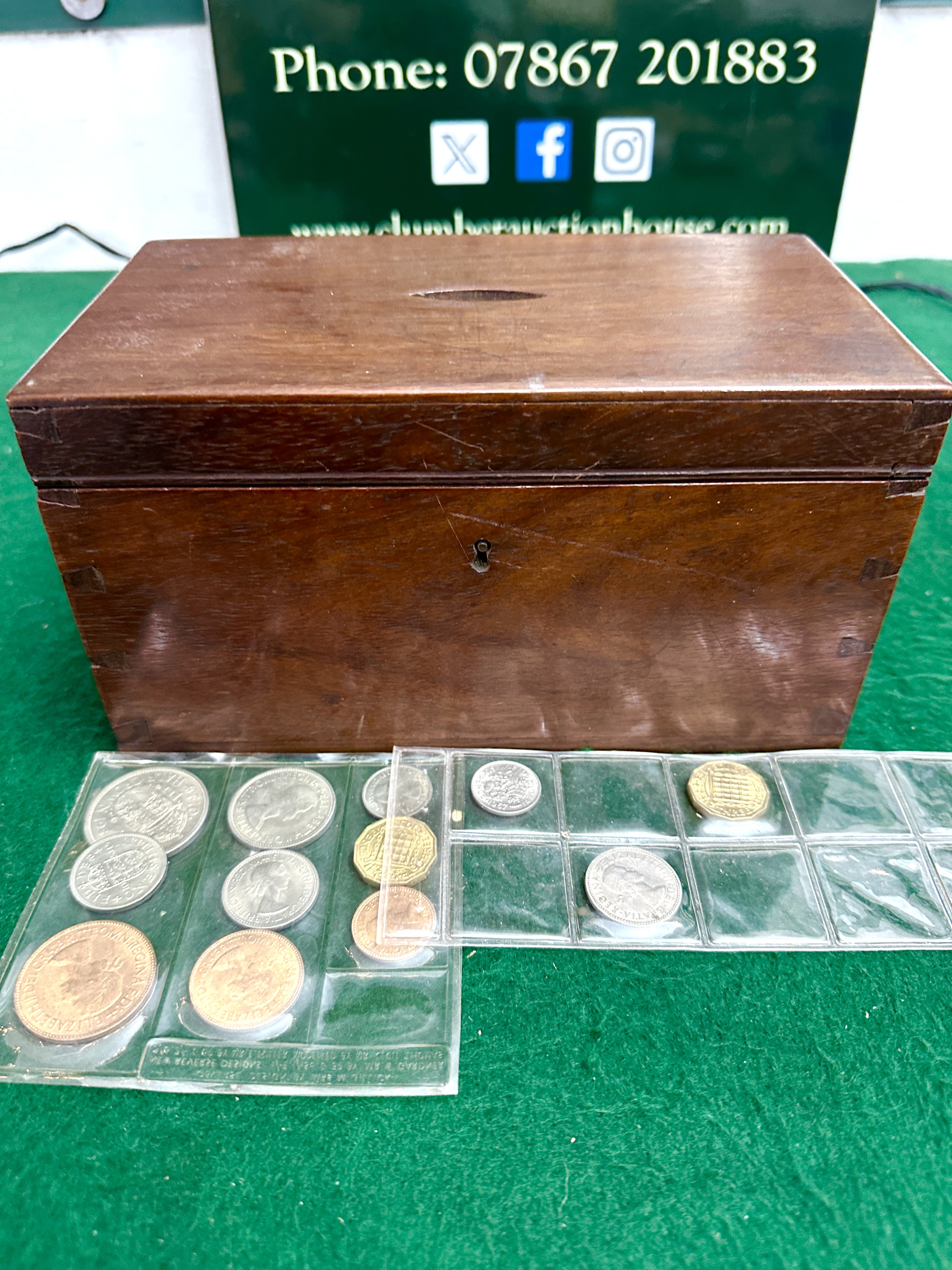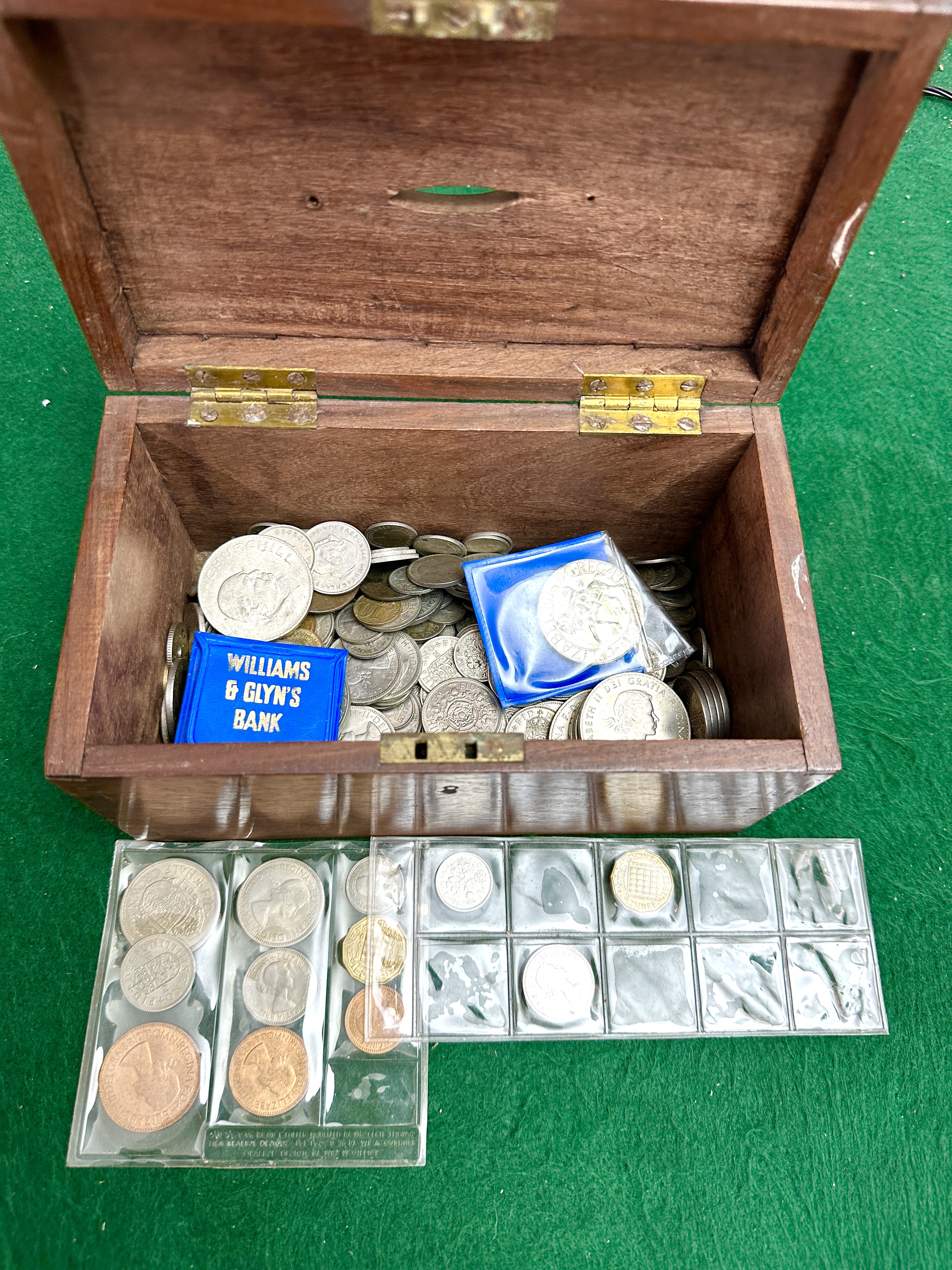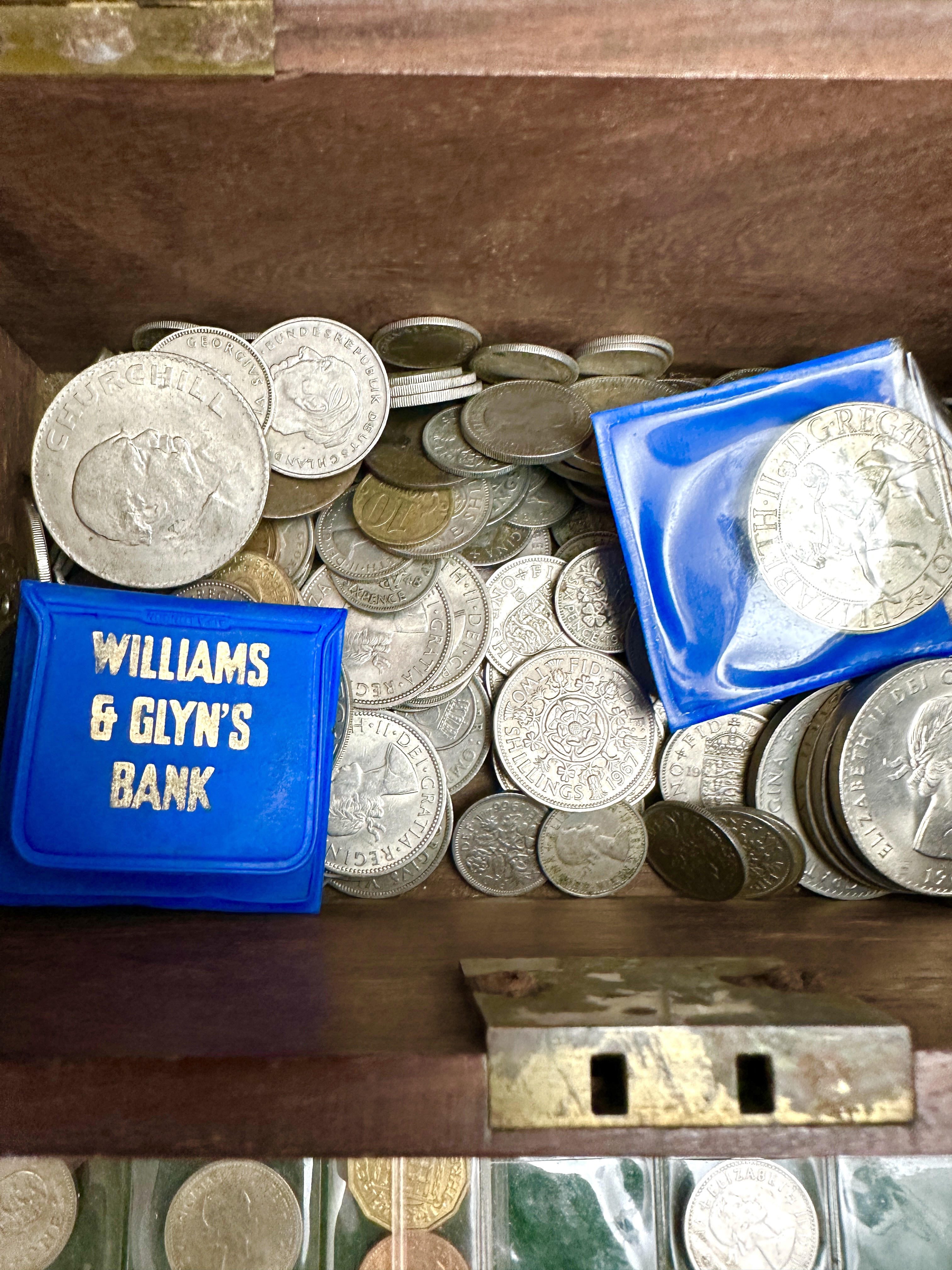 An assortment of British and international coinage housed in a rectangular wooden money box. The box is constructed with dovetail joints and features a coin slot on the lid, brass hinges, and a front lock plate. The collection includes British pre-decimal denominations such as shillings and sixpences, alongside Churchill commemorative crowns. Notable pieces include a German coin marked Bundesrepublik Deutschland and various coins featuring the portraits of King George VI and Queen Elizabeth II. Some coins are presented in clear plastic collector sleeves, and the lot includes a blue plastic coin pouch bearing the gilt inscription Williams & Glyn’s Bank. The coinage comprises both silver-coloured and copper-alloy pieces in various states of circulation.