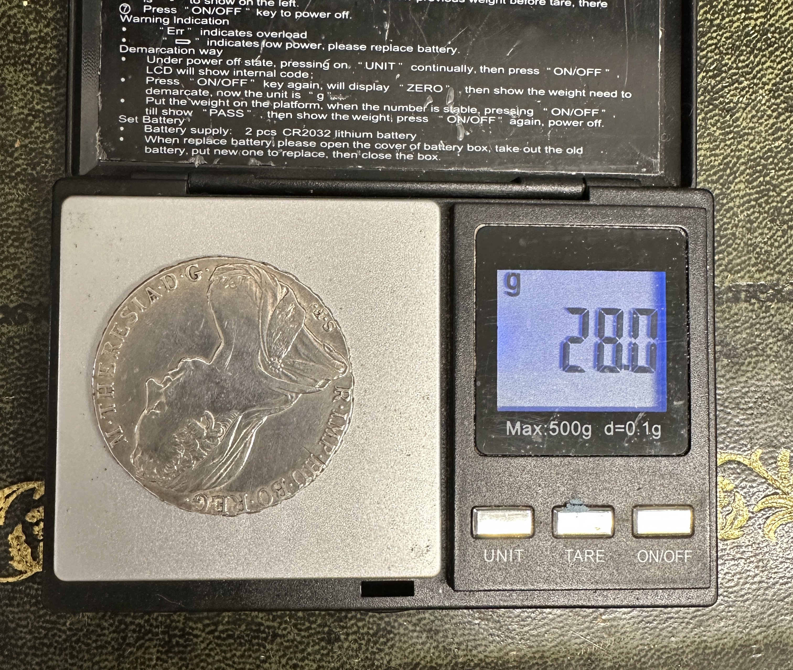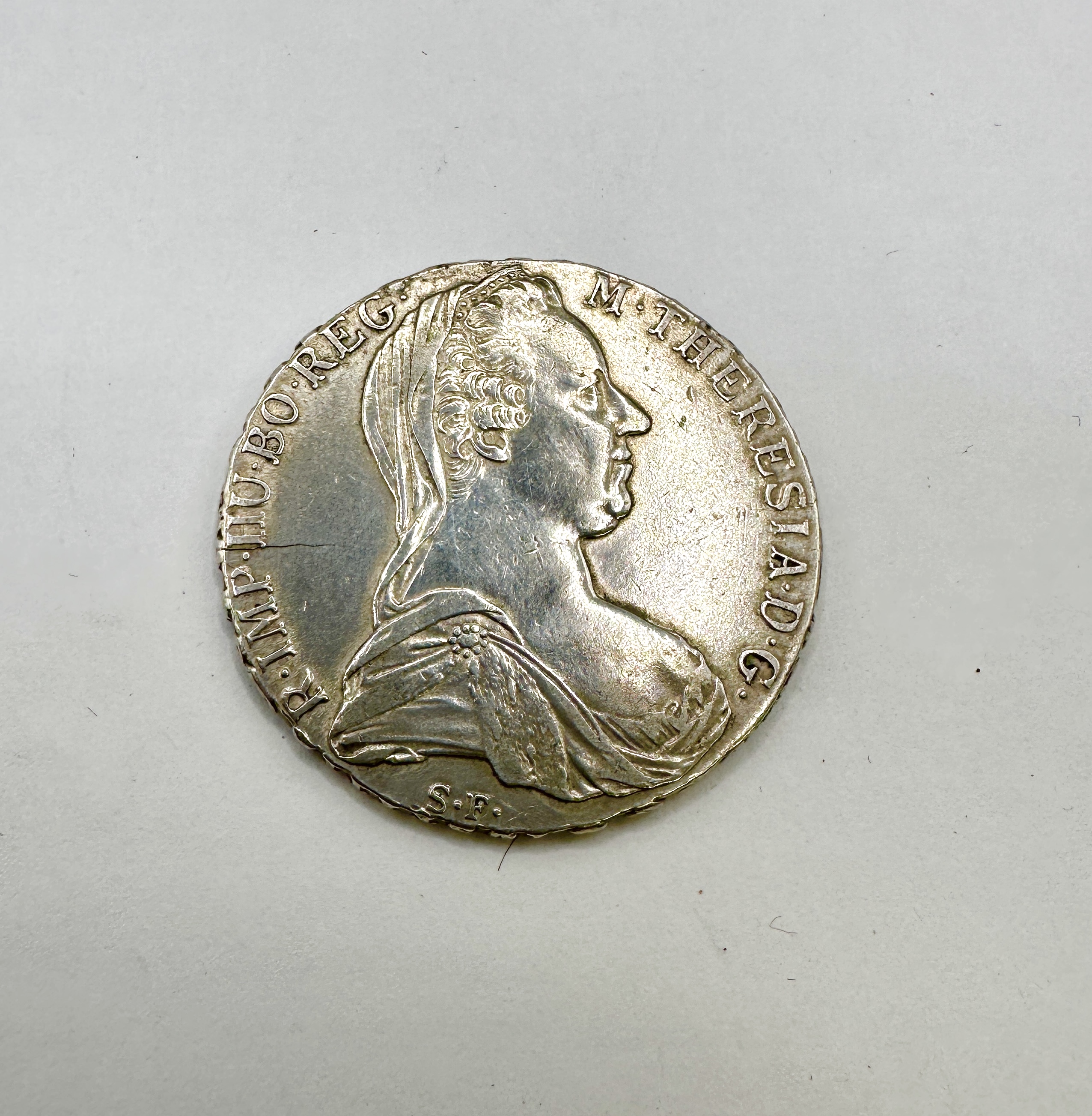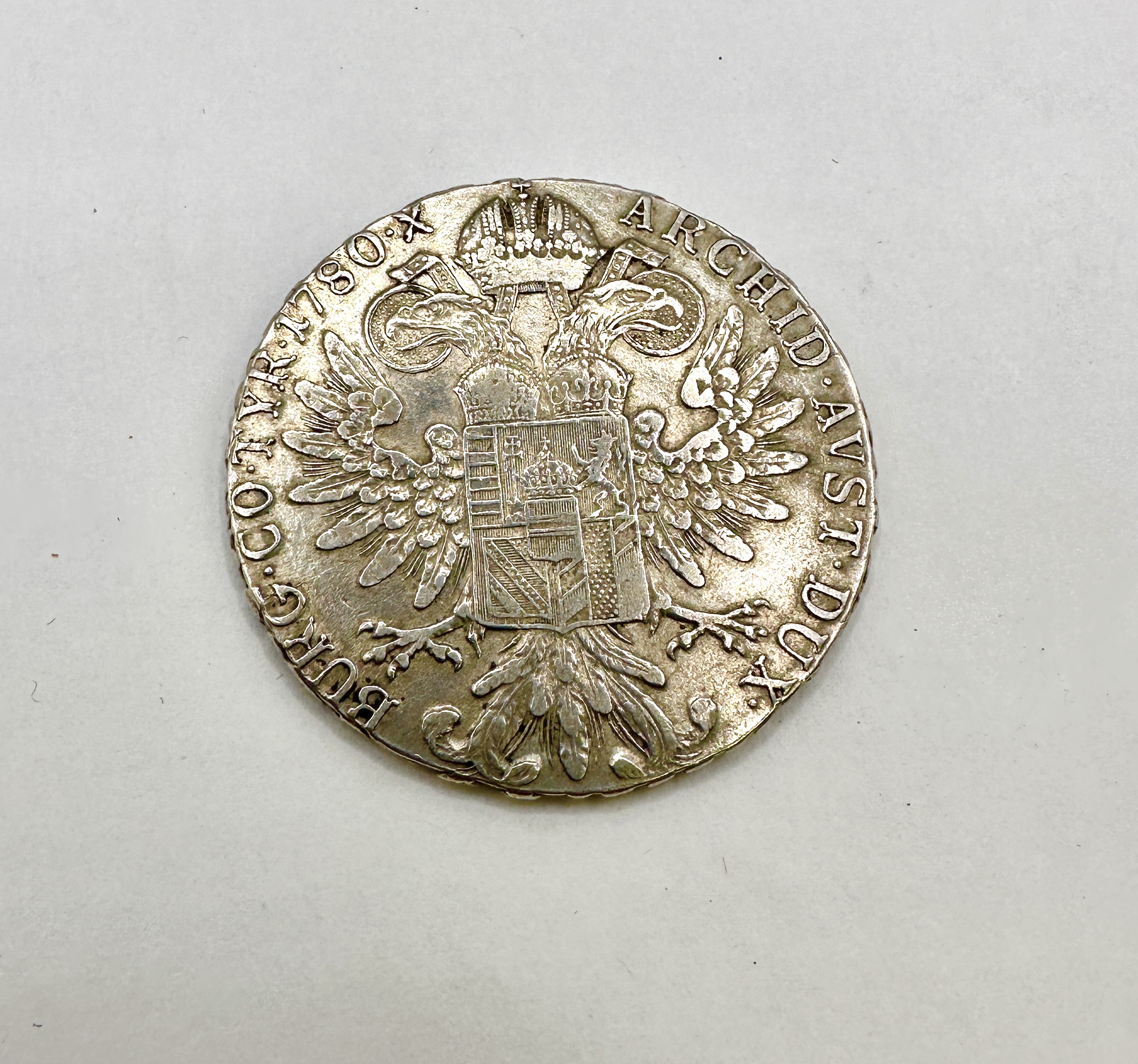 This Austrian Maria Theresa Thaler silver coin restrike is dated 1780. The obverse features a right-profile bust of the Empress Maria Theresa, surrounded by the Latin inscription M. THERESIA D. G. R. IMP. HU. BO. REG. with the initials S.F. positioned below the portrait. The reverse depicts the double-headed Habsburg eagle with a central coat of arms, bearing the inscription ARCHID. AVST. DUX BURG. CO. TYR. 1780. X.