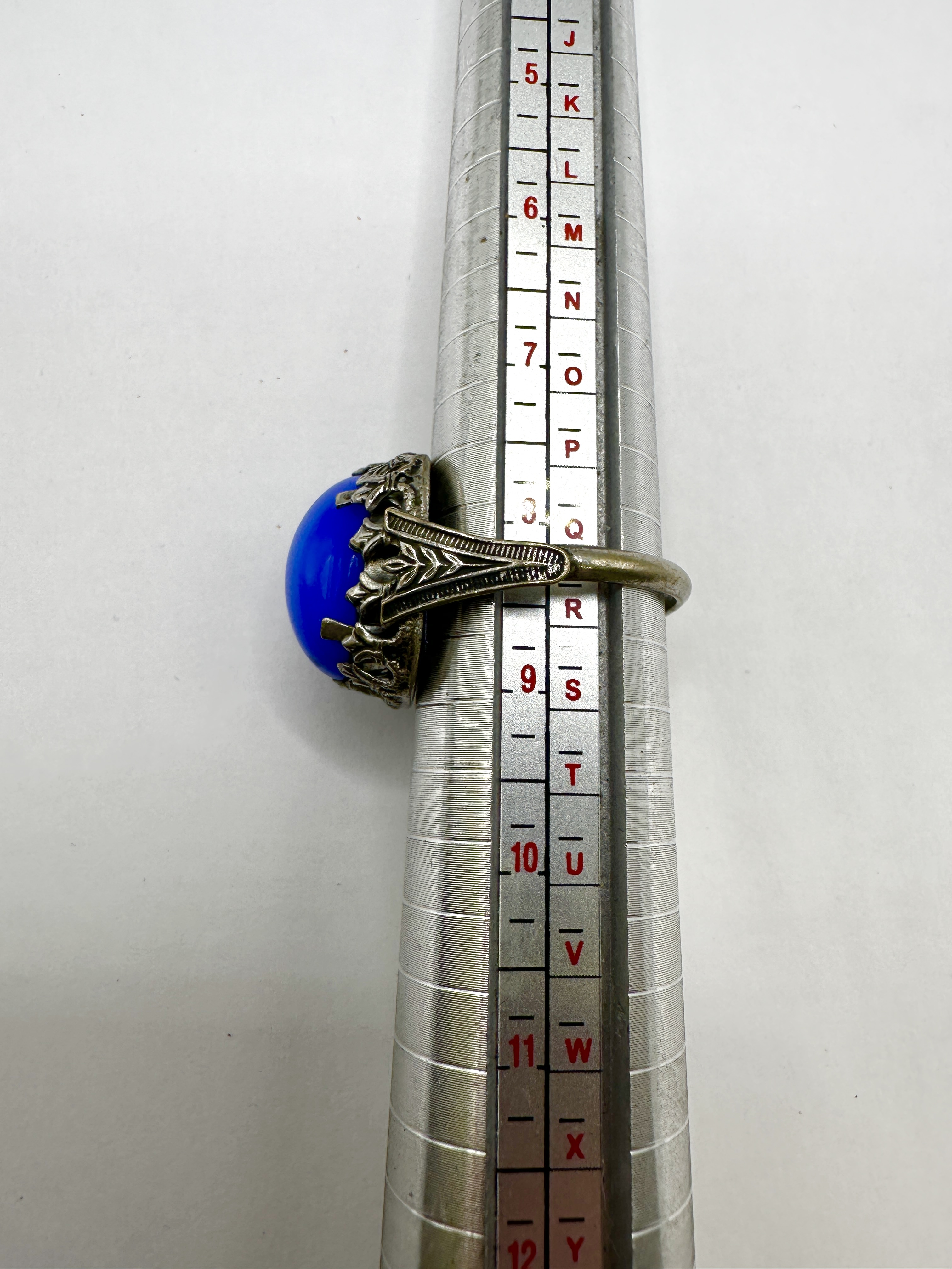 A vintage-style statement ring featuring a large, oval, cobalt blue cabochon, likely glass or a synthetic material. The stone is secured within an ornate, silver-tone metal mounting. The decorative setting exhibits detailed openwork and foliate-inspired patterns on the shoulders and bezel, characteristic of Art Deco-inspired styling. No hallmarks or maker’s marks are visible on the exterior or interior of the band.