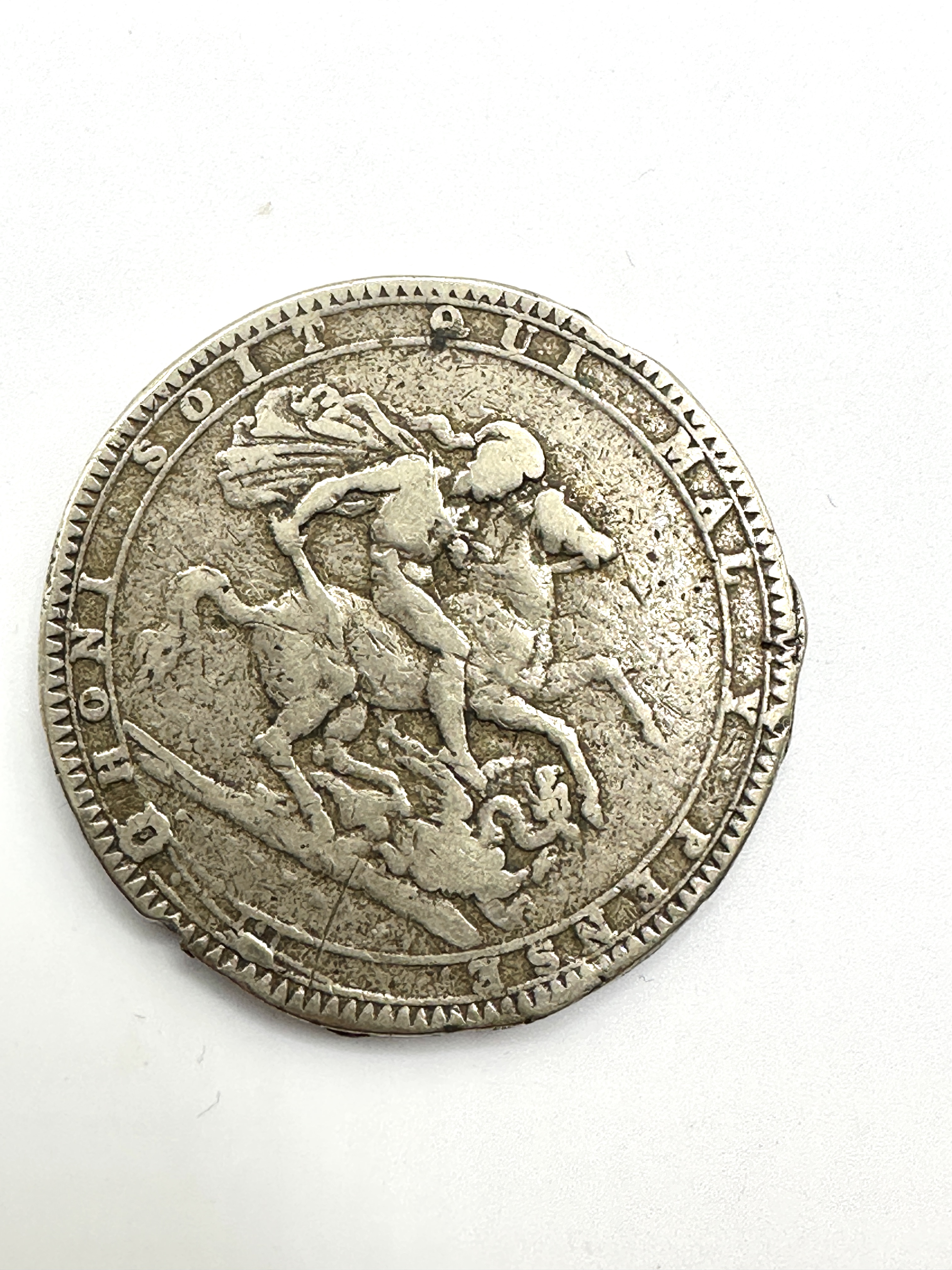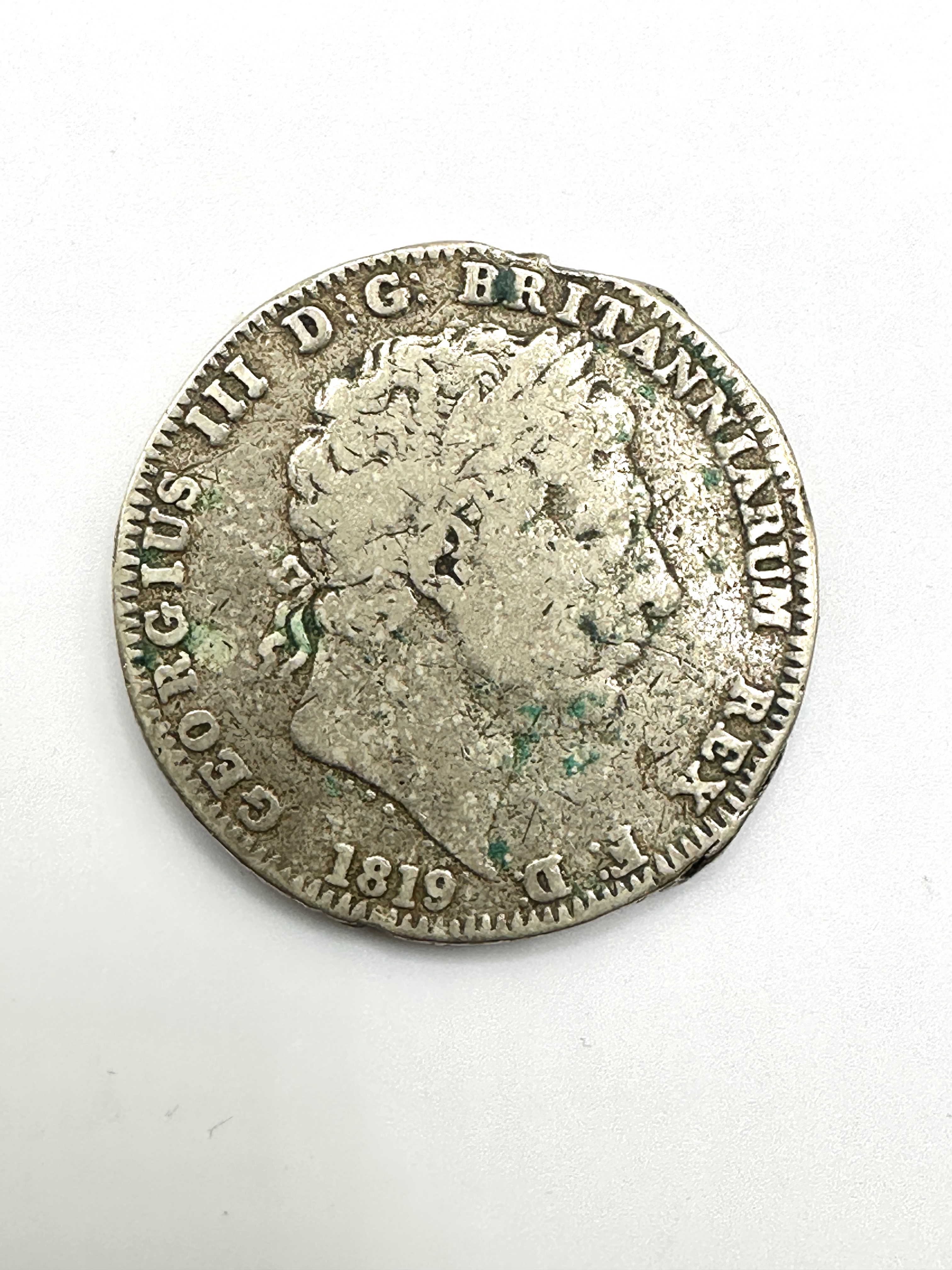 A single British milled coinage piece identified as an 1819 George III Silver Crown. The coin is dated 1819, corresponding to the final year of King George III’s reign. The obverse features a right-facing portrait of the King, surrounded by the legend GEORGIUS III D G BRITANNIARUM REX, with the date 1819 displayed below. The reverse depicts the classic design of St George slaying the Dragon, encircled by the partial motto HONI SOIT QUI MAL Y PENSE. The coin is constructed from silver or a silver-coloured base metal.